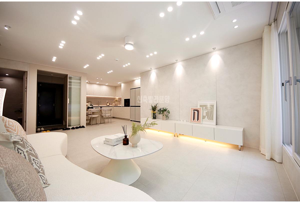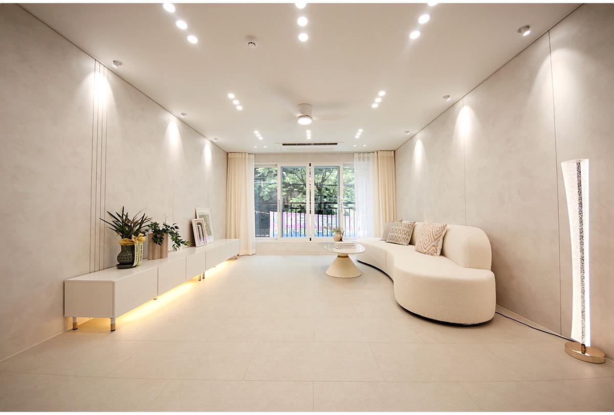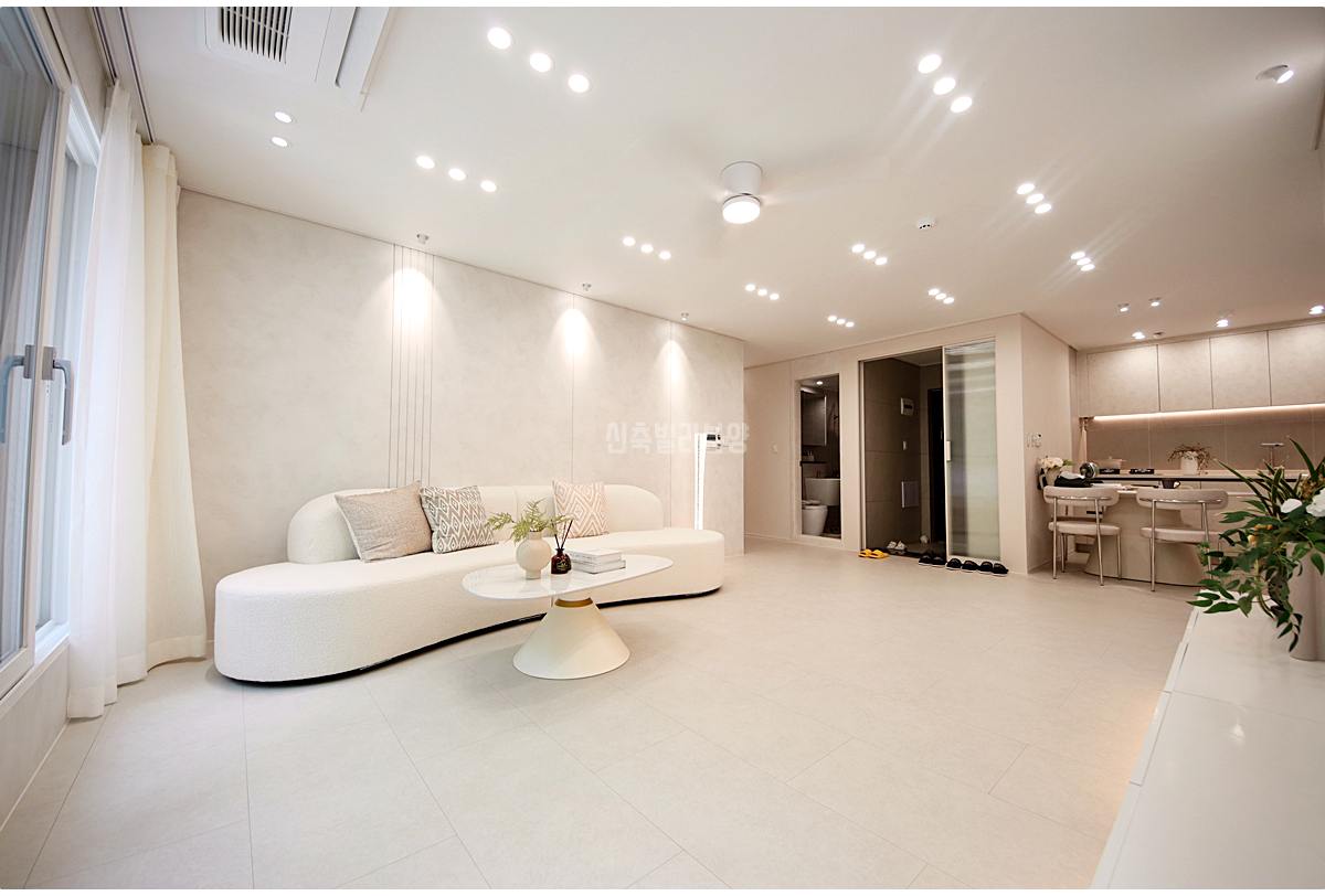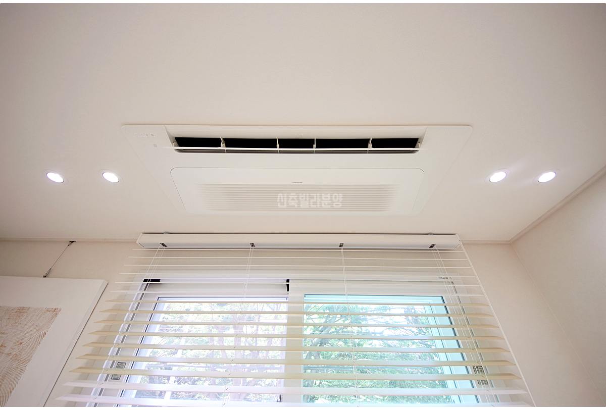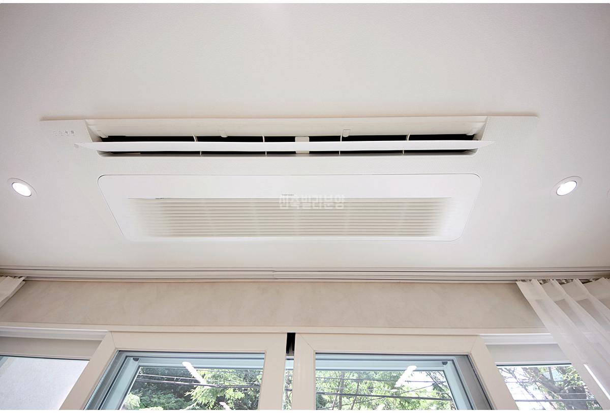 공간이 넉넉하여 5~6인용 소파를 배치해도 여유가 있고, TV 시청 거리도 충분히 확보됩니다. 천장에는 시스템 냉방 장치와 실링팬이 함께 설치되어 있어 여름철에도 시원하게 지낼 수 있습니다.