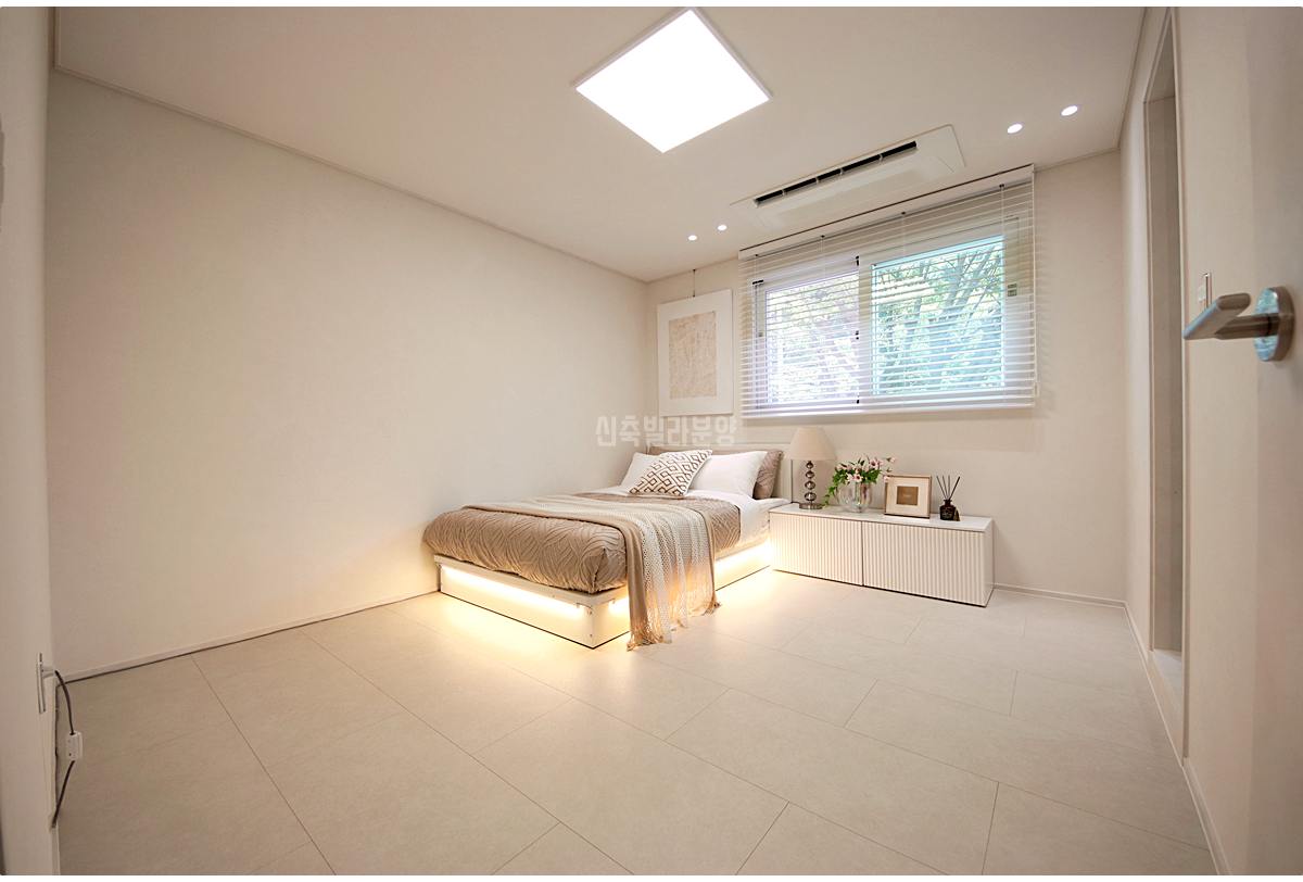 안산신축빌라 침실은 넓은 면적을 자랑합니다. 창을 통해 메인 룸과 동일한 전망을 즐길 수 있으며, 붙박이장을 설치하고 침대를 놓아도 충분한 여유 공간이 확보됩니다. 메인 룸에는 전용 화장실도 마련되어 있어 프라이버시가 보장됩니다.
