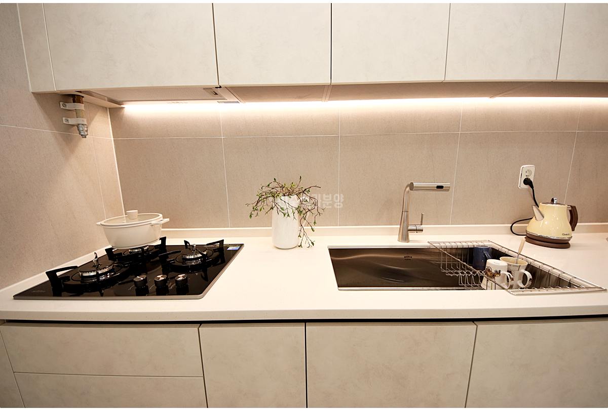 사각형 싱크볼, 가스 조리대, 광파오븐, 냉장고가 모두 기본으로 갖춰져 있어 별도로 구입할 필요가 없습니다. 상단과 하단에 수납공간이 풍부하게 마련되어 있어 조리 도구와 식기류를 깔끔하게 정리할 수 있습니다. 다만 창문이 없다는 점은 아쉬운 부분입니다.