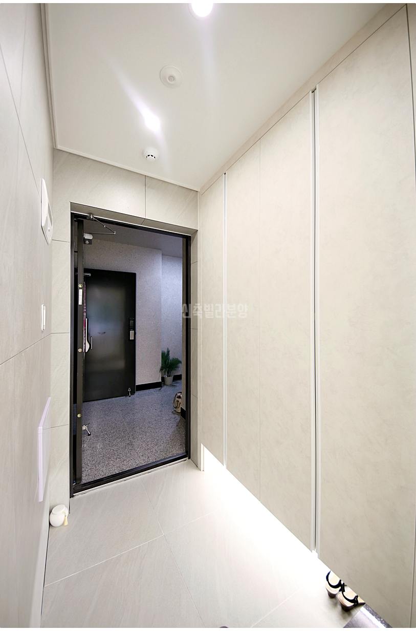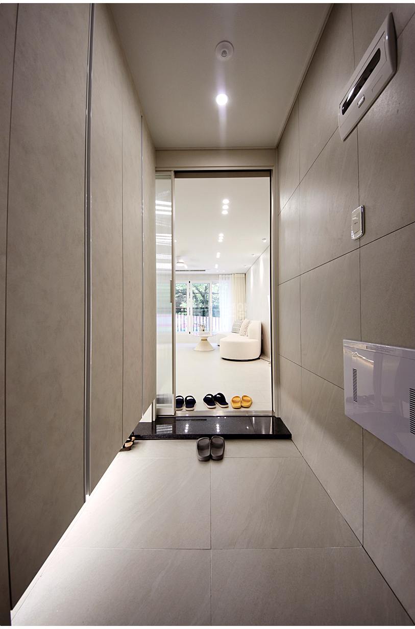 입구 공간은 넓게 설계되어 있습니다. 높은 신발 보관함이 4개 구획으로 나뉘어 있어 가족 구성원들의 신발을 충분히 수납할 수 있습니다. 외출 시 한 번에 모든 조명을 끌 수 있는 통합 스위치가 있어 편리합니다.