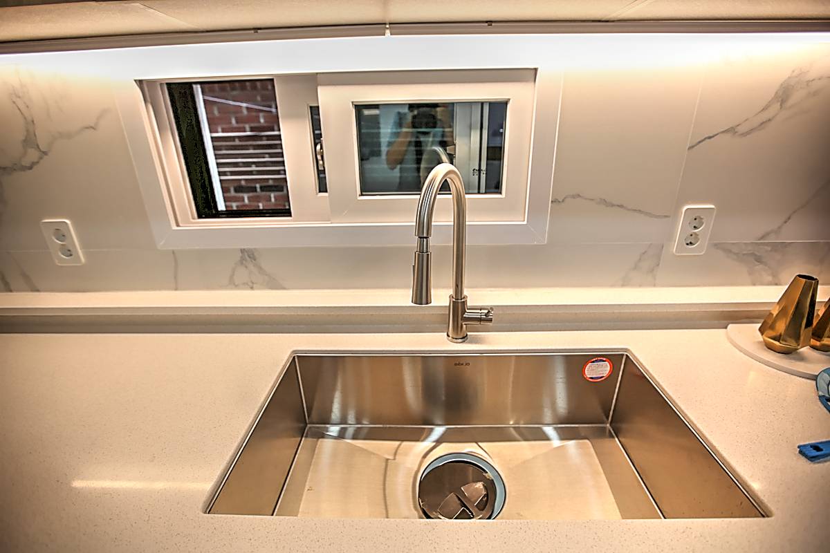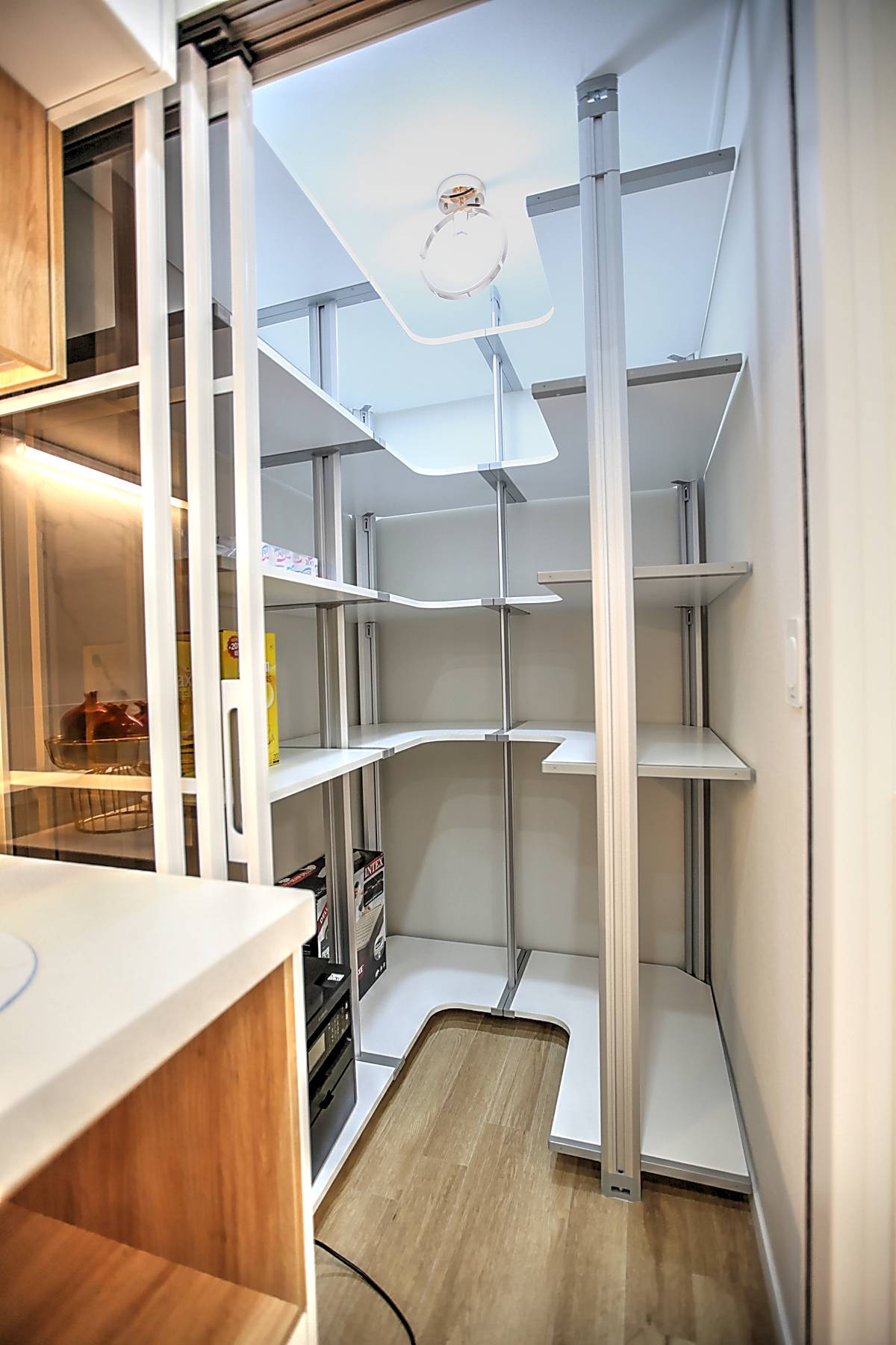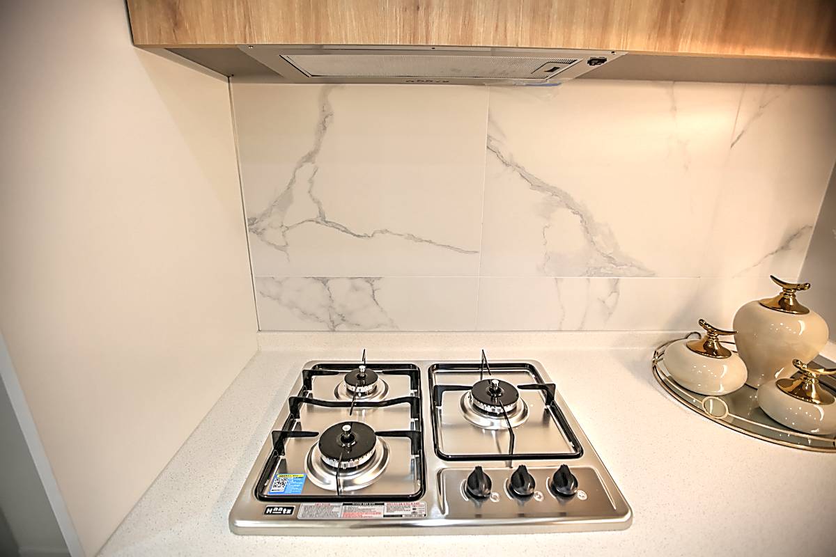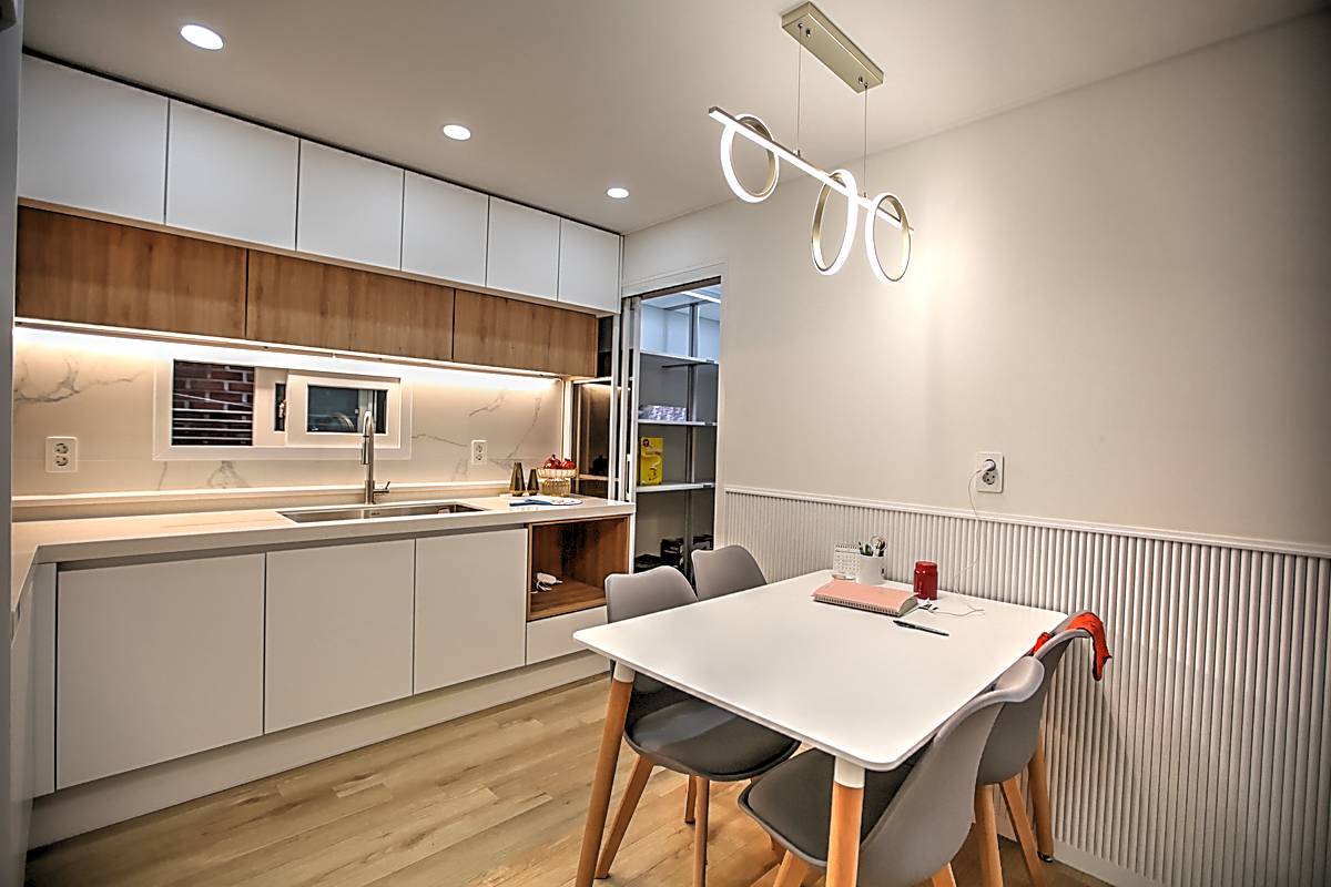 세미 분리형 주방은 기역 자 구조로 동선이 효율적이며, 냉장고 전용 공간이 확보되어 있습니다. 화력 좋은 3구 가스쿡탑과 환풍기가 매립되었고, 최근 선호도 높은 스완수전과 사각싱크볼을 채택해 디테일을 살렸습니다. 전용 환기창이 있어 조리 중 발생하는 냄새를 신속하게 배출할 수 있으며, 개인 식탁 공간도 여유롭습니다. 주방 옆으로 펜트리룸이 마련되어 각종 생활용품 보관이 수월합니다.
