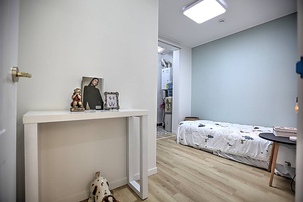 모든 방이 분리 구조로 설계되어 가족 간 프라이버시가 보장됩니다. 안방에는 시스템 에어컨이 장착되어 있으며, 중간방은 환기창과 픽스창이 크게 시공되어 개방감이 우수합니다. 2개의 욕실은 모두 기역 자 구조로 해바라기 샤워기와 함께 샤워 공간이 확보되어 있어 동시간대 외출 준비가 가능합니다. 메인욕실은 프레임 타일, 서브욕실은 템바보드 타일을 적용했으며, 특히 서브욕실은 아치형 문과 건식 세면대로 감각적인 디자인을 완성했습니다.