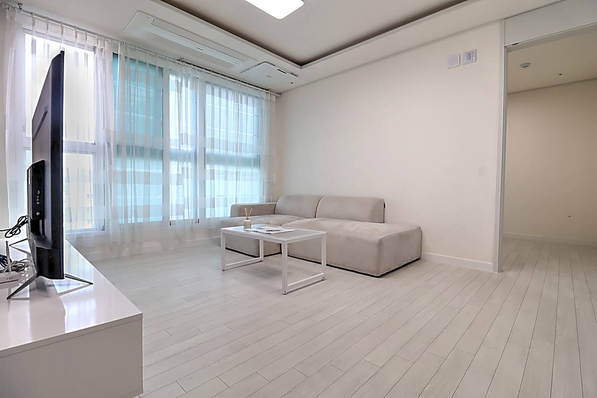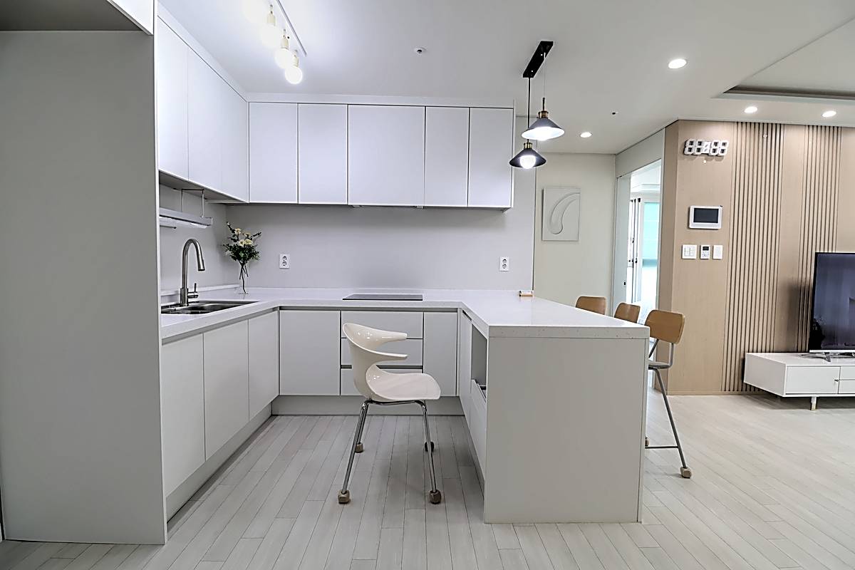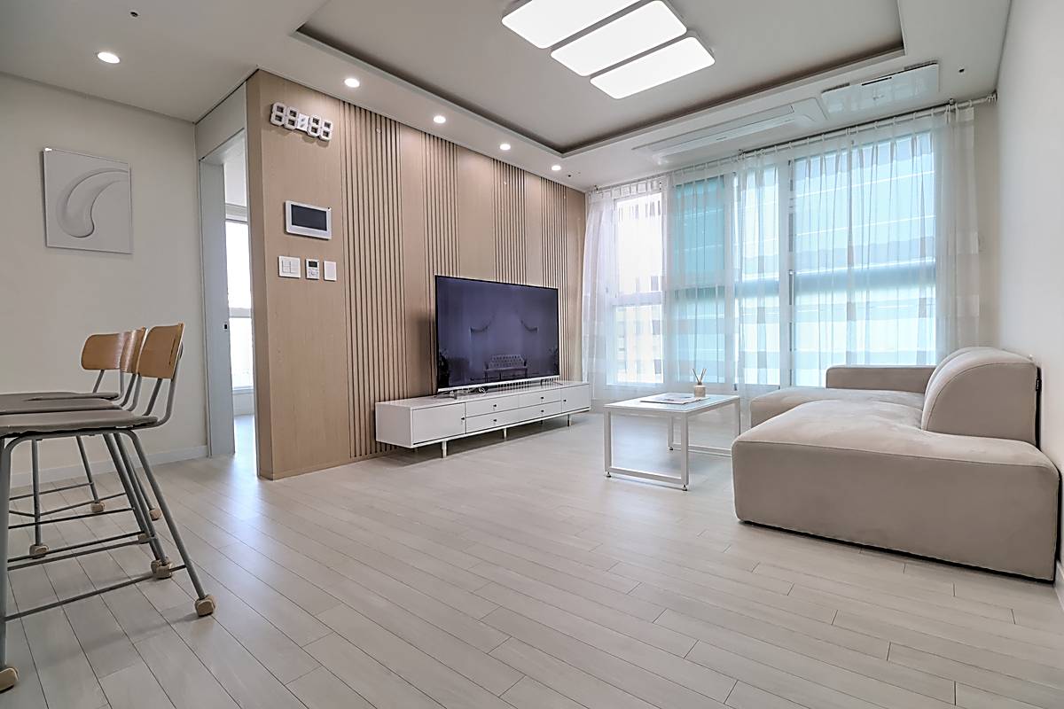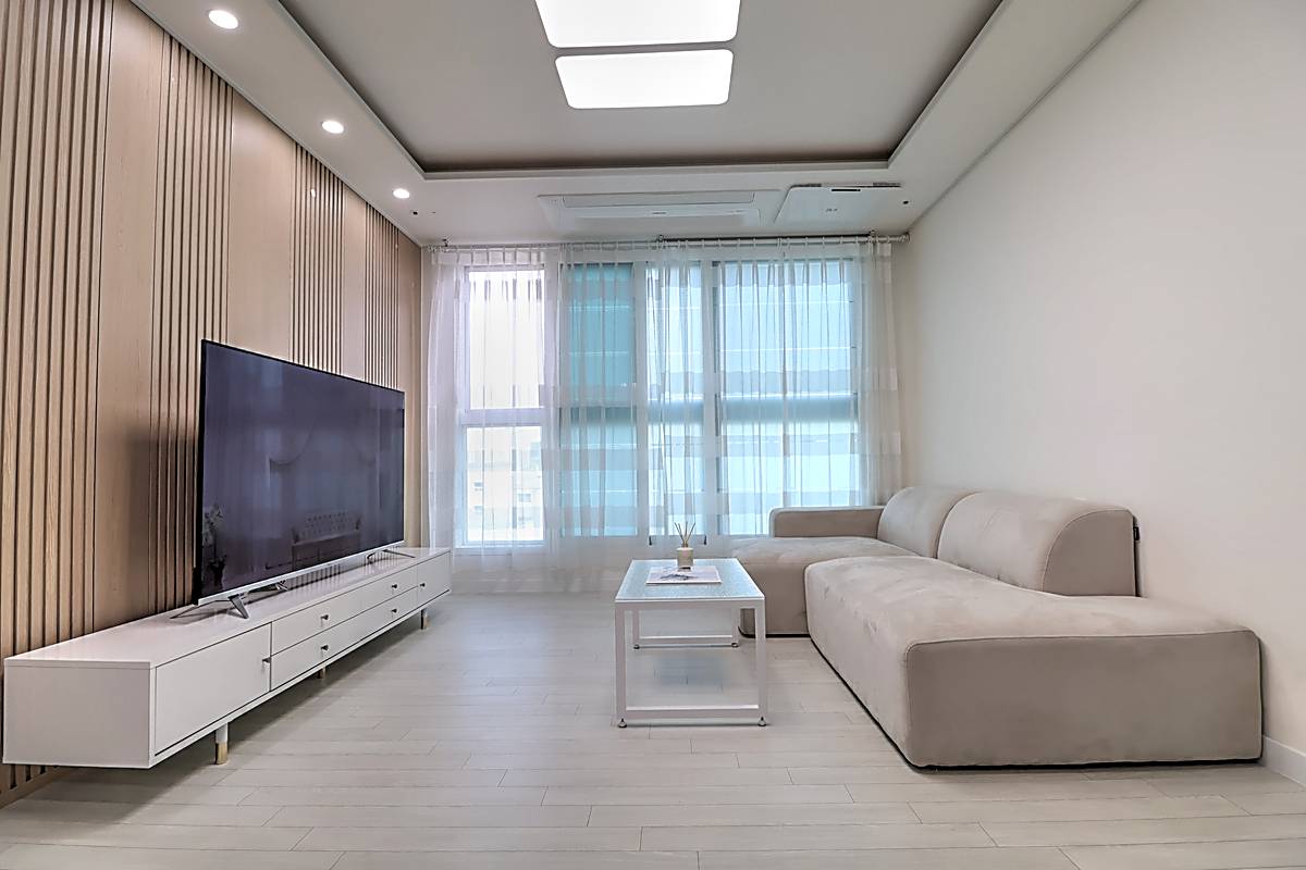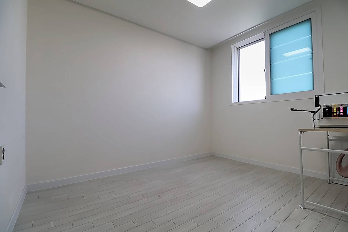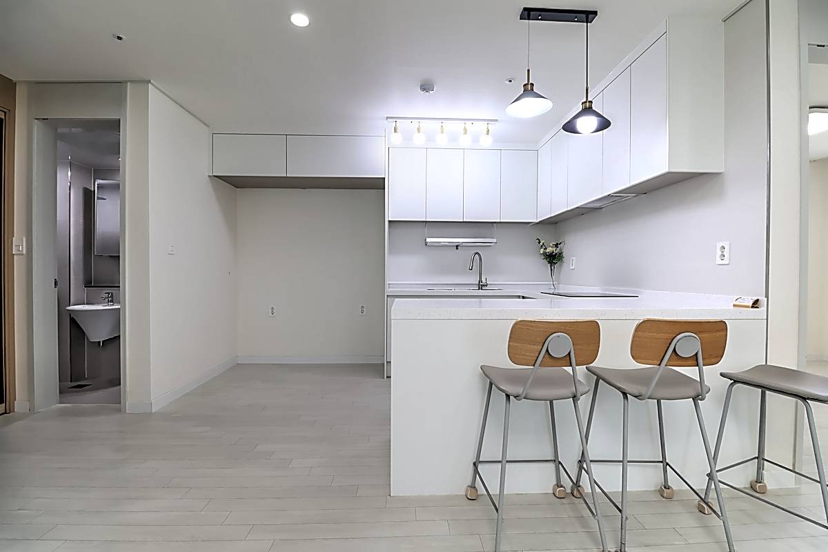 세대 내부는 3룸 2욕실 구조로 계획되어 있어 자녀가 있는 가구도 여유 있게 생활할 수 있습니다. 거실은 화이트와 우드 톤이 조화를 이루는 세련된 마감으로 시공되었고, 넓은 창이 설치되어 채광과 통풍이 뛰어납니다. 천장에는 시스템 에어컨이 설치되어 사계절 내내 쾌적한 온도를 유지할 수 있습니다. 주방은 ㄷ자형 구조와 상·하부장이 어우러져 조리 동선이 편리하고, 냉장고 수납 공간까지 깔끔하게 배치되어 있습니다. 각 방은 네모 반듯한 형태와 큰 창으로 가구 배치가 수월하며, 작은 방과 이어진 다용도실에는 세탁기와 건조기를 둘 수 있는 별도 공간이 마련되어 있습니다. 메인 욕실에는 해바라기 수전과 수납장이 구성되어 있어 샤워와 정리가 동시에 가능한 구조입니다.
