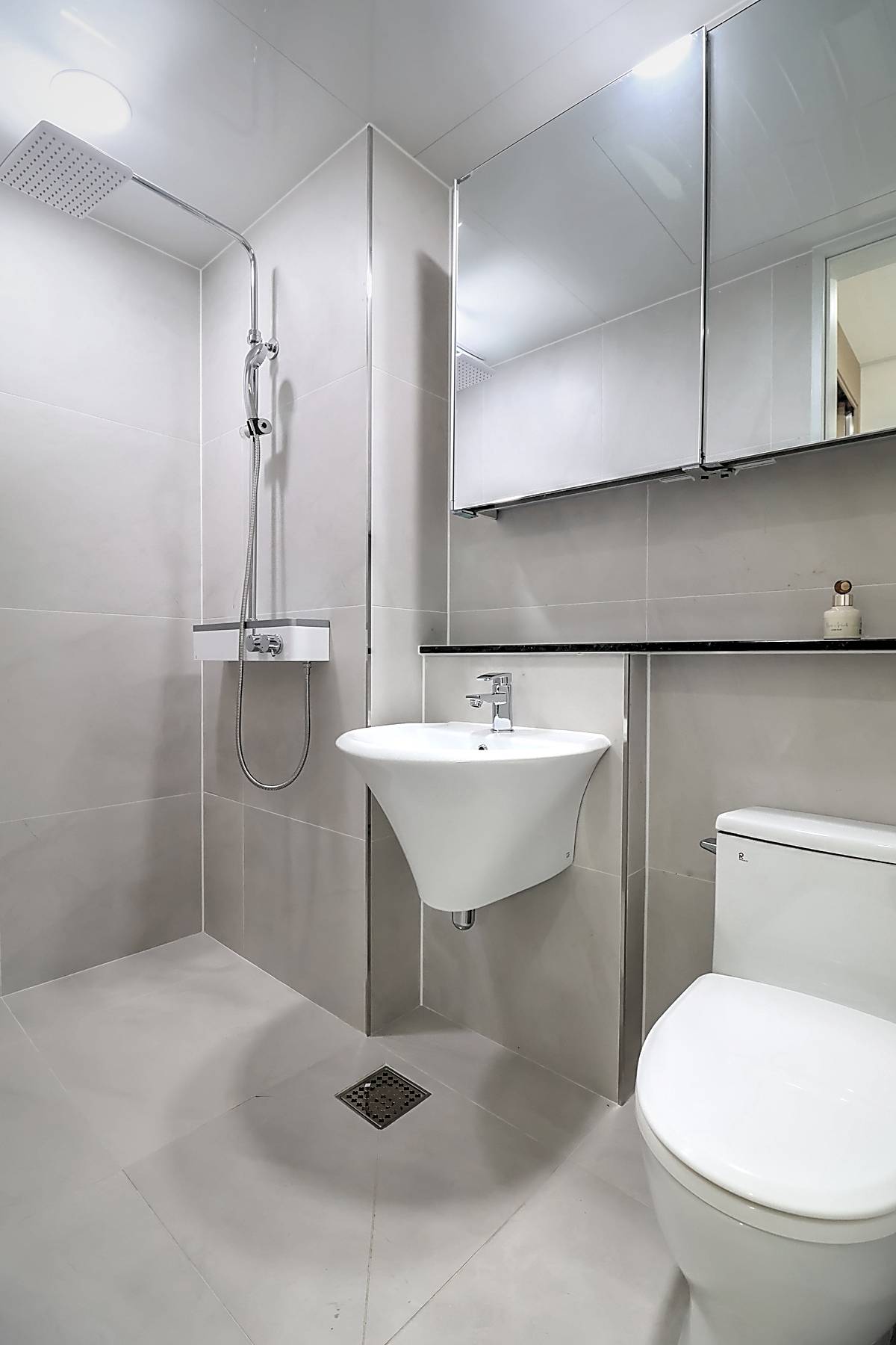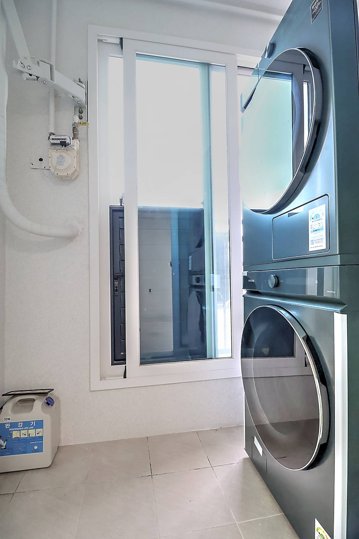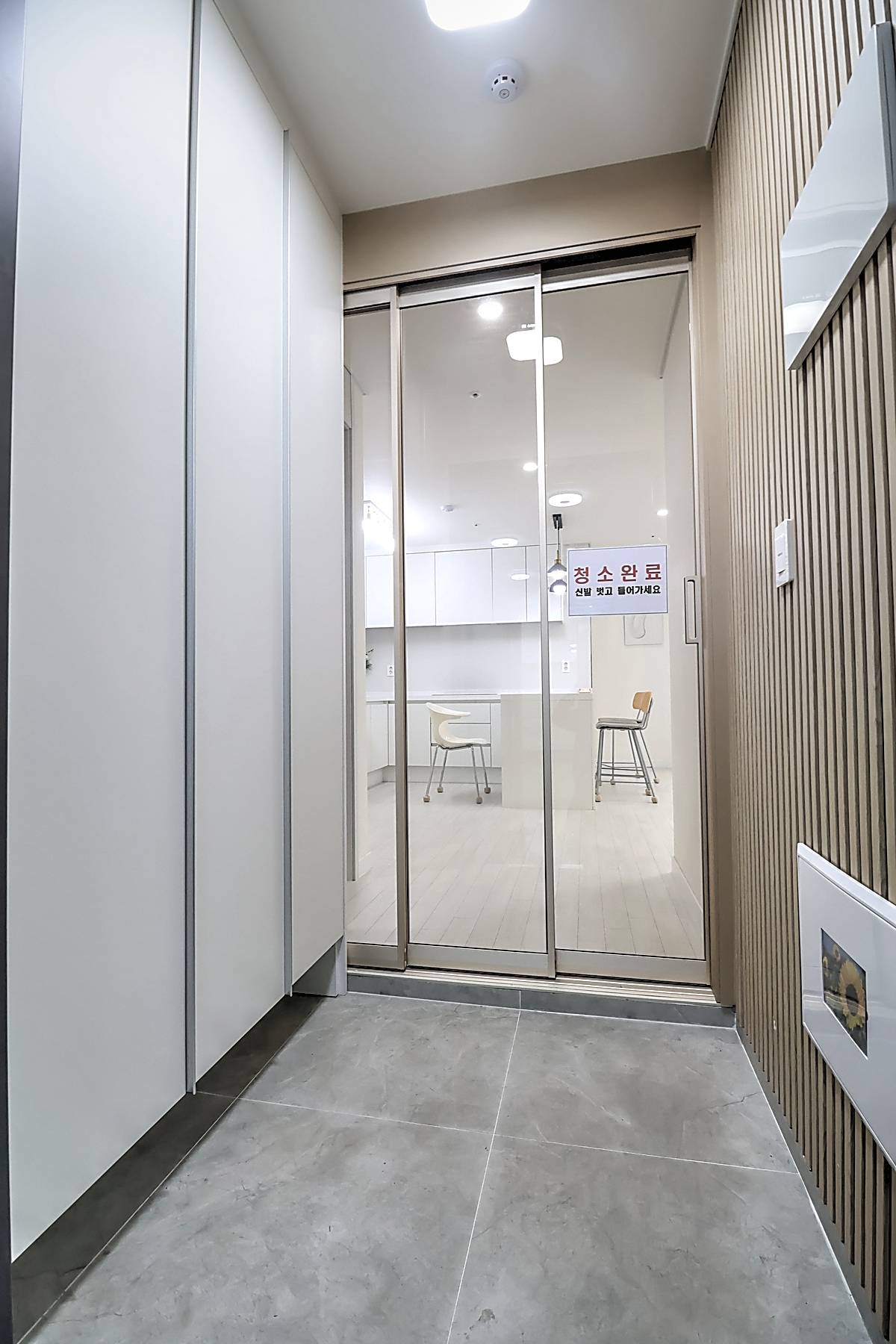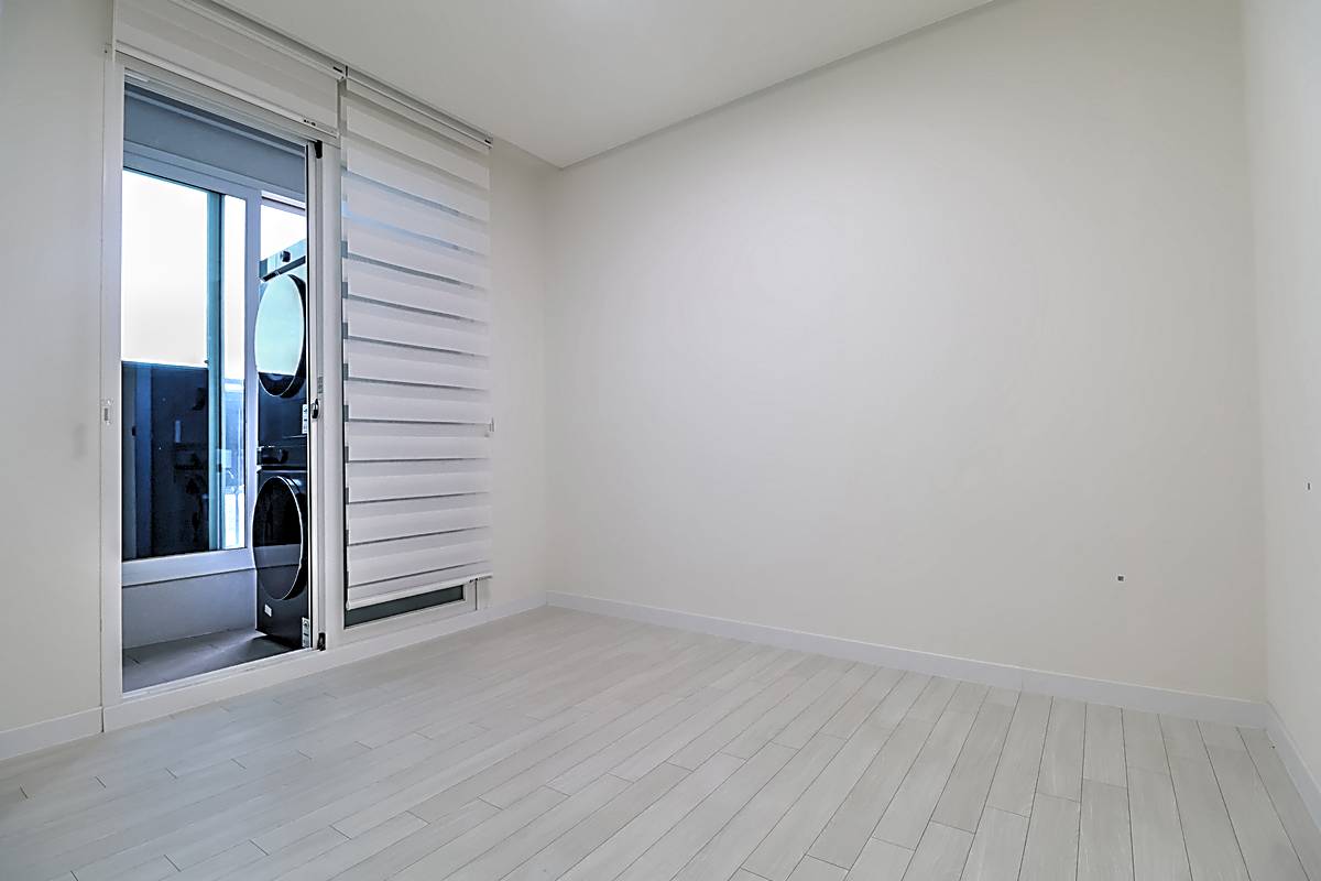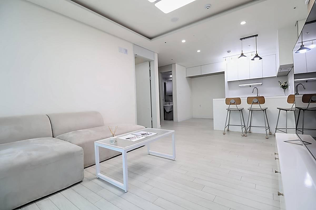 세대 내부는 3룸 2욕실 구조로 계획되어 있어 자녀가 있는 가구도 여유 있게 생활할 수 있습니다. 거실은 화이트와 우드 톤이 조화를 이루는 세련된 마감으로 시공되었고, 넓은 창이 설치되어 채광과 통풍이 뛰어납니다. 천장에는 시스템 에어컨이 설치되어 사계절 내내 쾌적한 온도를 유지할 수 있습니다. 주방은 ㄷ자형 구조와 상·하부장이 어우러져 조리 동선이 편리하고, 냉장고 수납 공간까지 깔끔하게 배치되어 있습니다. 각 방은 네모 반듯한 형태와 큰 창으로 가구 배치가 수월하며, 작은 방과 이어진 다용도실에는 세탁기와 건조기를 둘 수 있는 별도 공간이 마련되어 있습니다. 메인 욕실에는 해바라기 수전과 수납장이 구성되어 있어 샤워와 정리가 동시에 가능한 구조입니다.