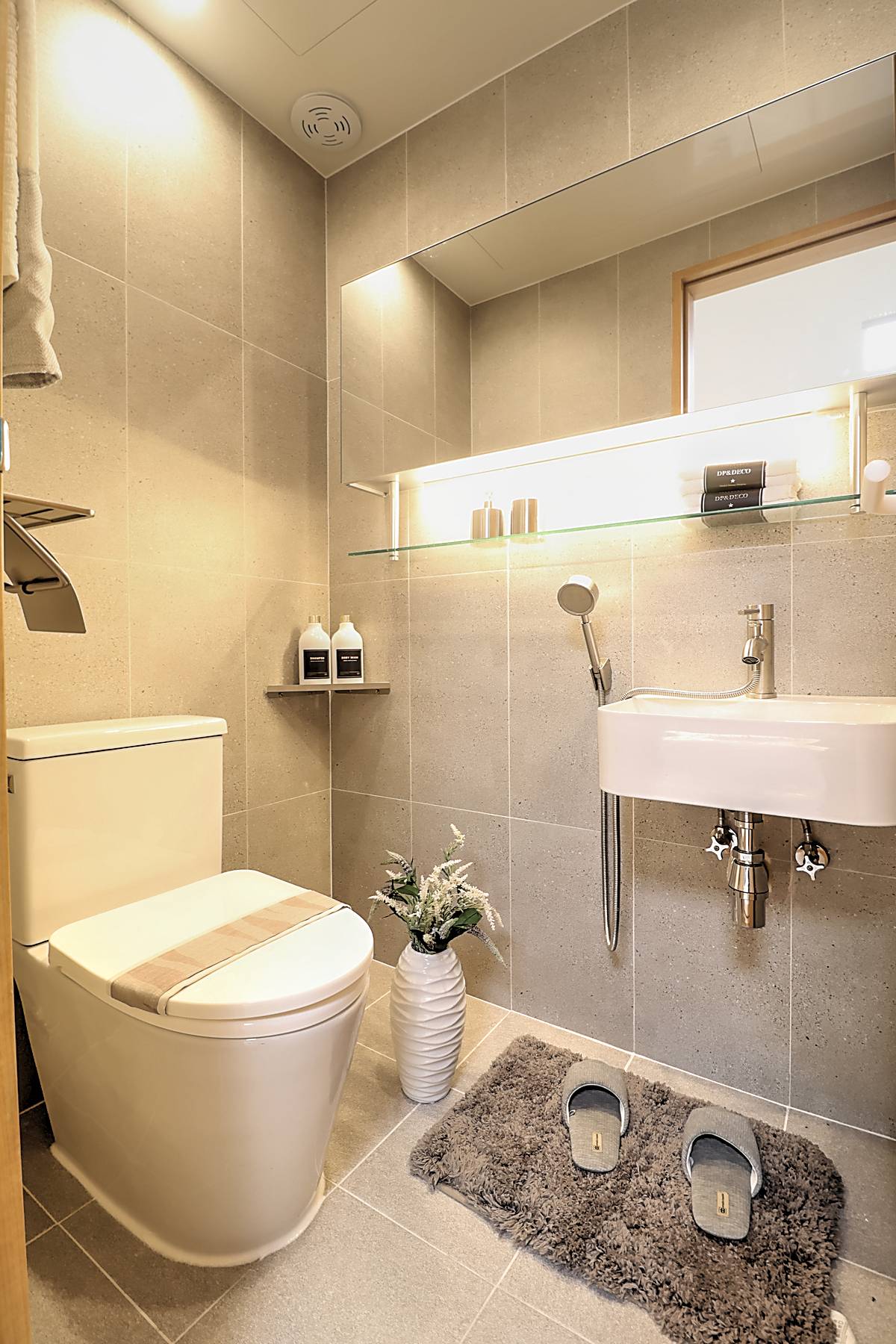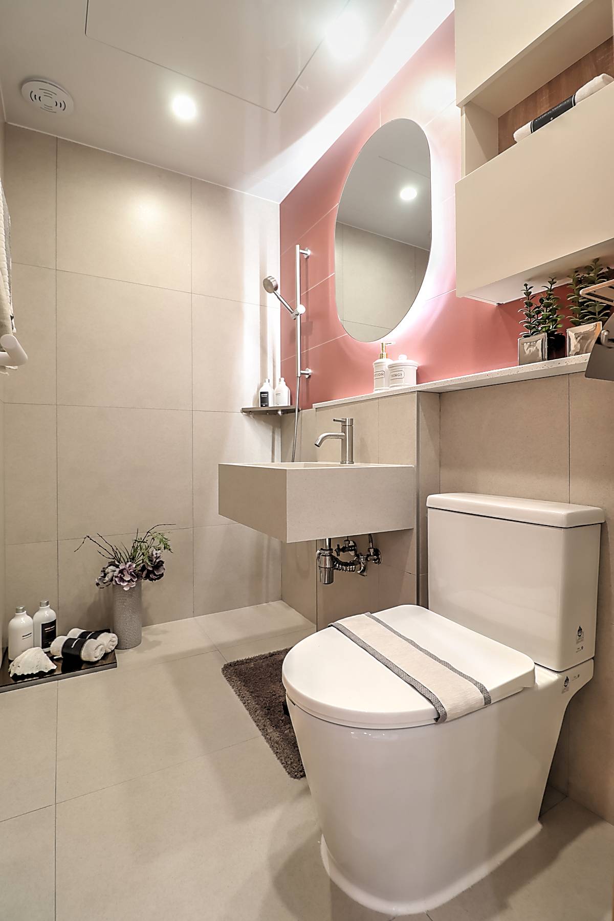 2개의 욕실은 하이엔드 내장재로 마감했어요. 핑크 포인트 컬러가 들어가서 분위기가 화사하고 밝아요. 기본 구성품도 고급스럽게 갖춰져 있어서 추가 공사 없이 바로 입주 가능합니다.
