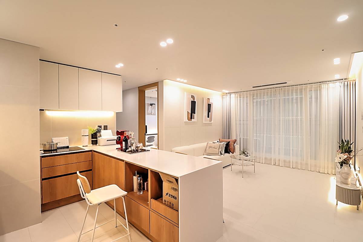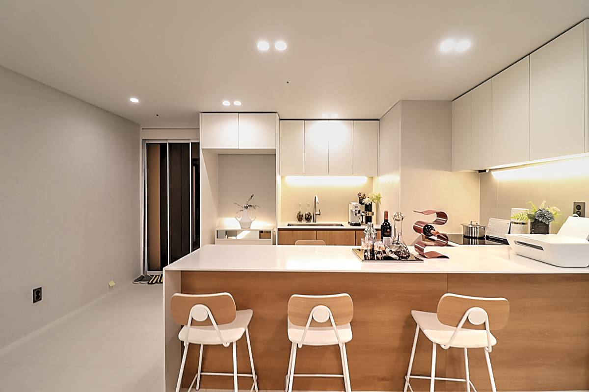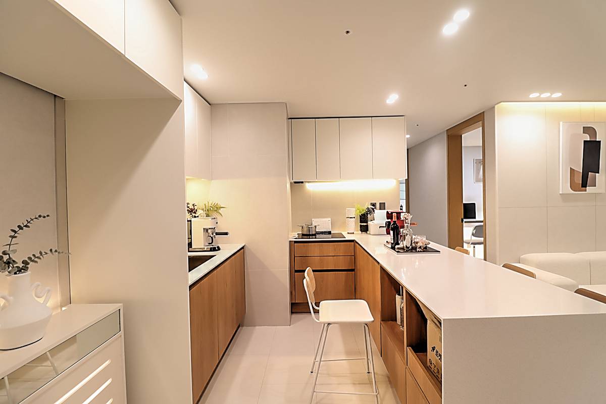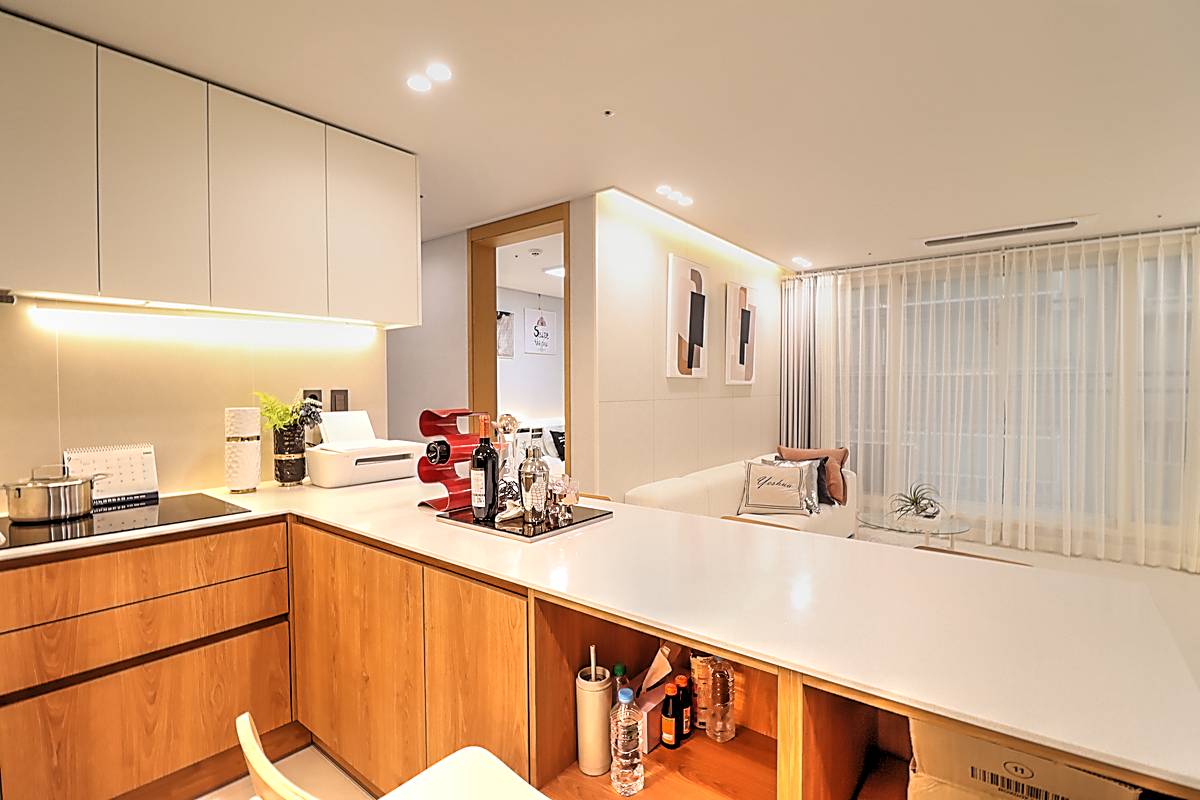 ㄷ자 구조의 싱크대는 요리하는 분들에게 최적의 배치예요. 한 손으로는 냉장고에서 재료를 꺼내고, 반대편에서는 바로 조리할 수 있는 동선. 화이트&우드 톤의 상하부장은 수납력도 뛰어나고요. 특히 주방 창이 별도로 있어서 요리 냄새나 습기 걱정이 없다는 점, 실거주자들이 가장 만족하는 부분 중 하나입니다.