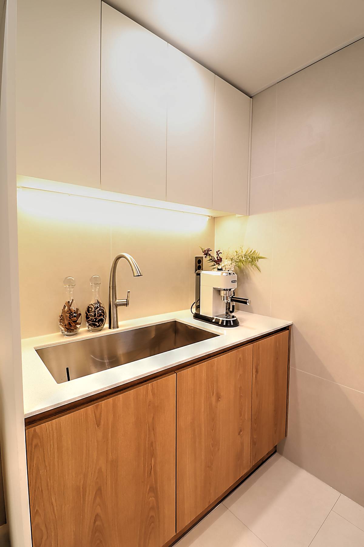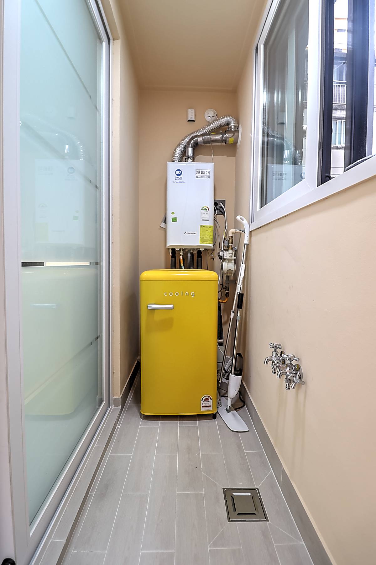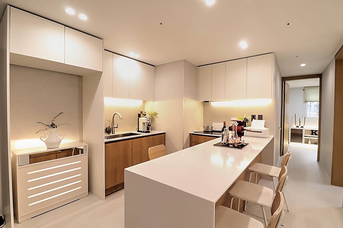 ㄷ자 구조의 싱크대는 요리하는 분들에게 최적의 배치예요. 한 손으로는 냉장고에서 재료를 꺼내고, 반대편에서는 바로 조리할 수 있는 동선. 화이트&우드 톤의 상하부장은 수납력도 뛰어나고요. 특히 주방 창이 별도로 있어서 요리 냄새나 습기 걱정이 없다는 점, 실거주자들이 가장 만족하는 부분 중 하나입니다.