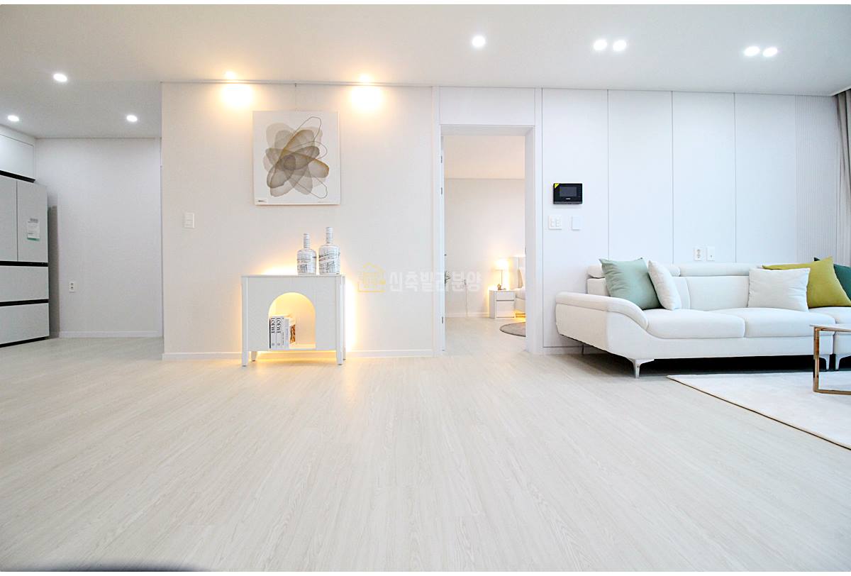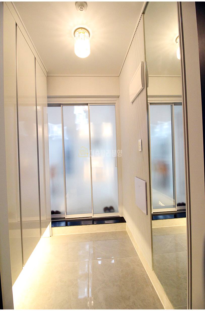 현관에는 수납장이 넉넉하고 전신거울도 부착되어 있습니다. 중문 시공은 기본이라 냉난방 효율에도 도움이 됩니다. 외출 전 옷 매무새를 체크하기 좋으며, 중문은 현관과 실내를 분리해 에너지 효율을 높입니다.