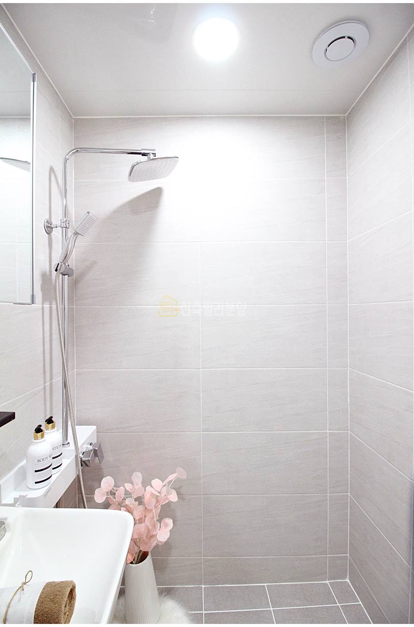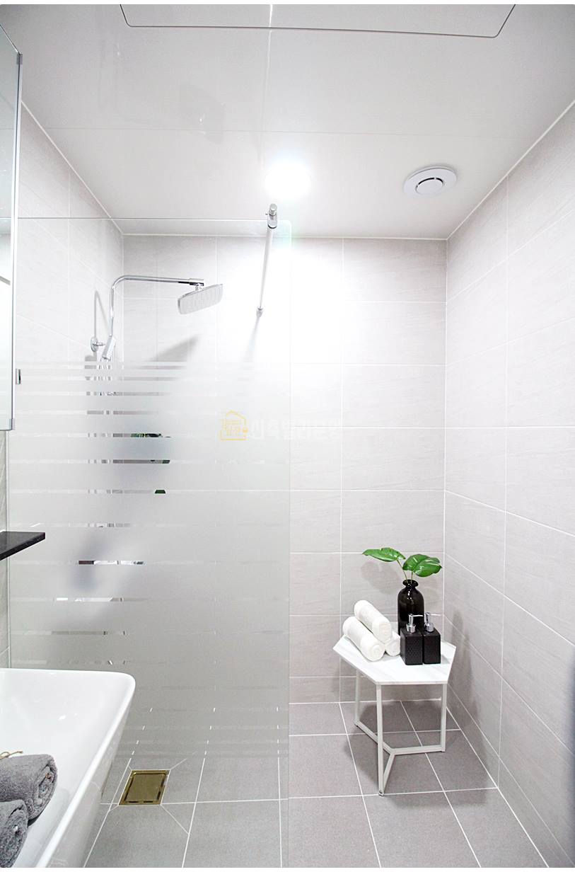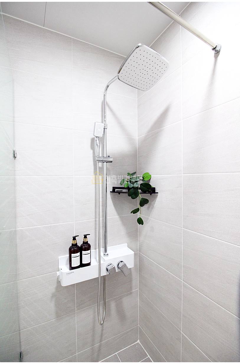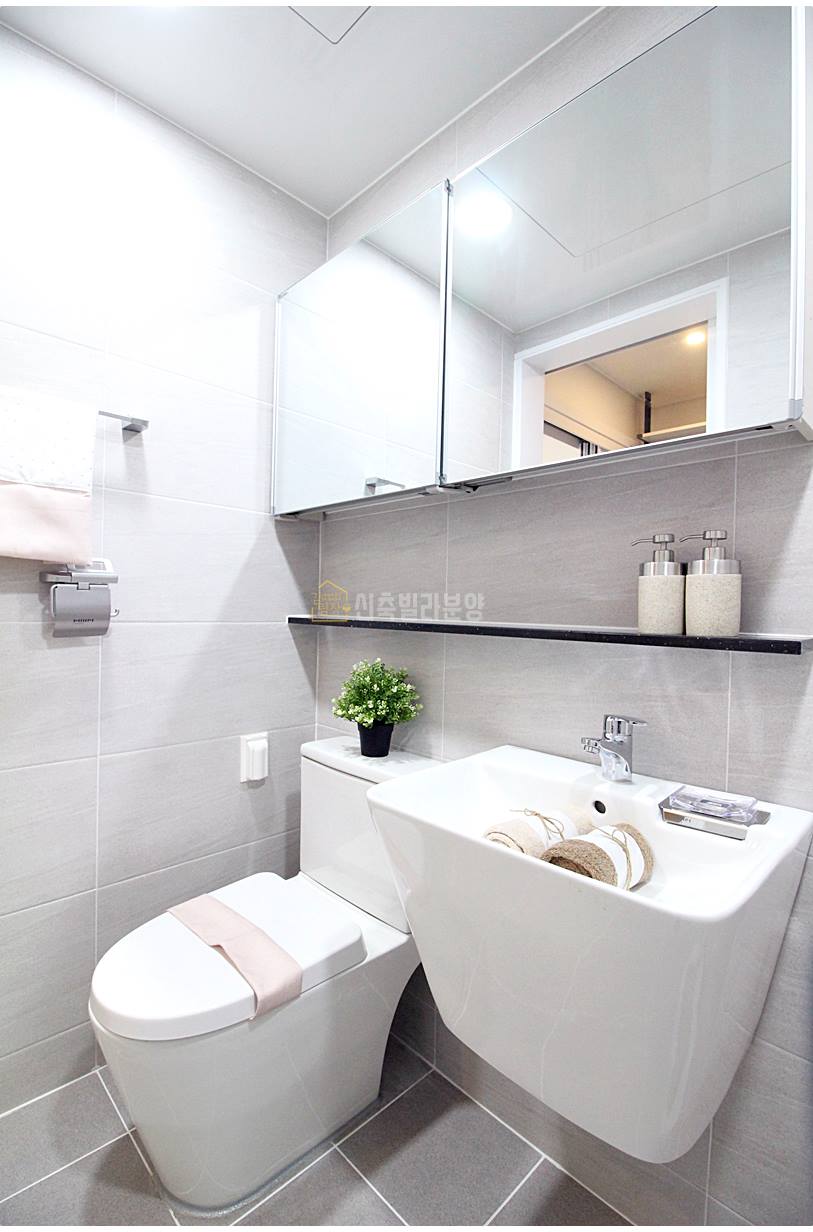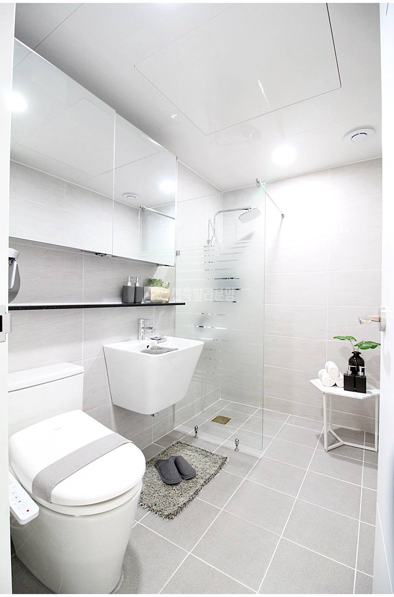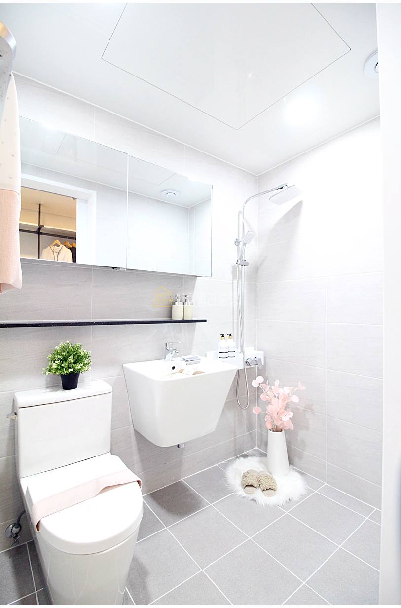 처인구신축빌라 욕실은 호불호 없는 무난한 디자인입니다. 샤워공간이 분리되어 있으며, 반다리형 세면대와 치마형 변기가 사용되었습니다. 부부 욕실은 칸막이 설치는 되어 있지 않지만, 넉넉한 샤워공간이 있습니다.