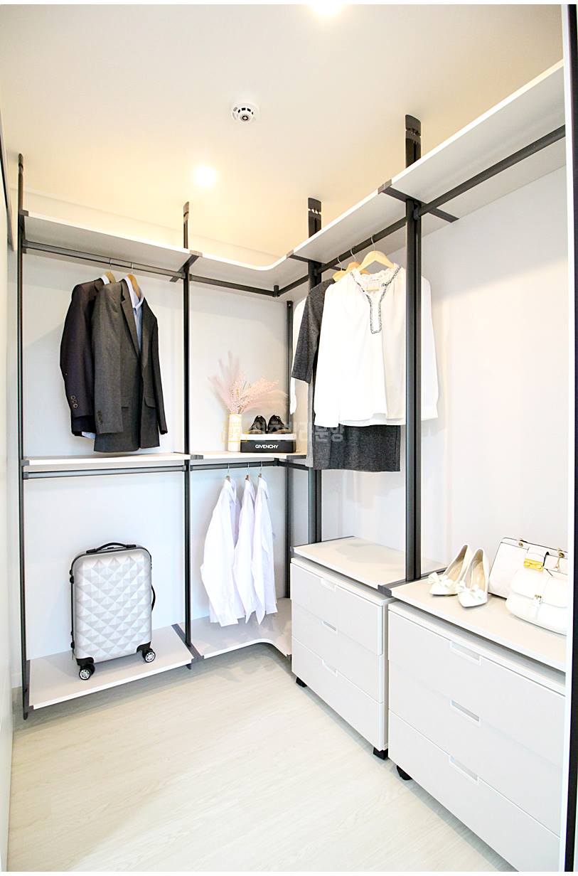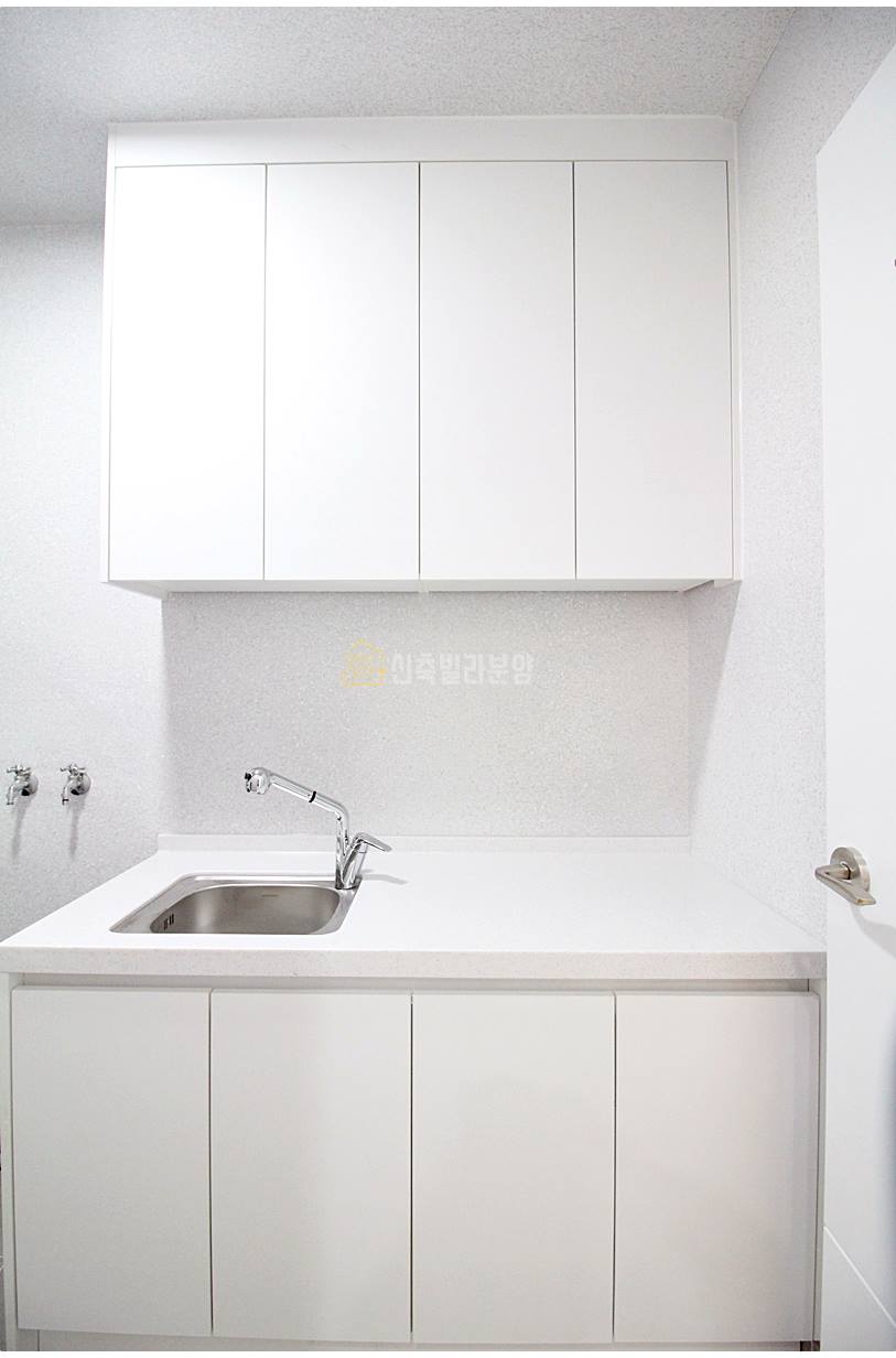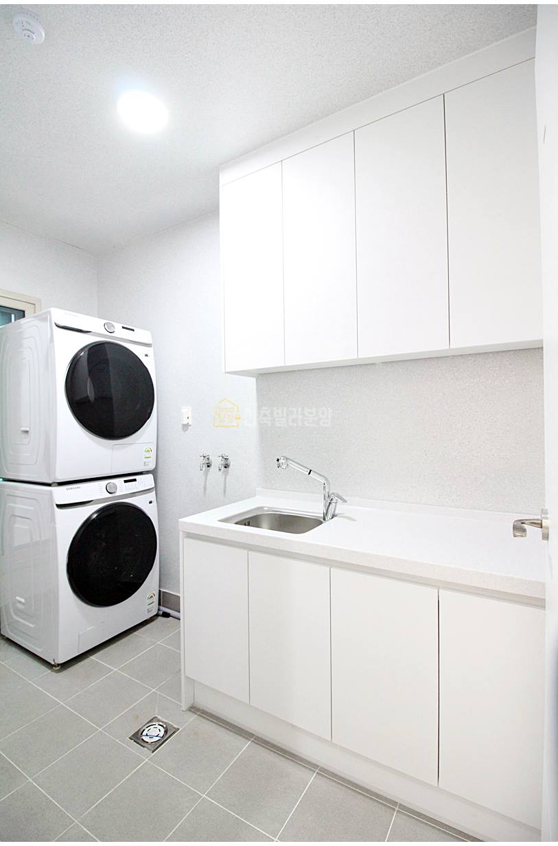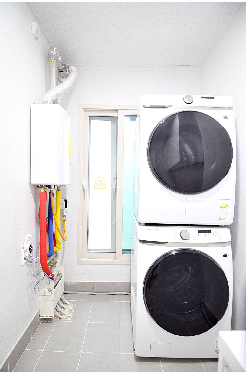 주방 옆으로 보조주방이 있어서 개수대와 수납장을 추가로 사용할 수 있습니다. 세탁기와 건조기도 직렬 설치가 가능해, 공간 활용이 매우 효율적입니다.