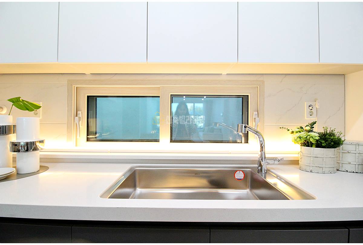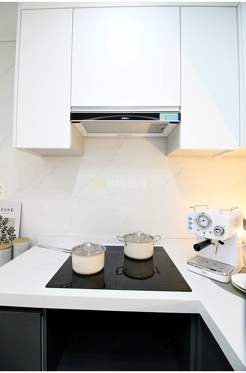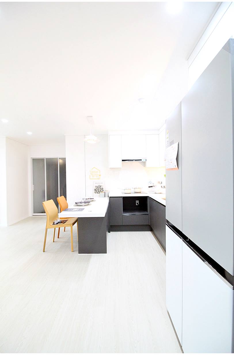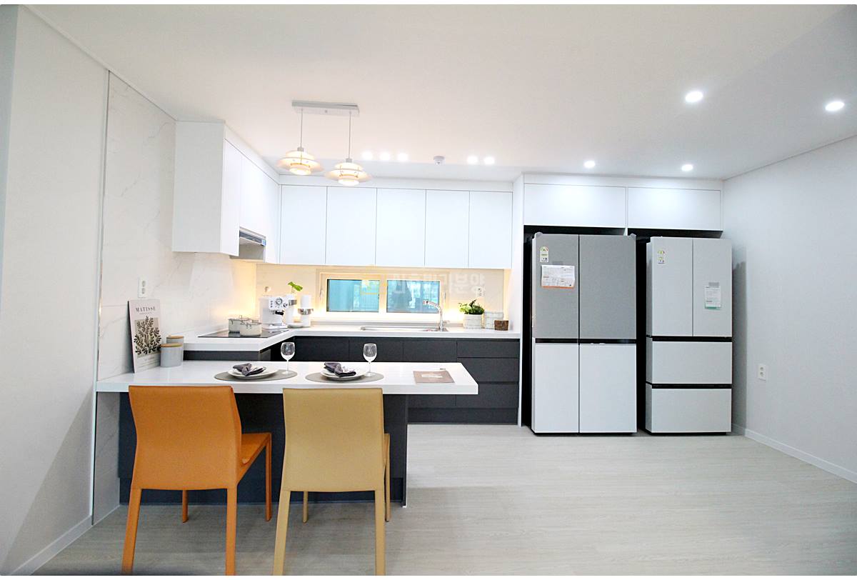 선호도 높은 ㄷ자형 주방 구조입니다. 냉장고는 두 대를 놓을 수 있으며, 인덕션과 후드도 기본으로 설치되어 있습니다. 작은 창문도 있어서 환기에 도움이 됩니다.