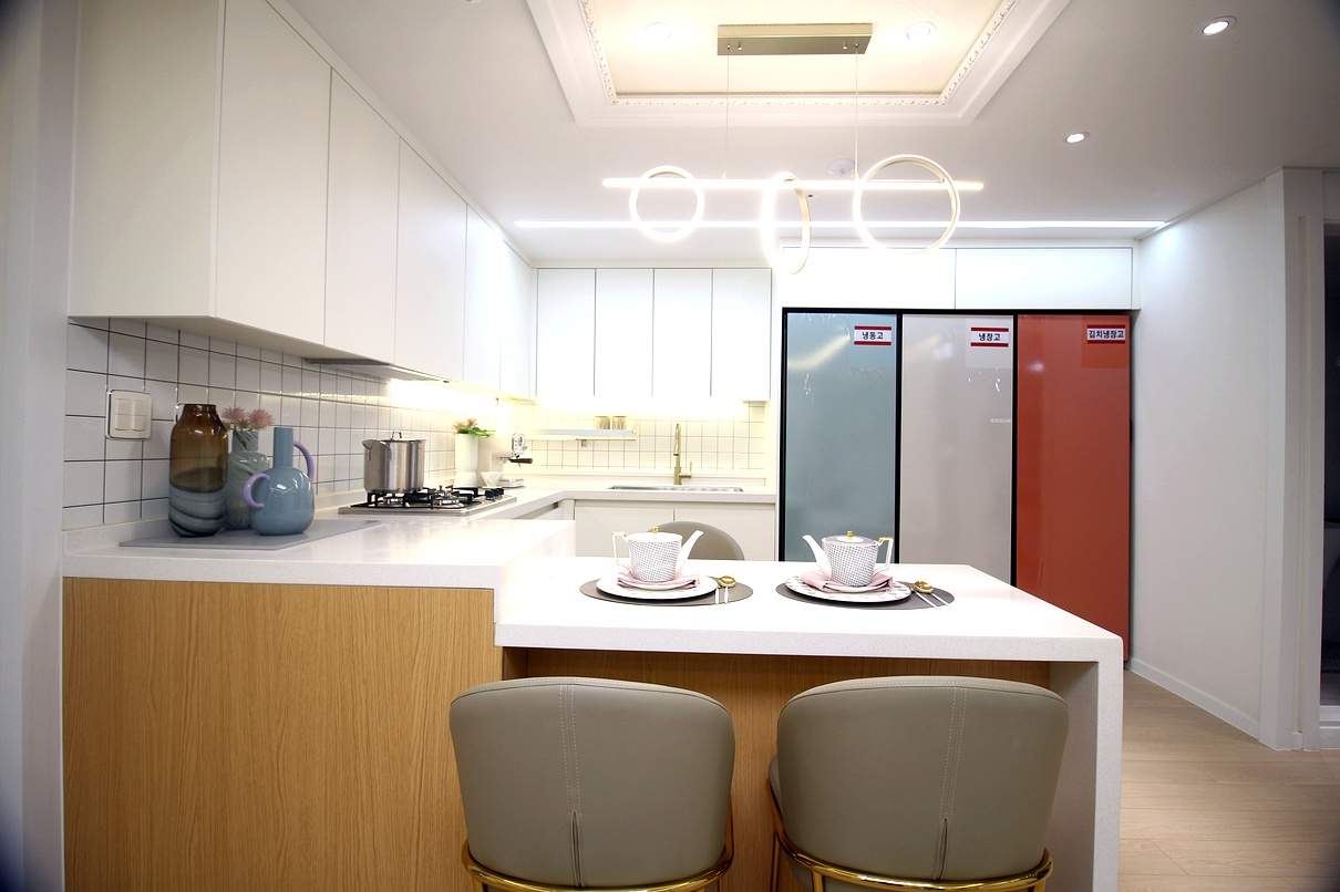 주방의 디테일이 돋보입니다. ㄷ자형 아일랜드 식탁 구조로 동선이 효율적이며, 3칸짜리 비스포크 냉장고가 들어갈 자리가 깔끔하게 마련되어 있습니다. (냉장고 옵션 여부는 현장 확인 필수!)