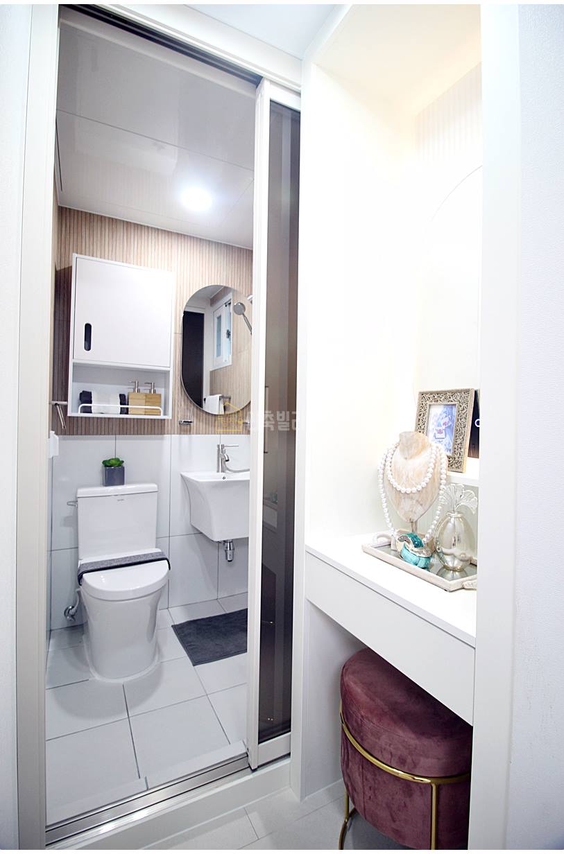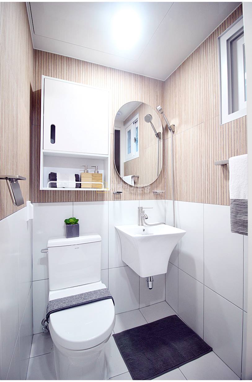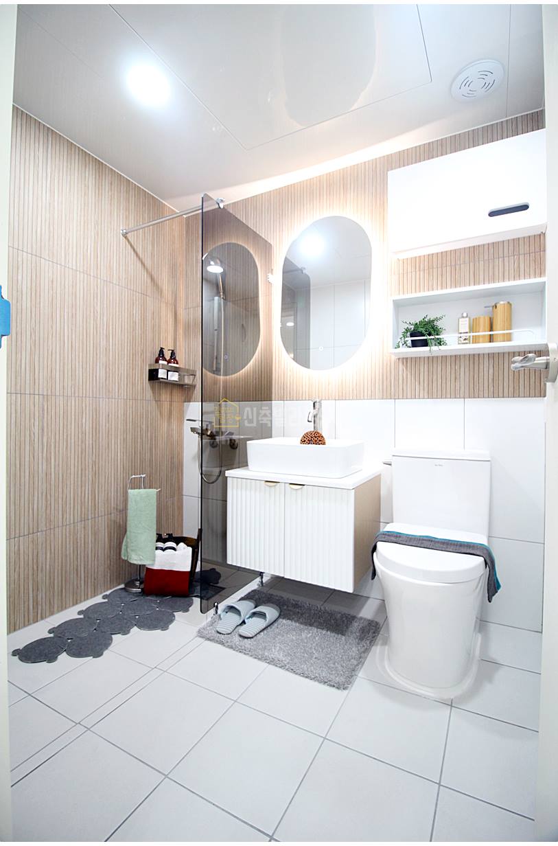 월피동빌라매매 고급스러운 타일과 깔끔한 디자인이 어우러진 욕실은 하루를 마무리하는 고요하고 편안한 공간입니다. 넓은 샤워부스와 넉넉한 수납공간은 실용성을 더하고, 우드 타일로 장식된 욕실은 따뜻하고 안락한 분위기를 선사해요. 바쁜 일상 속에서도 여유로운 휴식을 즐길 수 있는 공간이죠.