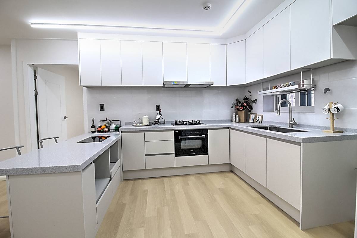ㄷ자 형태로 설계된 주방은 조리 동선의 효율성을 극대화한 구조입니다.