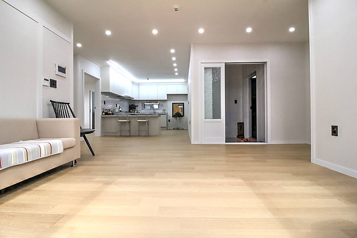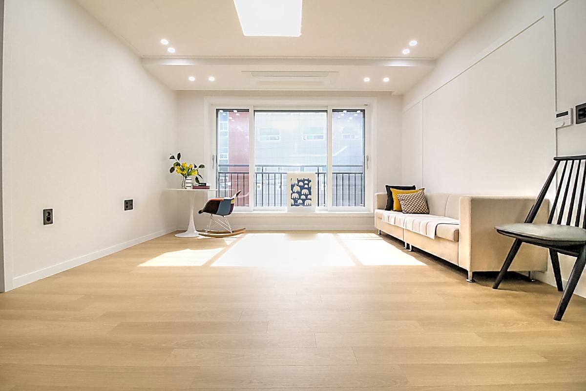 4인용 대형 소파와 TV장을 배치해도 여유로운 공간감을 자랑하며, 가족 모두가 함께 모여 영화를 감상하거나 대화를 나누기에 충분한 크기입니다.
