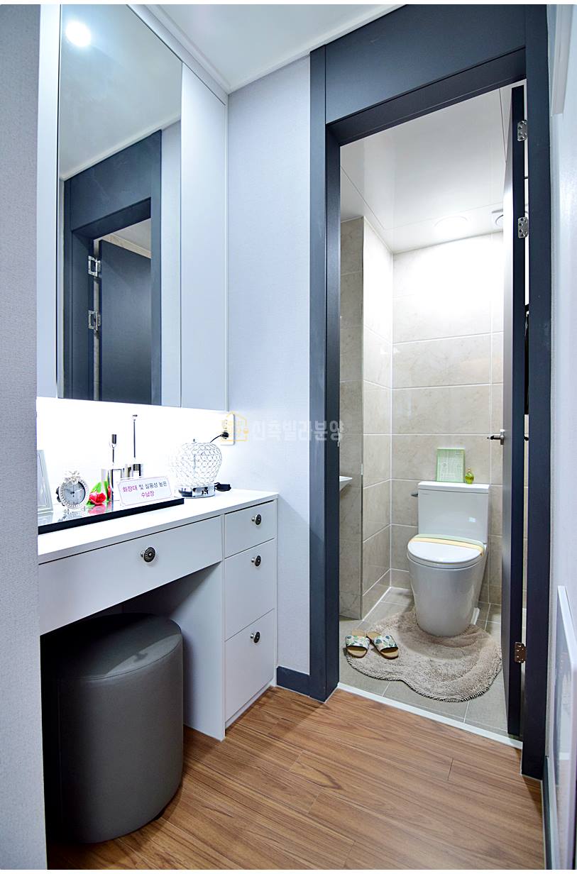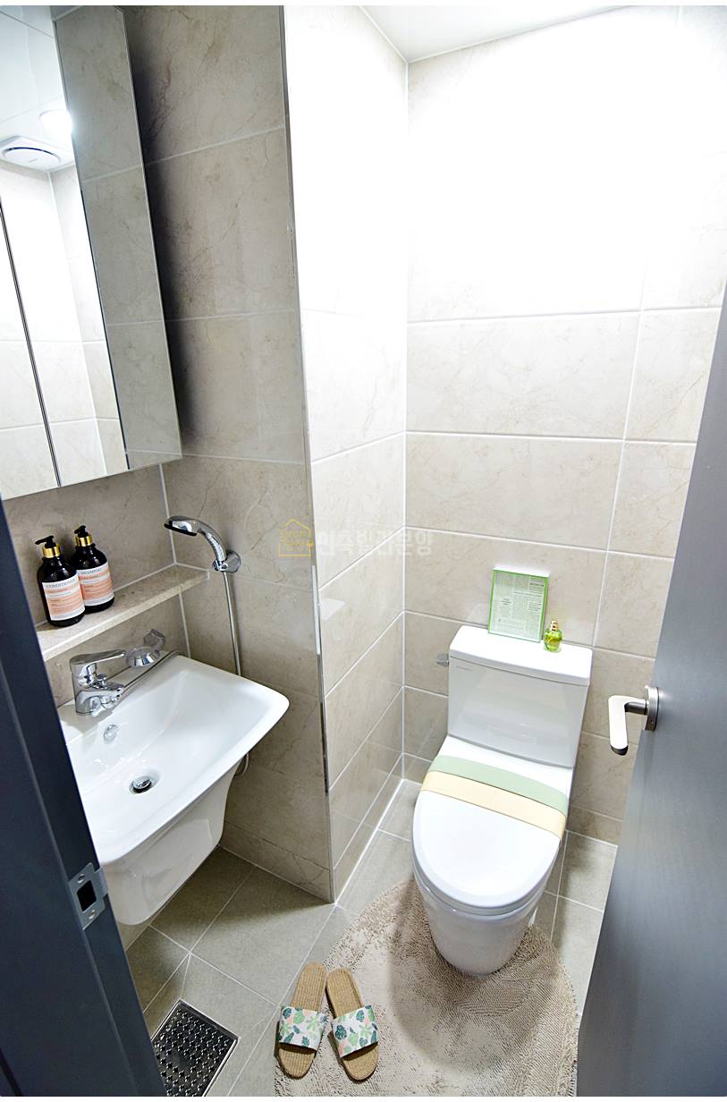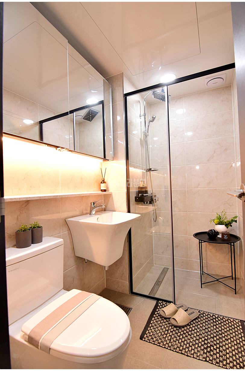 호원동신축빌라 모던하고 청결한 메인 욕실은 샤워부스가 설치되어 있어 더욱 깔끔하게 사용할 수 있습니다. 부부 욕실은 실용성을 중시하여 설계되었으며, 미끄럼 방지 타일이 설치되어 안전합니다.