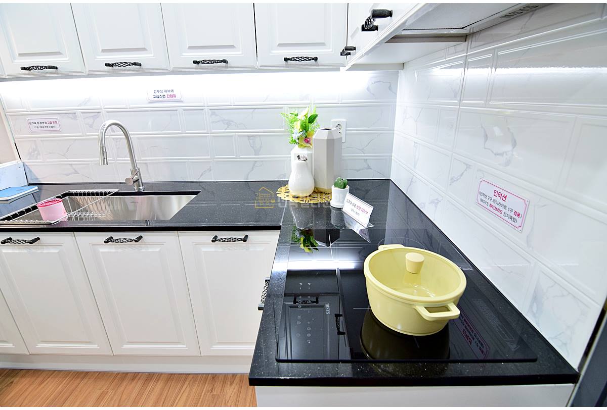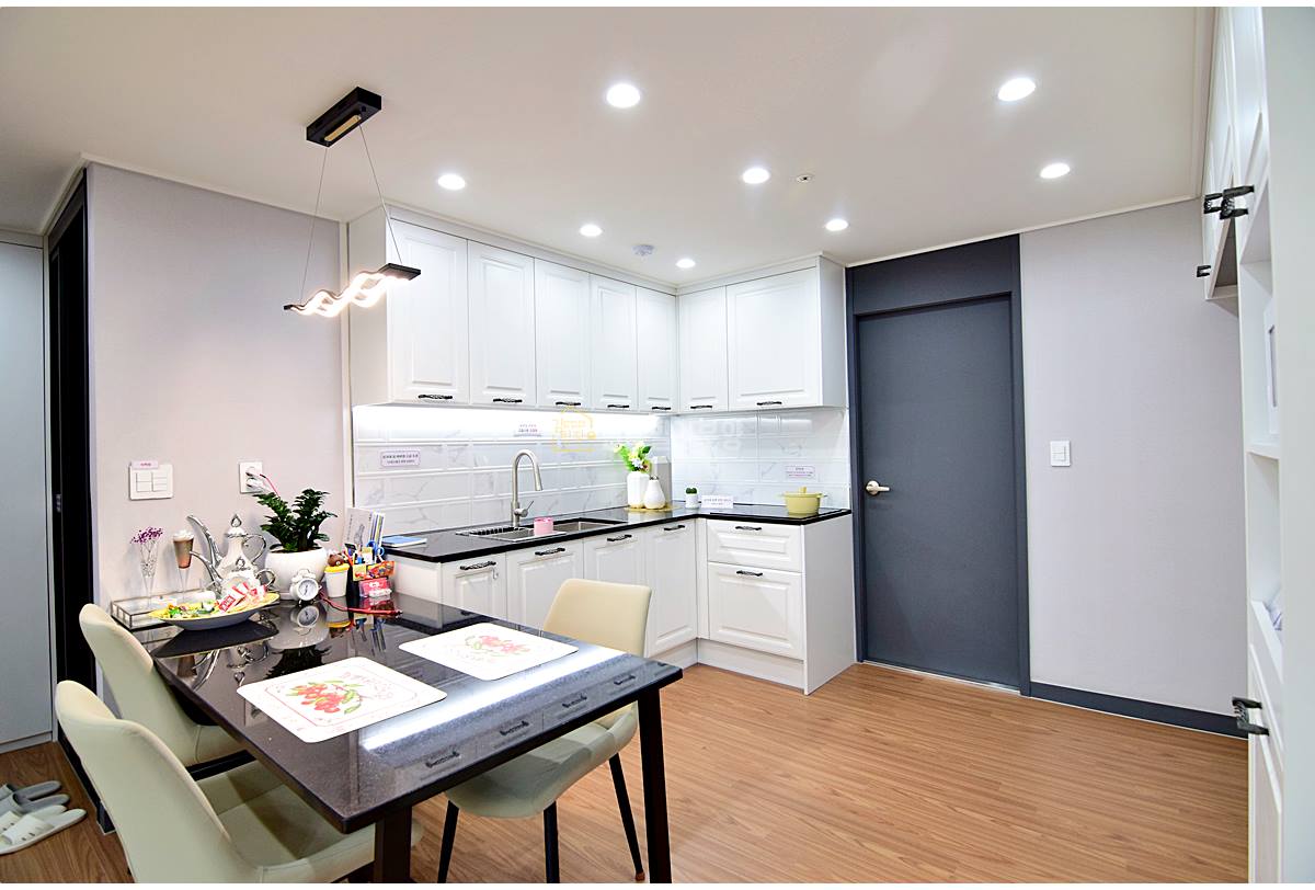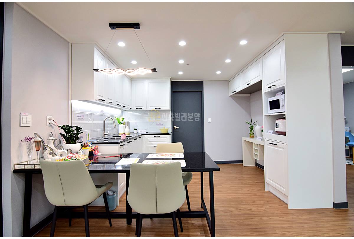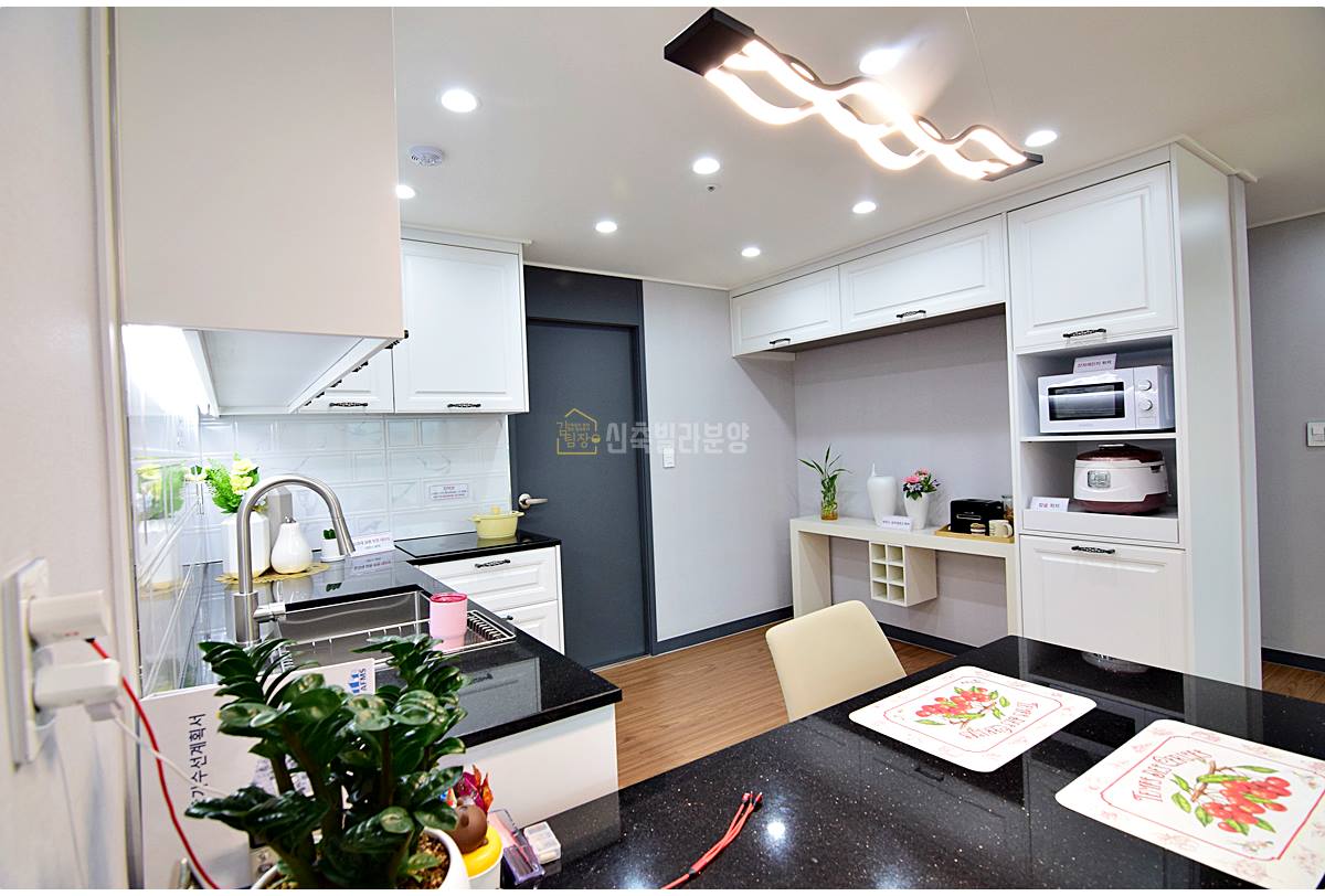 의정부신축빌라 실용적이면서도 세련된 디자인의 주방은 요리하는 즐거움을 더욱 높여줍니다. 기역자 형태의 싱크대는 위, 아래 수납공간이 넉넉하여 주방용품을 깔끔하게 정리할 수 있도록 돕습니다. 블랙 대리석 상판은 오랜 시간 동안 변색 없이 사용할 수 있도록 내구성이 뛰어나며, 앞쪽에는 식탁을 배치할 수 있는 공간이 마련되어 가족과 함께 식사하기 편리합니다. 3구 전기레인지는 요리 시간을 단축시켜주고, 우측 벽면에는 냉장고장을 설치하여 넉넉한 수납 공간을 확보했습니다.