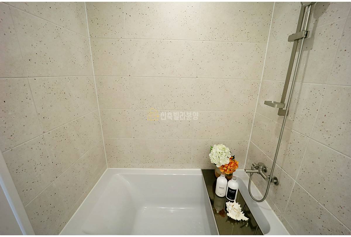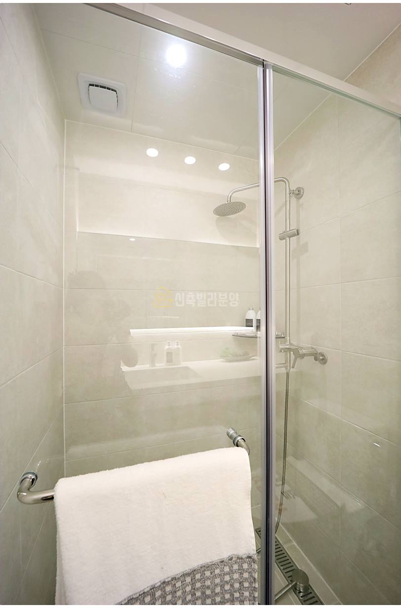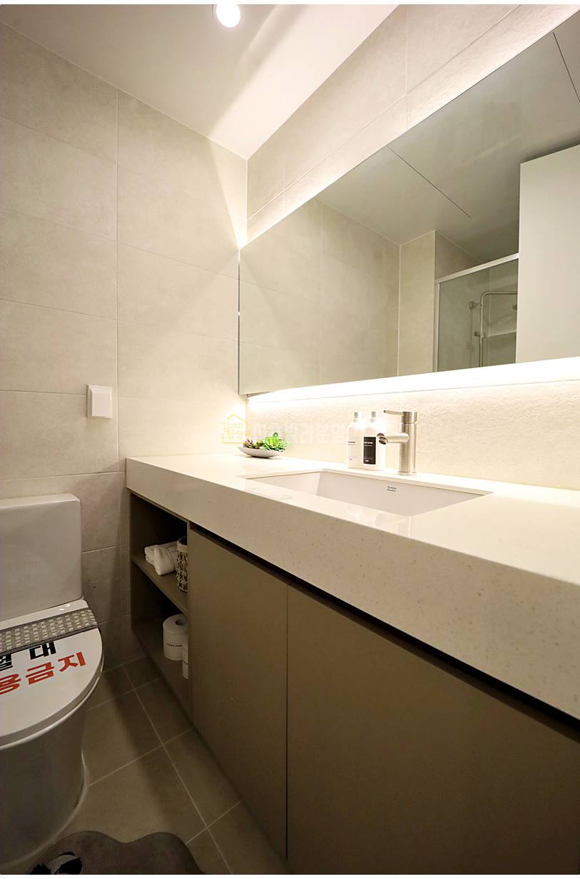 욕실별로 욕조와 부스 등 취향껏 사용 가능한 샤워시설이 준비되어 있습니다. 간접조명으로 세련된 분위기를 연출하며, 세면 공간도 길쭉하게 형성되어 있어 두 사람이 동시에 사용하기 편리합니다.