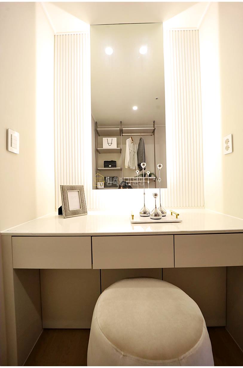 넓은 공간감이 느껴지는 메인 침실은 서브 욕실 통로 구간에 파우더 공간과 드레스룸이 있어 활용도가 매우 높습니다. 화장과 옷 정리를 체계적으로 할 수 있는 프리미엄 구조입니다.