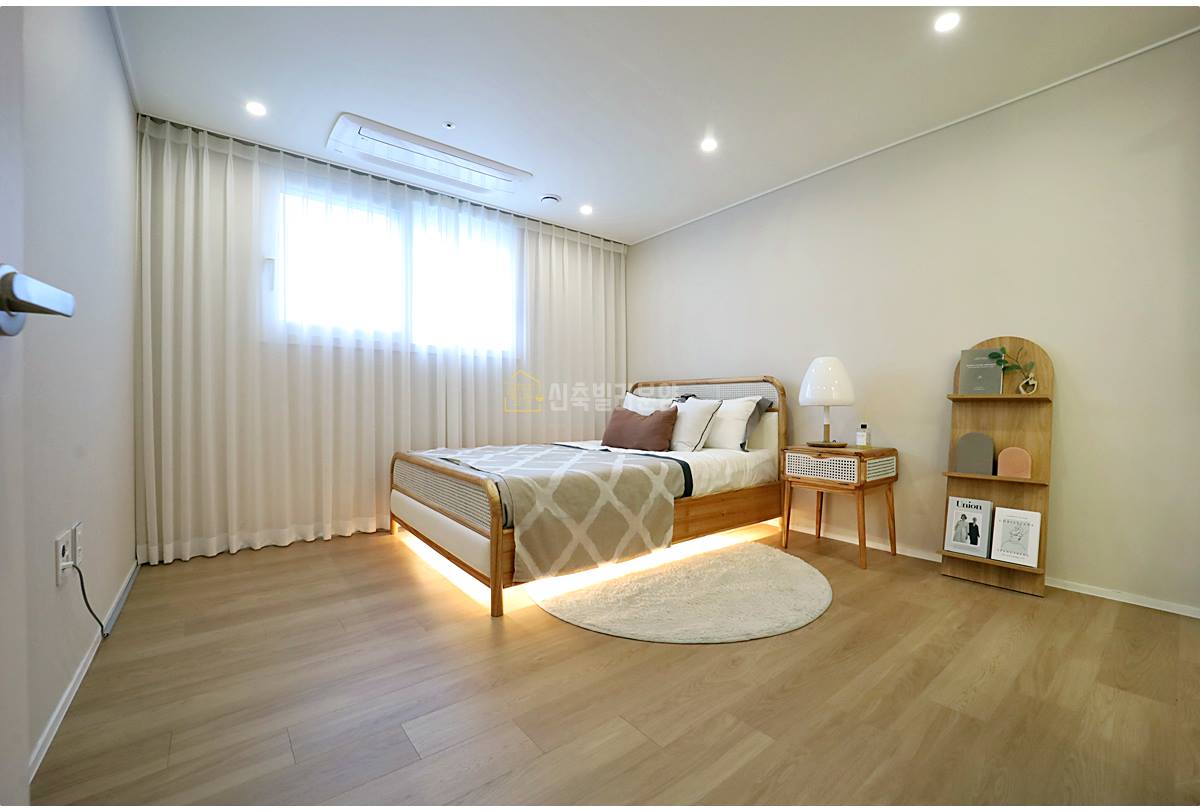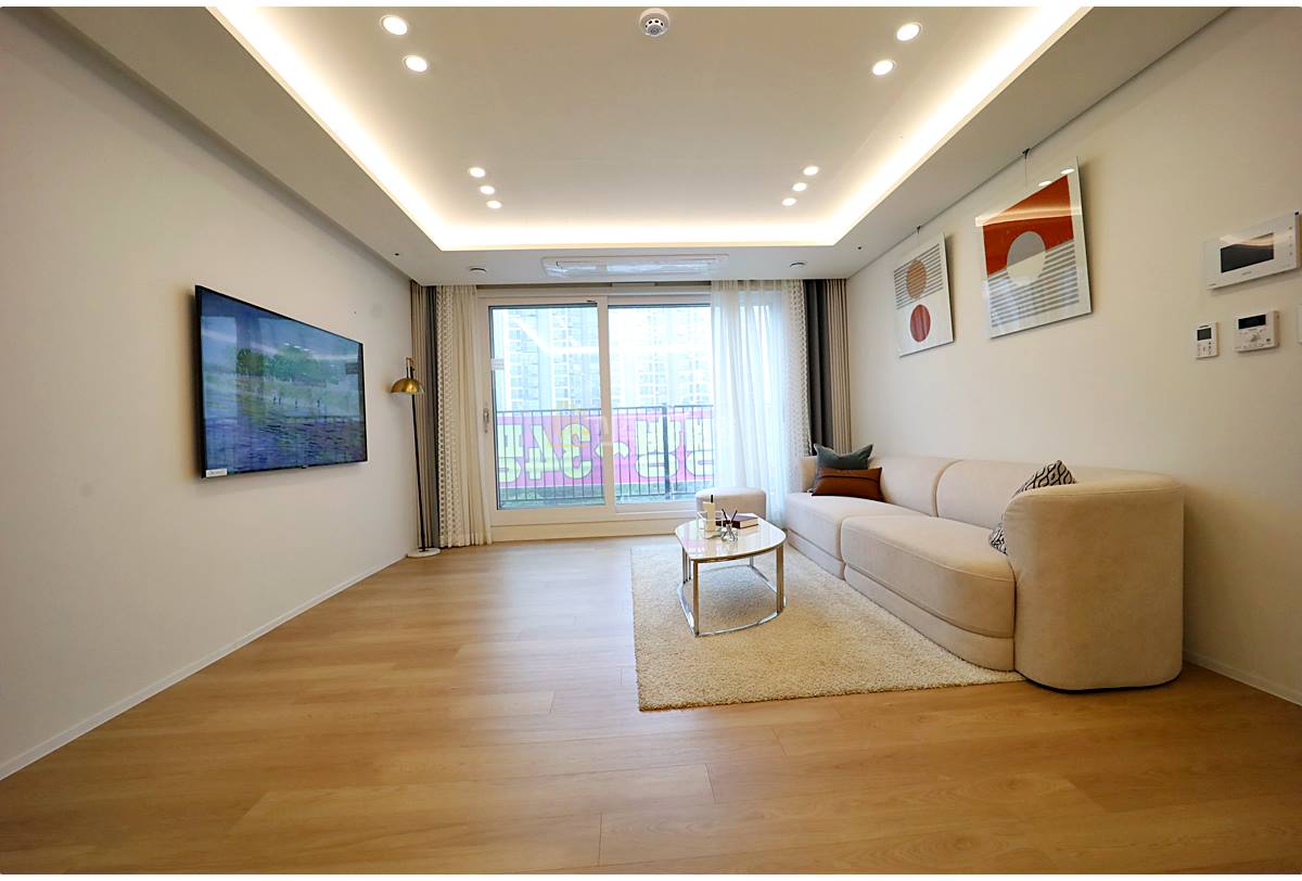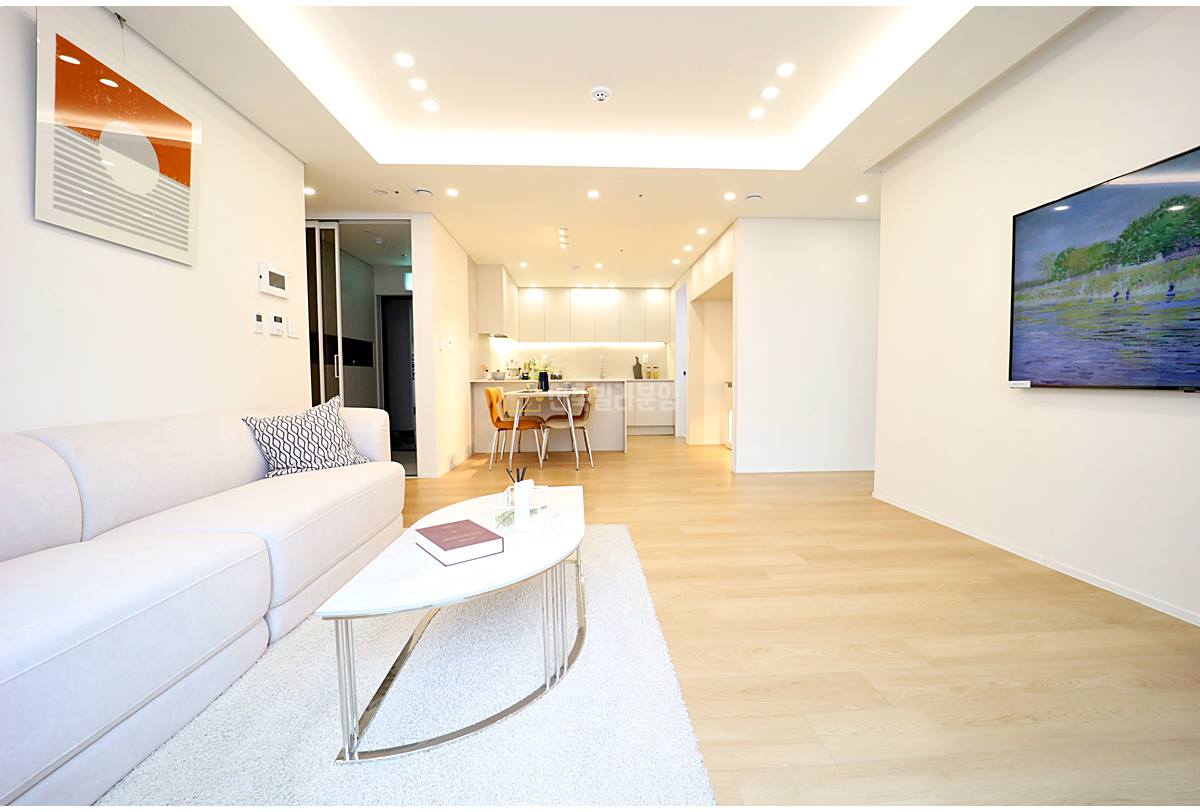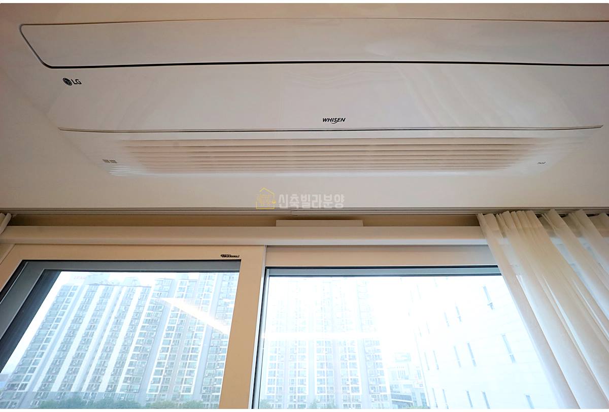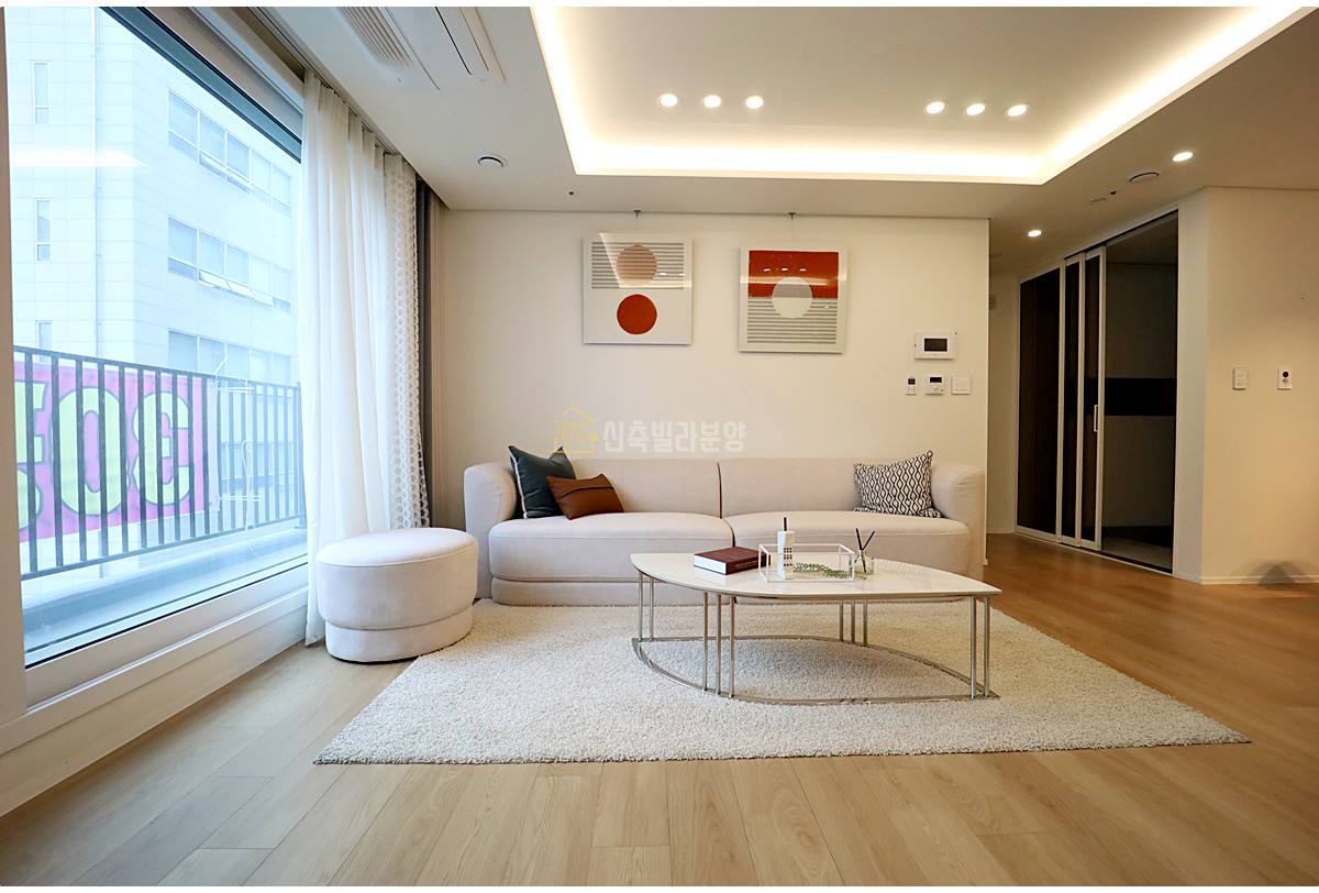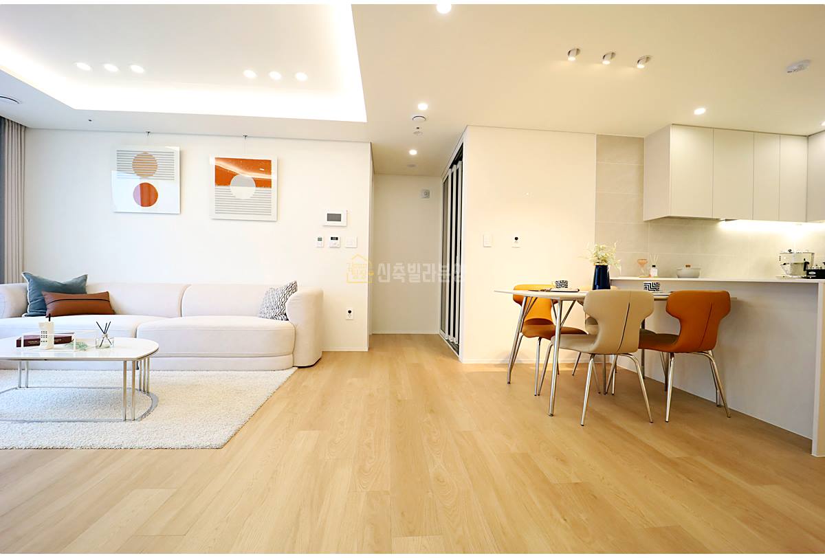 인천신축빌라 거실은 우물형 천장으로 개방감이 느껴지며, 깔끔하게 마감되어 있습니다. 통창 가까이 시스템 에어컨이 설치되어 있고, 핀 조명과 천장을 둘러싼 LED 매립등으로 저녁에는 한층 더 분위기 있는 생활이 가능합니다.