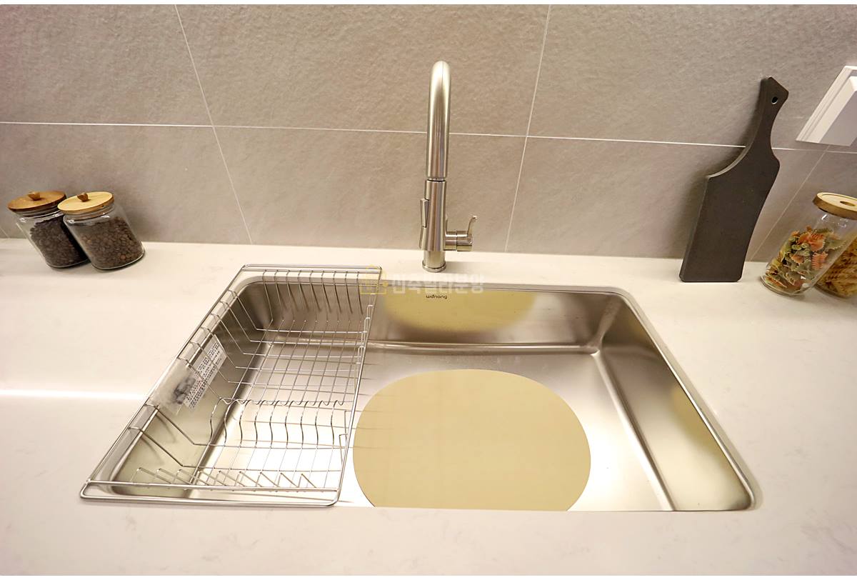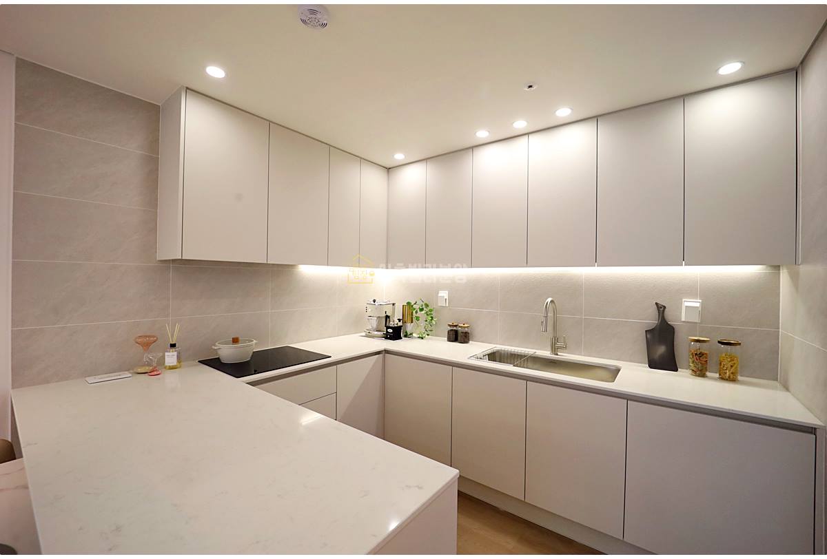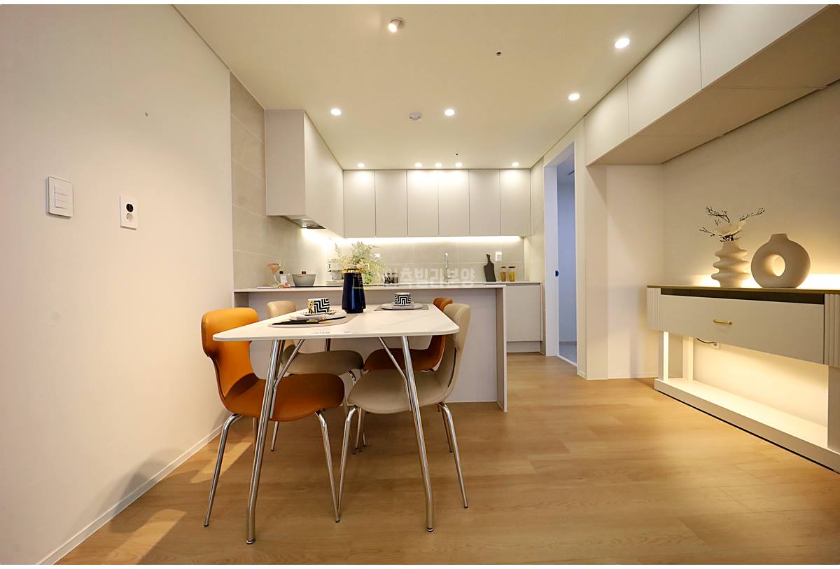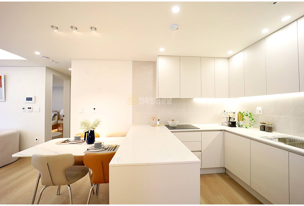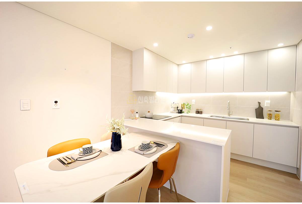 주방은 군더더기 없이 깔끔한 상하부장으로 마감되었으며, 아일랜드 식탁을 보조 조리대로 사용할 수 있습니다. 식탁 배치 공간도 넉넉하게 마련되어 있어 가족이 함께 식사하기 좋습니다.