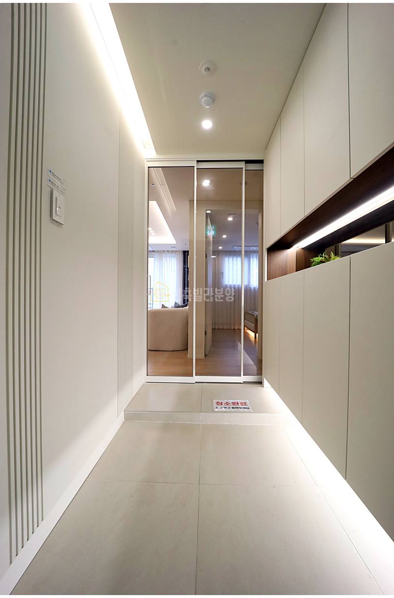 수전이 있어 세탁실로 사용 가능한 별도의 공간과 테라스를 통해 짐 적재하기 용이합니다. 중간 수납형 신발장은 3연동 중문이 설치된 현관을 가득 채웠으며, 일괄소등 스위치도 완비되어 있습니다.