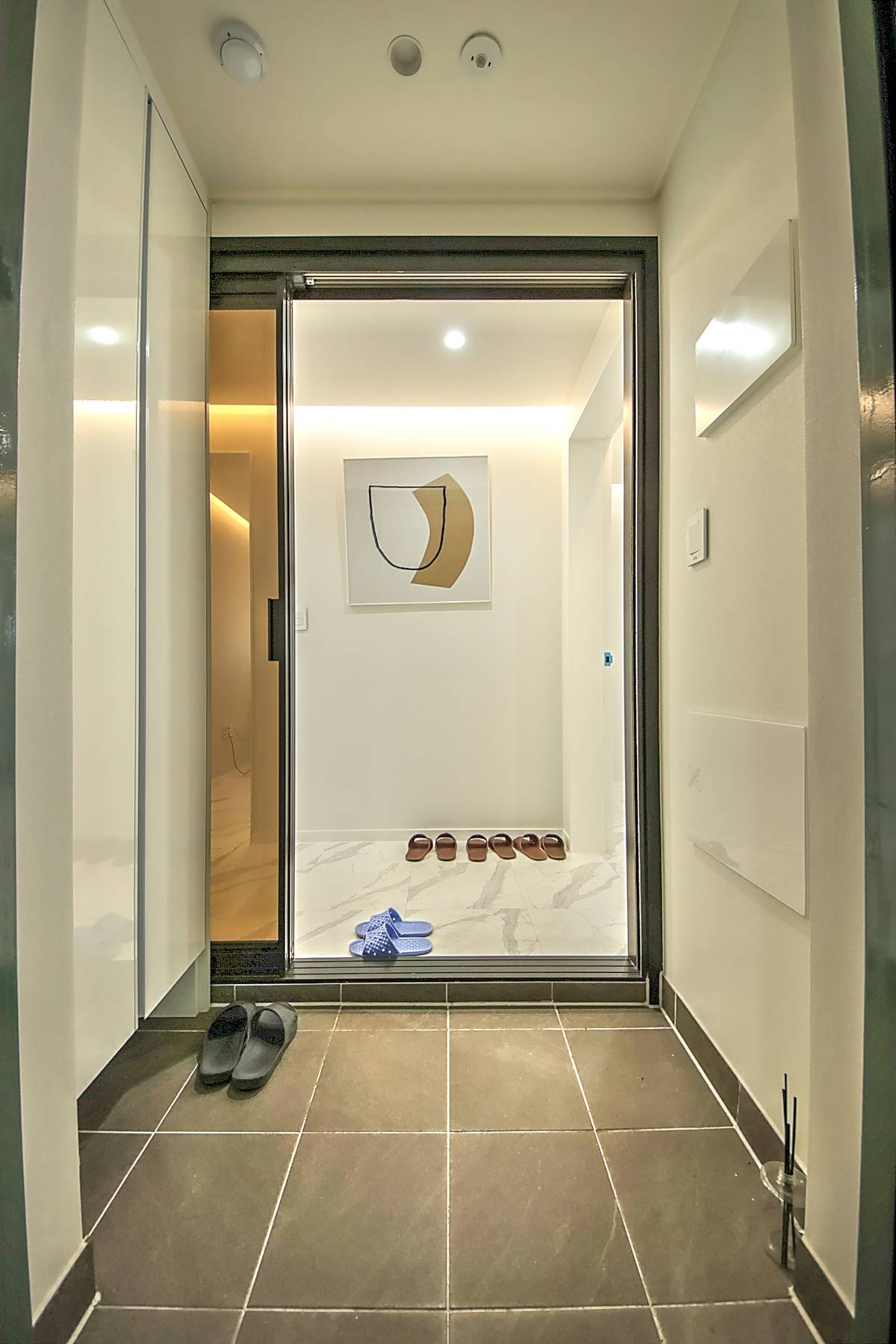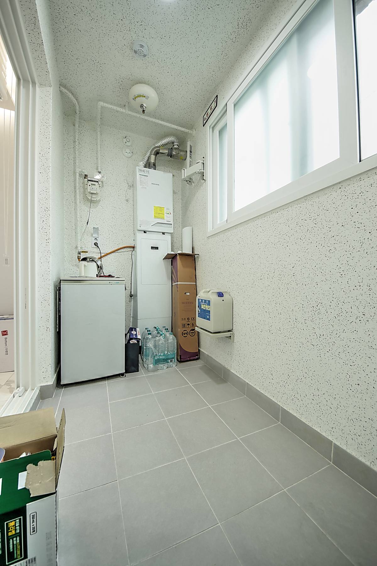 작은방과 연결된 발코니는 공간 폭이 넓게 설계되어 있습니다. 보일러가 설치되어 있으며, 세탁실로 활용하기에 적합합니다. 전실에는 키 큰 신발장이 2칸 마련되어 있고, 띄움 시공으로 자주 신는 신발을 보관할 수 있습니다.