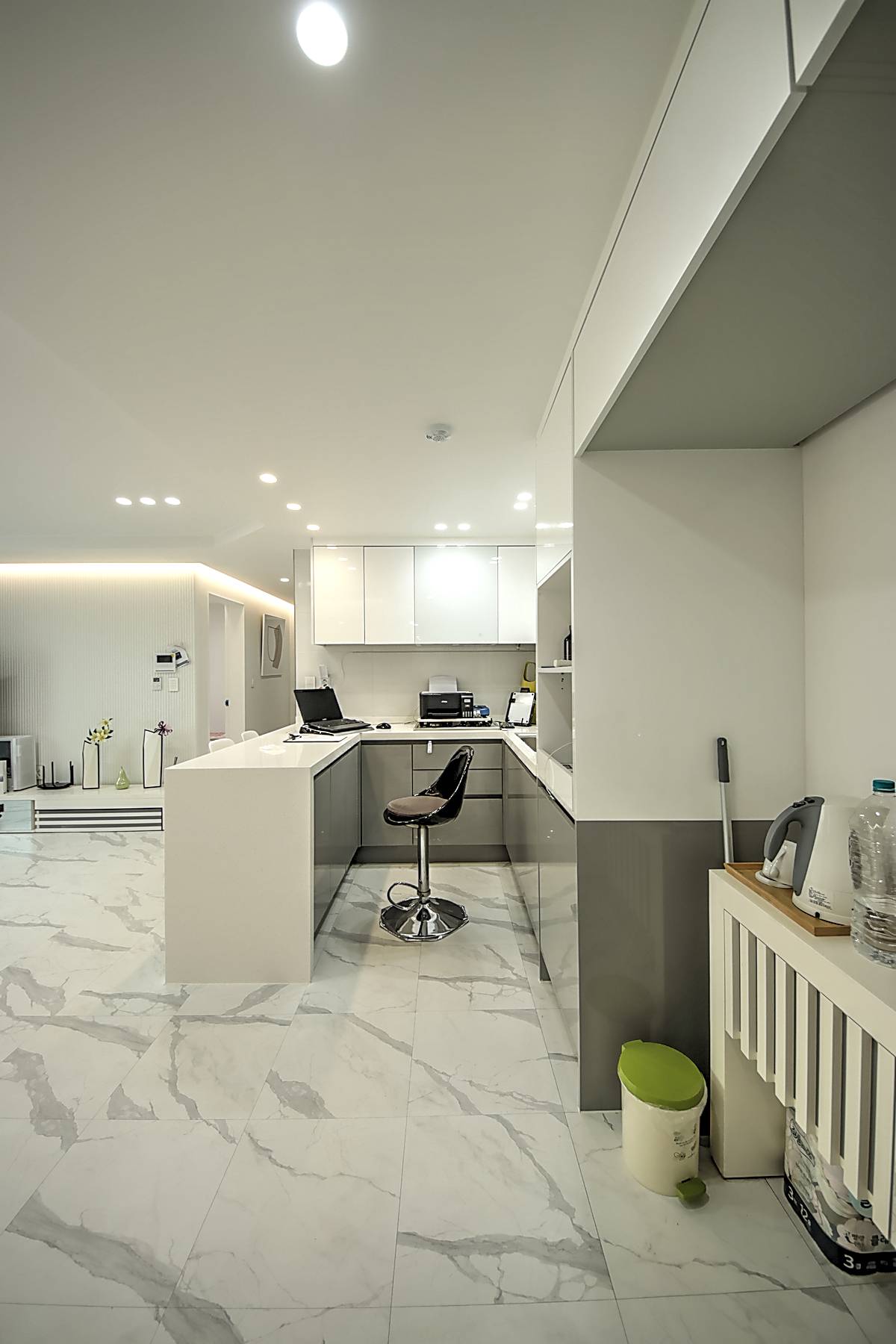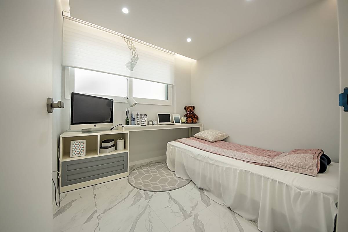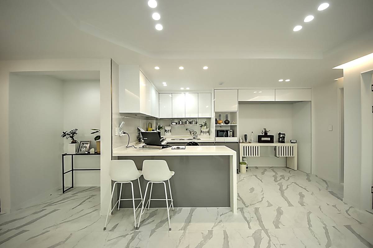 26평 3룸 구조는 화이트톤 인테리어로 깔끔하게 마감되었습니다. 거실 폭이 넓어 소파와 테이블 등 가구를 배치해도 여유로우며, 앞쪽으로 이면도로가 있어 막힘 없는 시야와 훌륭한 채광을 자랑합니다. 바닥재는 대리석 느낌의 마루로 시공되었고, 아트월은 템바보드로 마감해 고급스러운 분위기를 연출합니다.