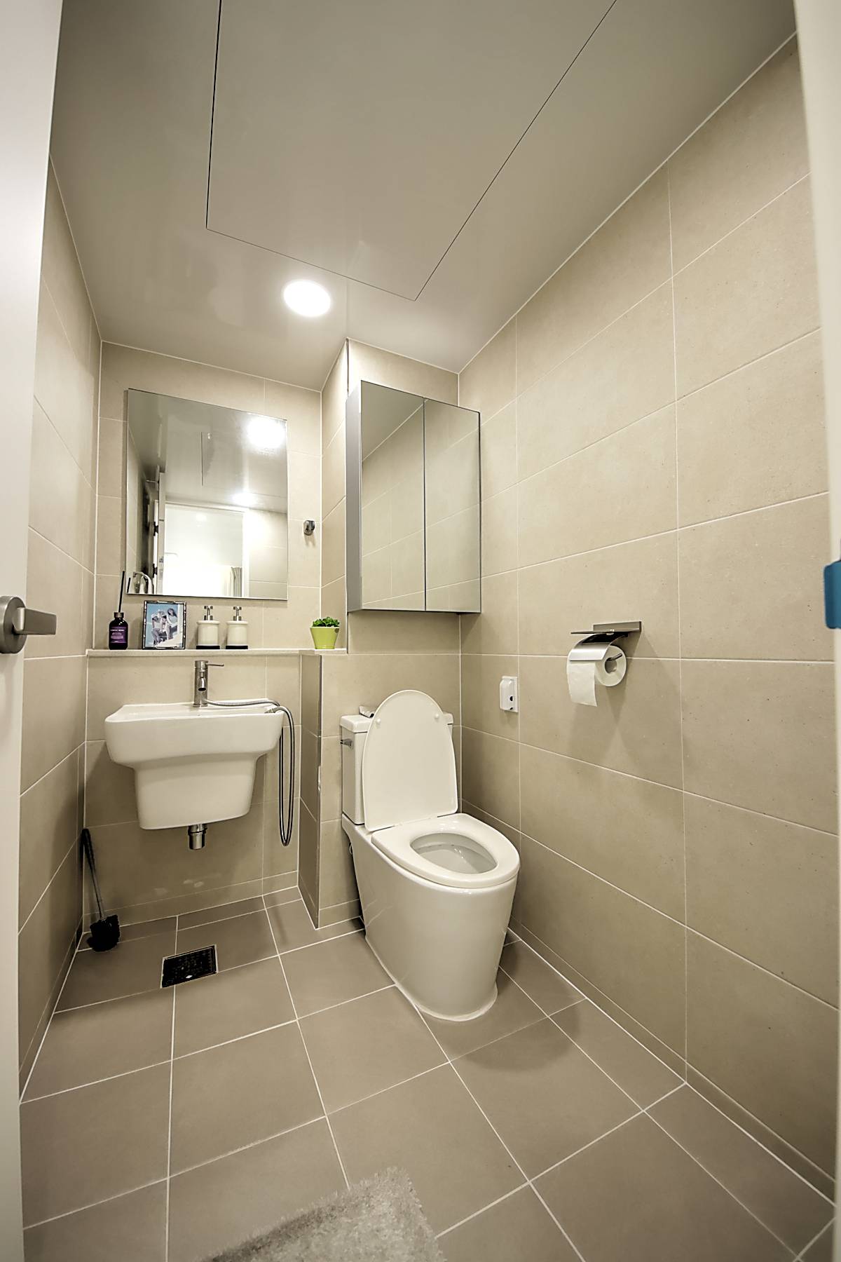 메인 욕실은 샤워기, 세면대, 양변기 순으로 배치되었으며, 슬라이딩 거울 수납장과 젠다이 등 수납 공간이 충분합니다. 바닥은 논슬립 재질로 미끄럼 방지 처리가 되어 있어 안전하게 사용할 수 있습니다. 안방 욕실은 다소 컴팩트하지만 샤워는 충분히 가능한 크기입니다.