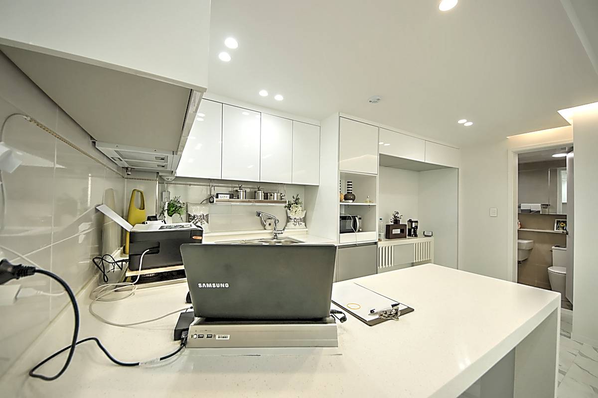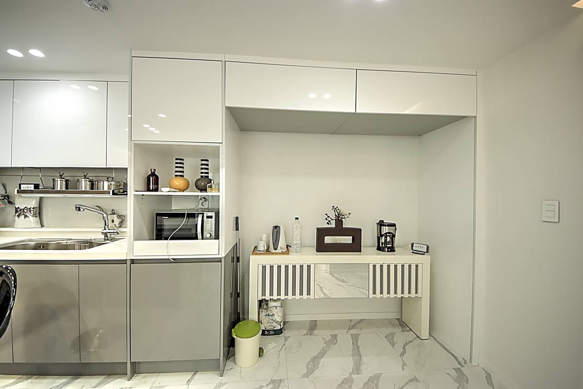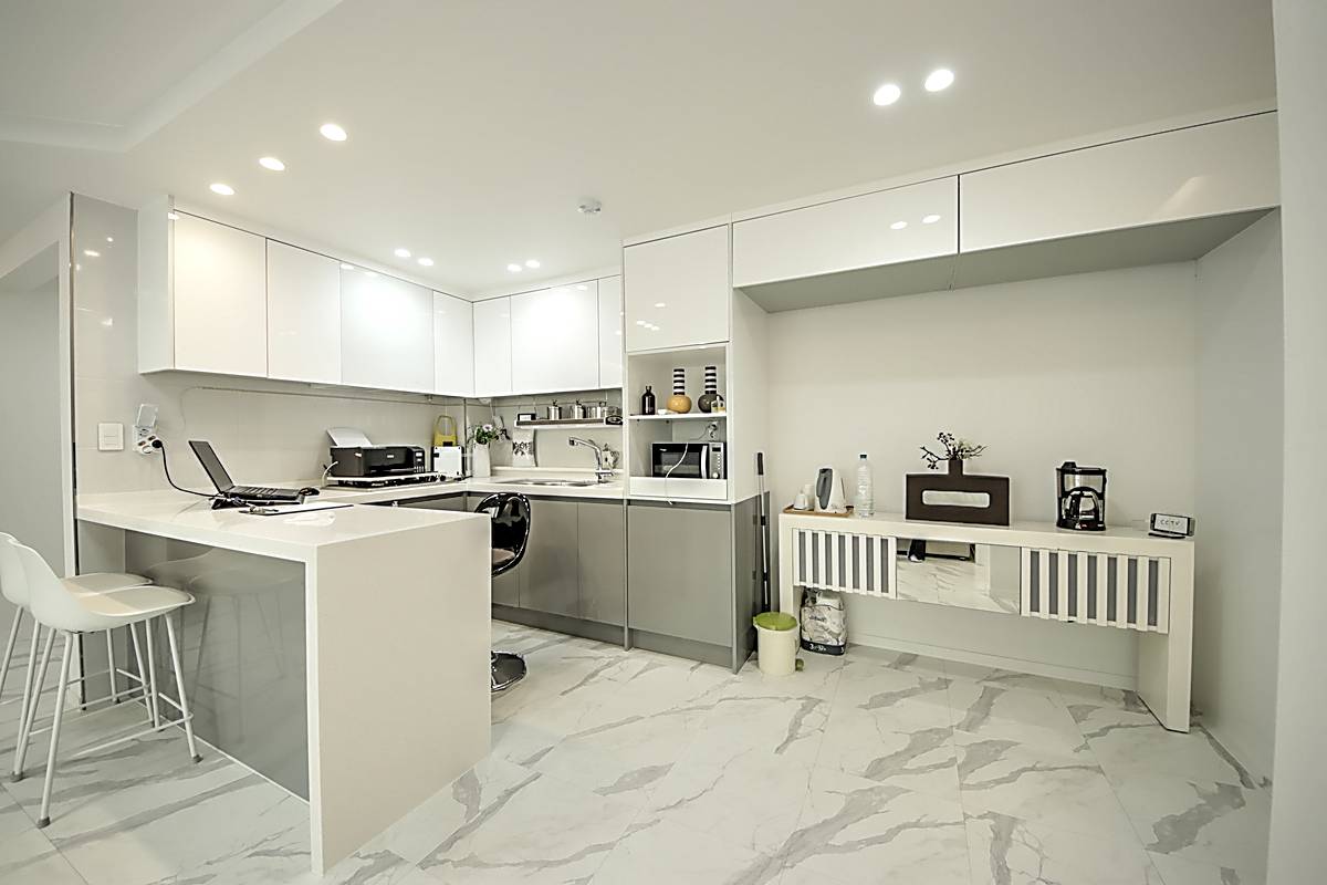 거실 맞은편에 배치된 주방은 조리 동선이 편리한 ㄷ자 구조입니다. 냉장고 공간이 넉넉하게 확보되어 있으며, 상하부 수납장도 풍부하게 마련되어 있습니다. 수납공간과 전자레인지 및 밥솥을 놓을 수 있는 별도 공간도 있어 실용성이 뛰어납니다. 주방 옆쪽으로는 추가 냉장고를 배치하거나 펜트리로 활용할 수 있는 공간이 마련되어 있습니다.