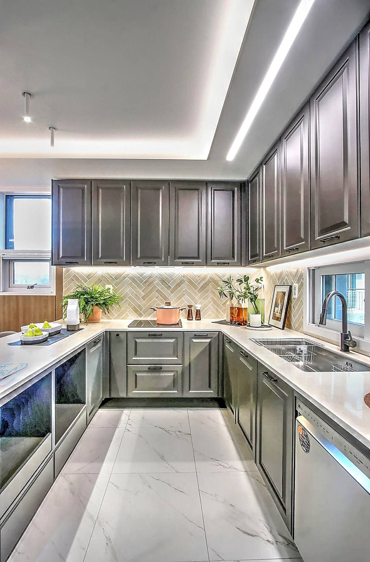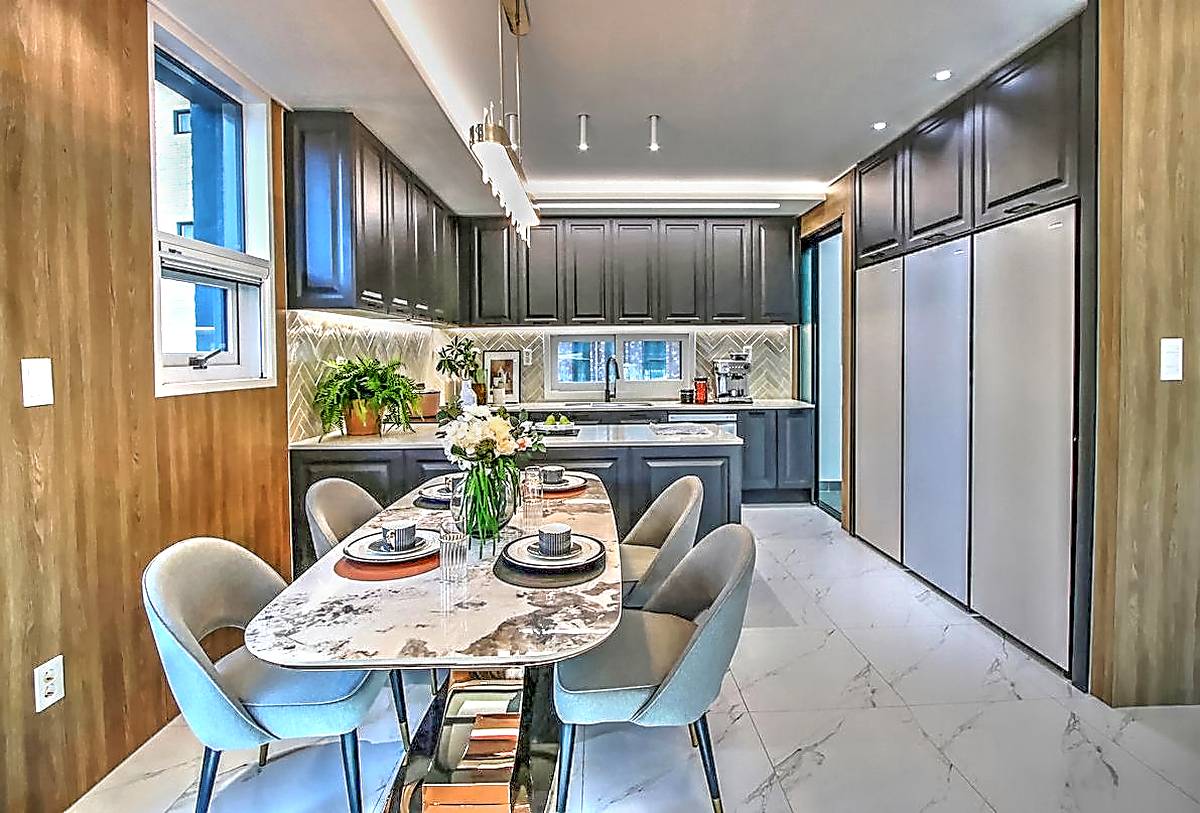 입주민의 편의를 위해 제공되는 기본 옵션 또한 화려합니다. 주방에는 식기세척기를 비롯해 냉장, 냉동, 김치냉장고가 빌트인으로 매립되어 있어 가전 구매 비용을 절감할 수 있습니다. 각 방에는 시스템 에어컨이 설치되어 있으며, 드레스룸과 팬트리 룸, 붙박이장 등 수납공간을 곳곳에 배치하여 공간 활용도를 높였습니다. 안방에 연결된 보조 욕실 덕분에 바쁜 아침 시간에도 가족 간의 동선 겹침 없이 여유로운 준비가 가능합니다.
