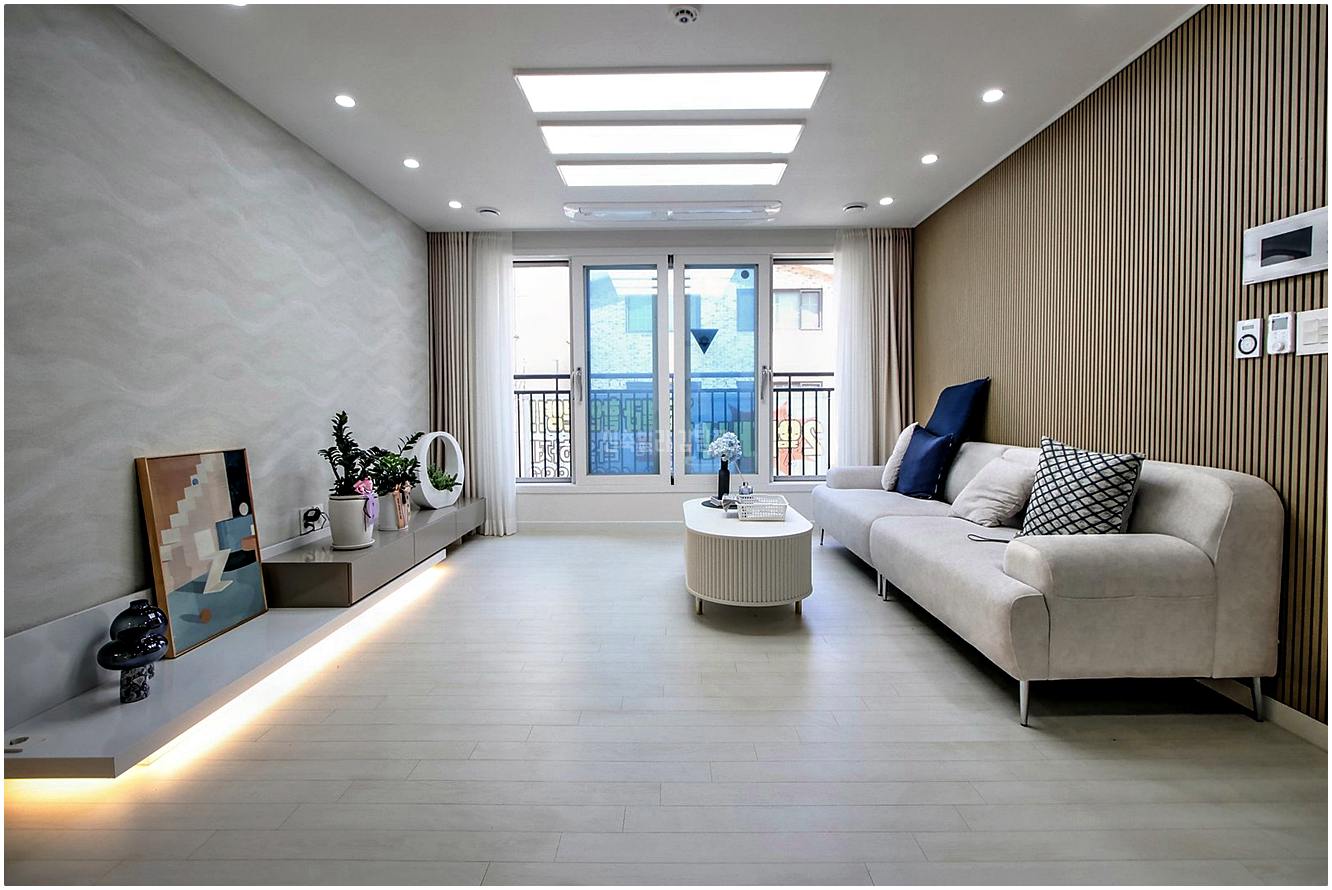 장수동빌라매매 집 안으로 들어서면 가장 먼저 느껴지는 것은 넉넉한 공간감입니다. 3BAY 구조의 정석을 보여주는 거실은 강마루와 세련된 아트월로 마감되어 품격을 더했습니다. 천장에 빌트인된 시스템 에어컨은 거실 공간을 더욱 넓게 활용할 수 있도록 도와주며, 남향 세대의 경우 하루 종일 따사로운 햇살이 거실 깊숙이 스며듭니다.