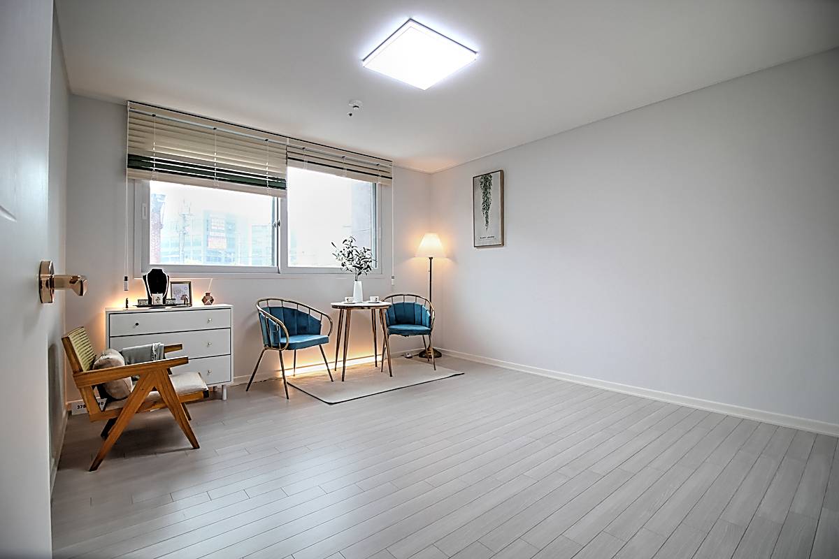 거실 공간은 여유롭습니다. 4인 소파를 놓고도 남을 만큼 넉넉해서, 신혼 초기에는 둘이서 여유롭게, 아이가 태어나면 놀이 공간으로 활용할 수 있겠죠. 천장에 매립된 시스템 에어컨은 여름날의 걱정을 덜어줍니다.