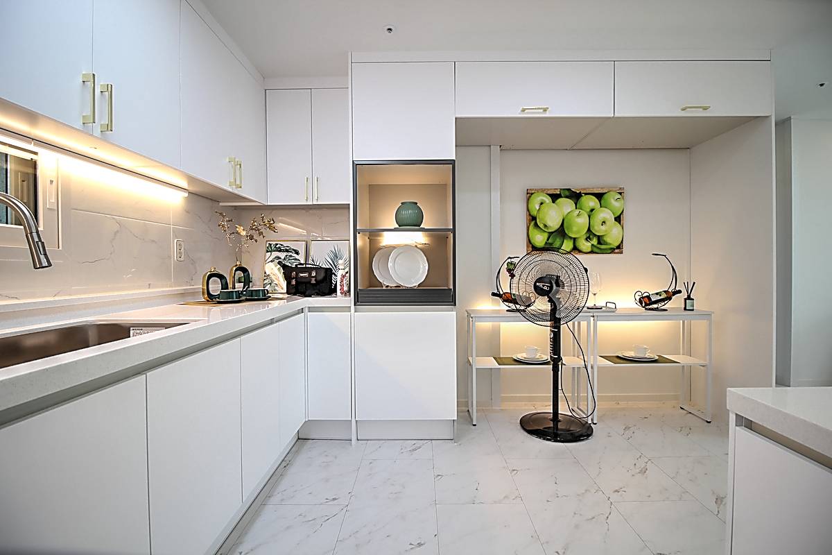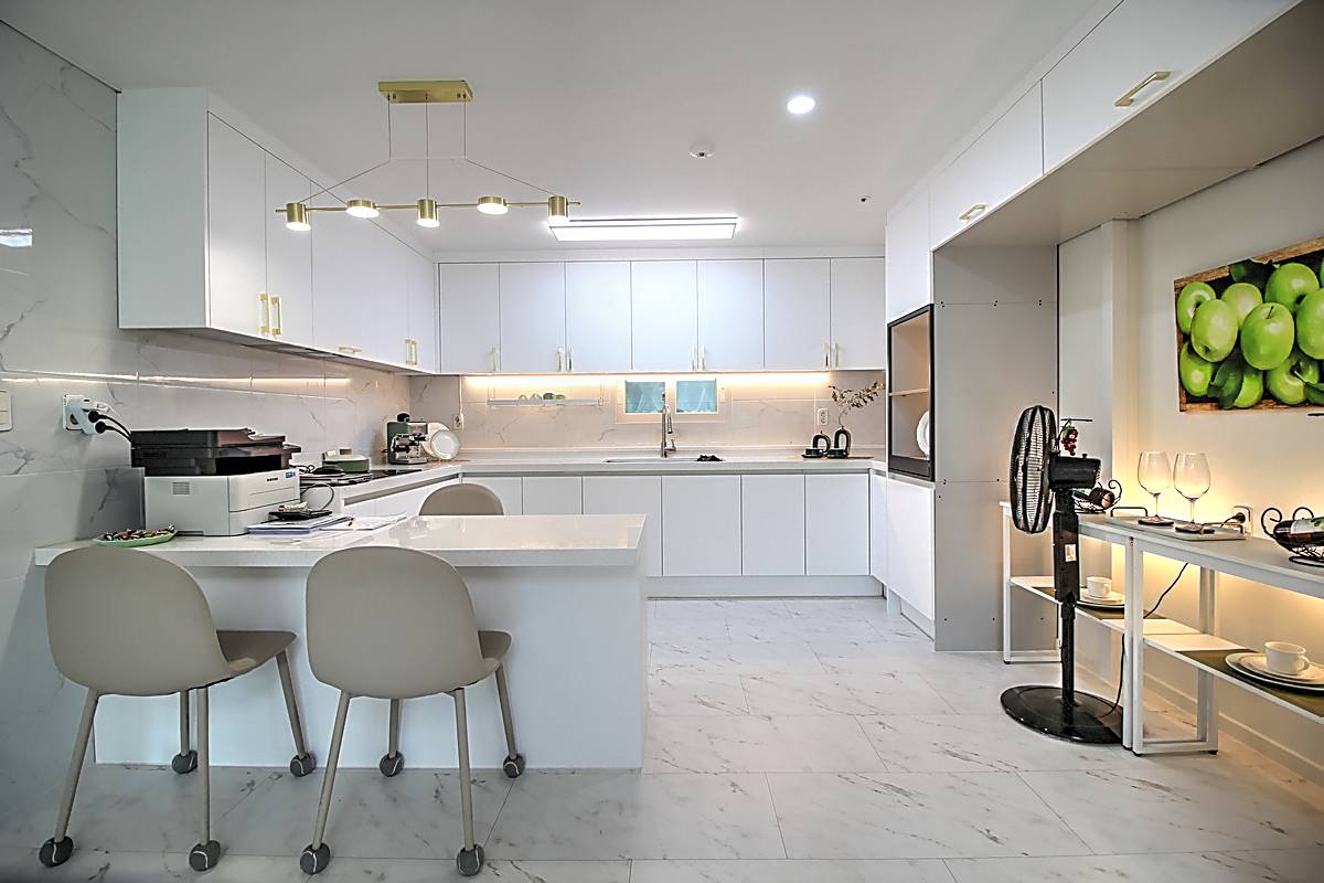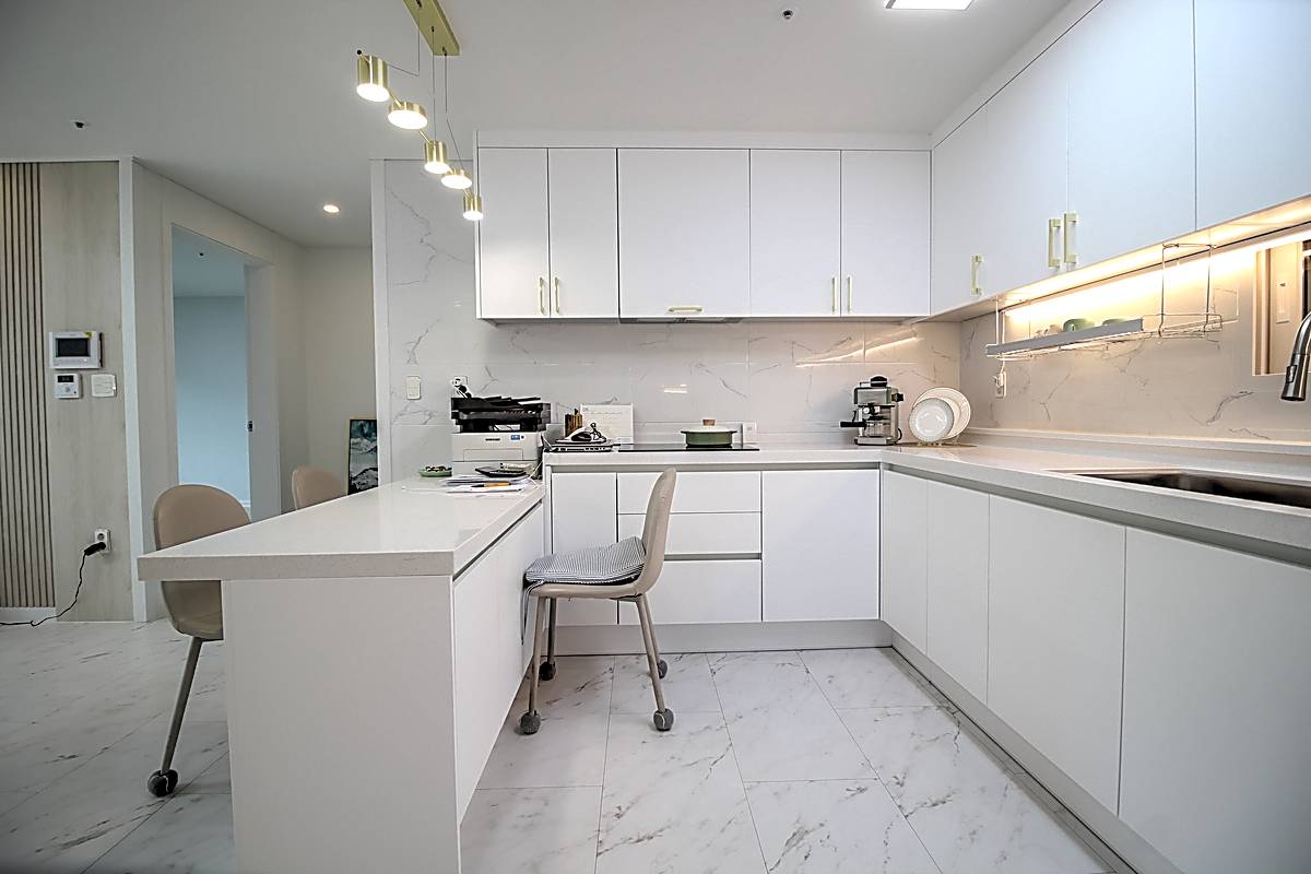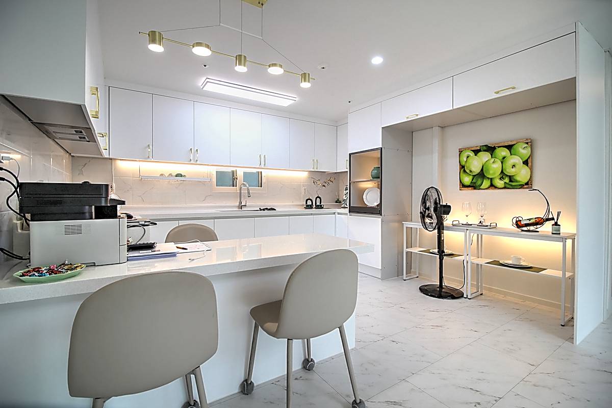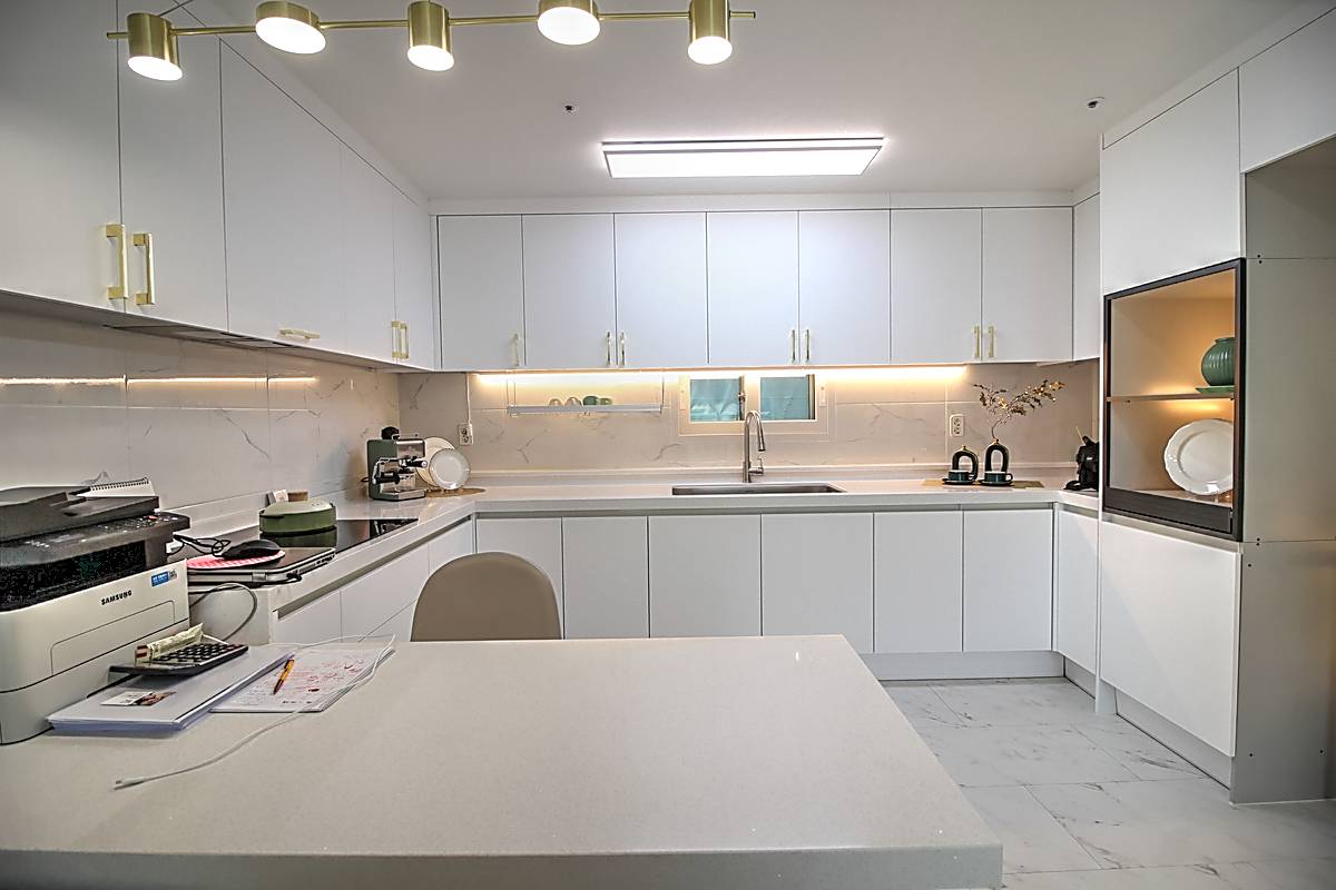 주방을 보는 순간, “여기서 요리하고 싶다”는 생각이 절로 들 거예요. ㄷ자 구조의 화이트 주방은 주부들이 가장 선호하는 동선을 완벽히 구현했습니다. 상·하부장 수납공간이 충분하고, 냉장고 자리도 넉넉하게 확보되어 있어요.