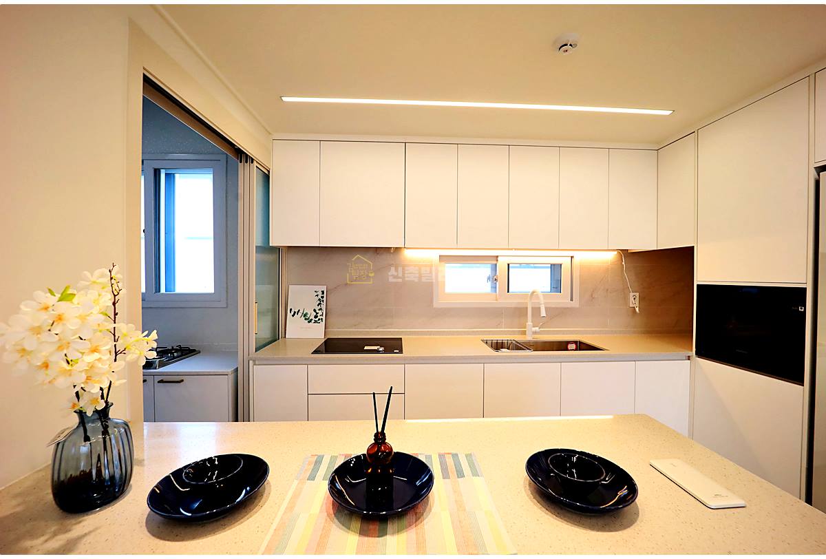 거실과 마주한 11자형 주방은 환기창이 있어 쾌적한 조리 공간을 연출할 수 있습니다. 아일랜드 식탁은 의자를 두어 활용도 높게 사용 가능하며, 비스포크 냉장고, 전기레인지, 광파오븐 등 기본 구성이 탄탄하게 갖춰져 있습니다.