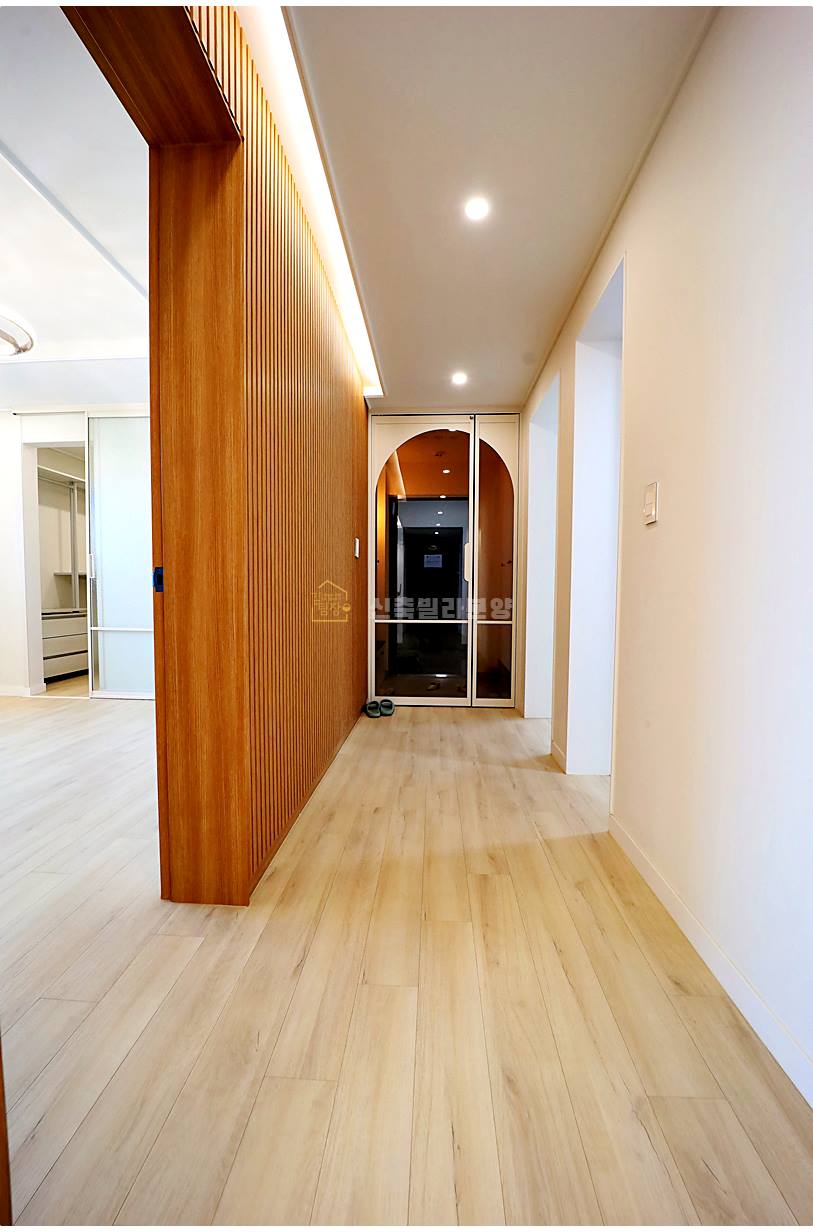 복도를 따라가면 아치형의 중문을 시공한 현관 공간을 만나볼 수 있습니다. 전실에는 길쭉한 신발장을 비롯해 벤치형 수납장까지 넉넉하게 준비되어 있습니다.
