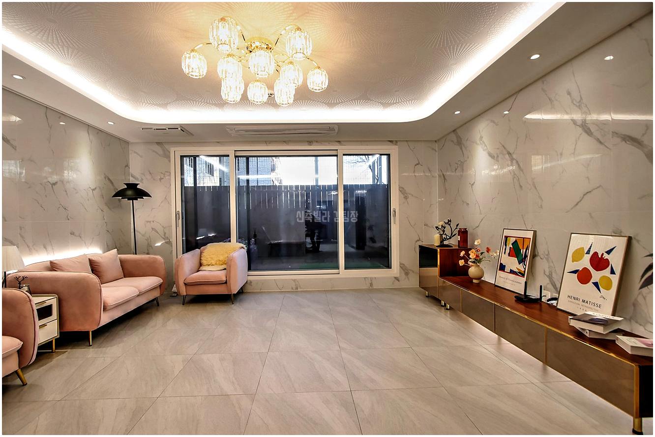 바닥은 고급스러운 타일로 마감되어 있고요. 우물형 천장에 감각적인 메인 조명이 더해져서 집안 분위기가 아주 아늑하면서도 고급져요.