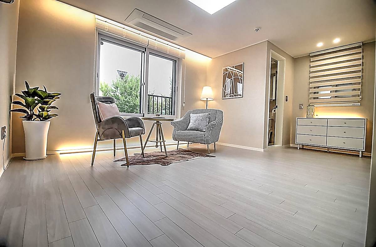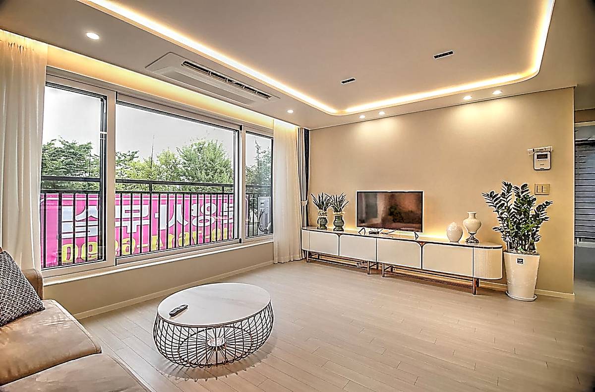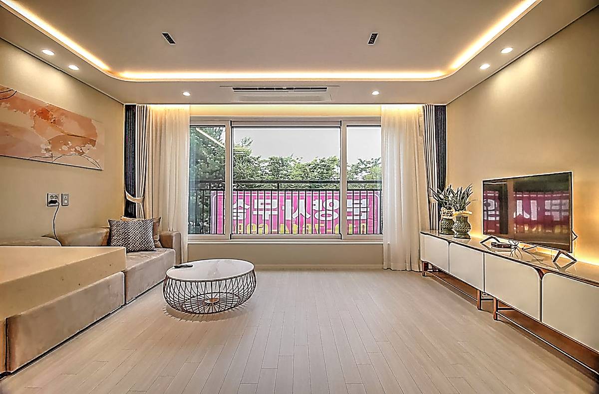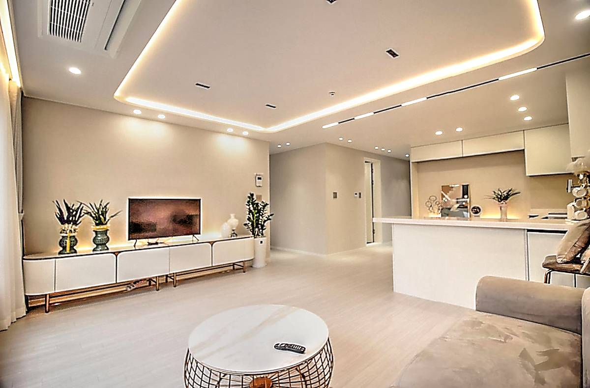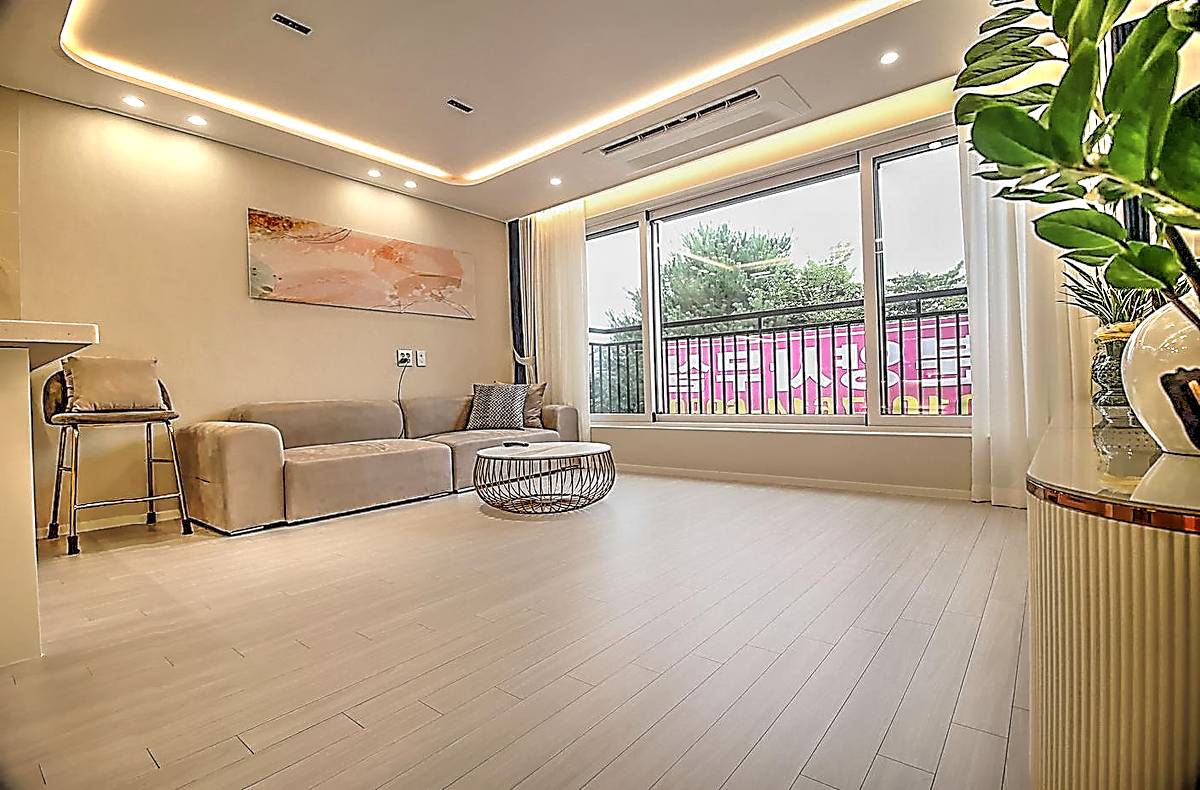 용이동신축빌라 현관을 지나 거실로 들어서면 답답함 없는 시원한 뷰가 맞이합니다. 창밖으로 푸릇한 나무들이 보이는 ‘숲세권’ 조망권을 확보하여 도심 속에서도 자연의 여유를 느낄 수 있습니다. 우물형 천장에 시공된 간접 조명은 저녁 시간, 집안을 더욱 아늑하고 감성적인 무드로 바꿔줍니다.