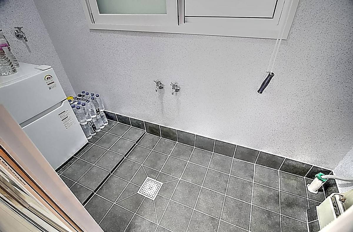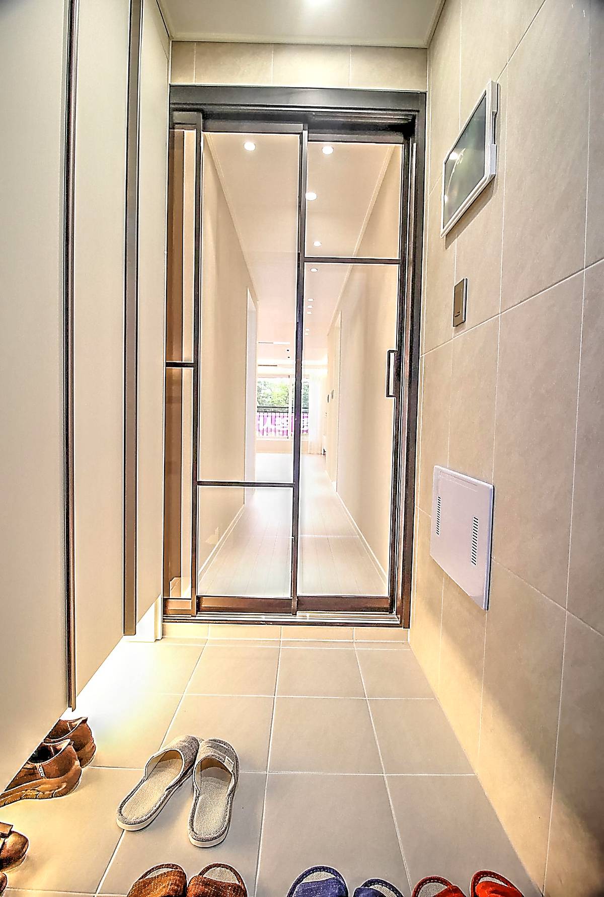 세탁실로 활용 가능한 다용도실은 단차 시공을 통해 물 사용 구역과 건식 구역을 센스 있게 분리했습니다. 전실에는 3연동 슬라이딩 중문과 키 높이 신발장이 설치되어 있어 단열과 소음 차단, 수납까지 꼼꼼하게 챙긴 모습입니다.