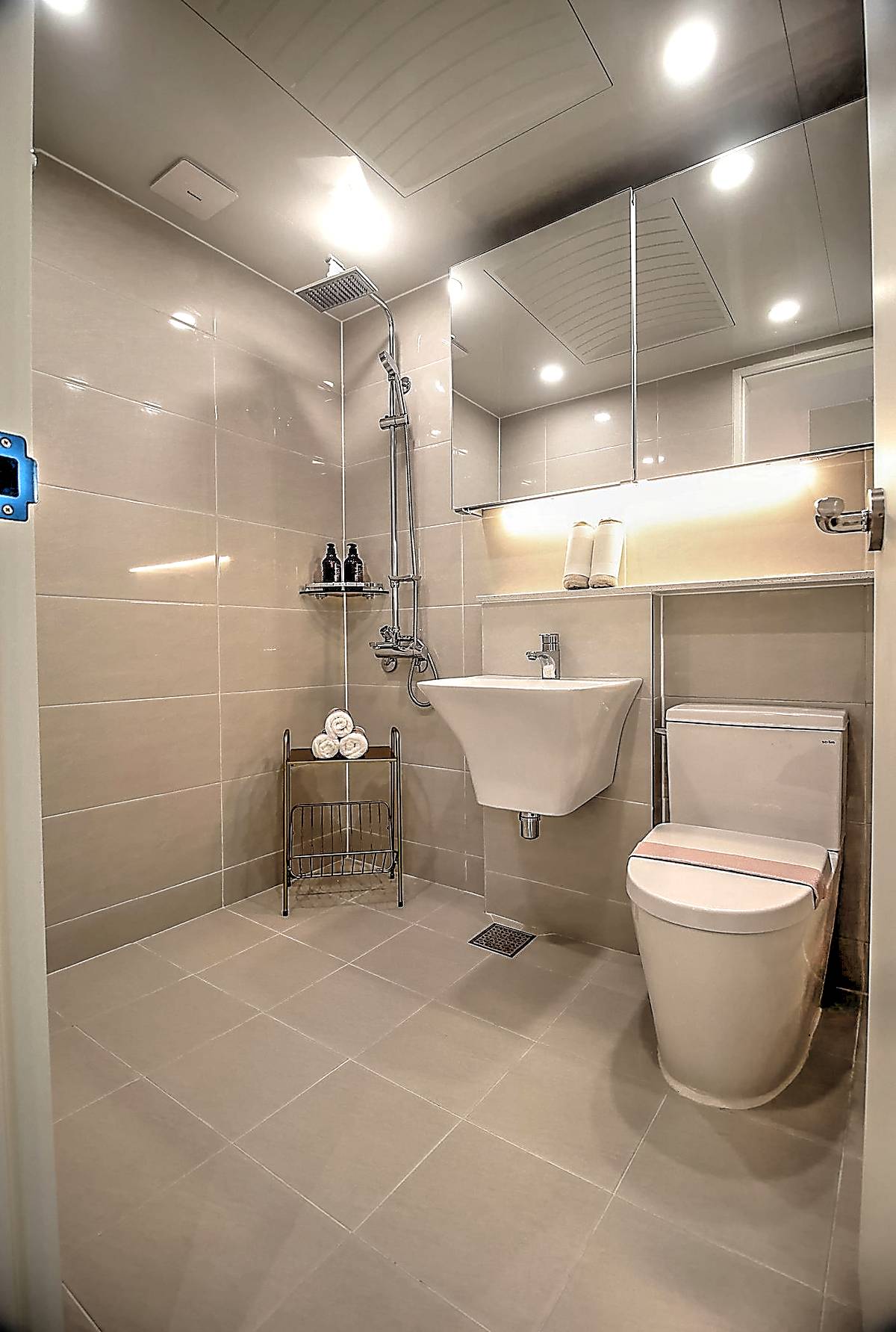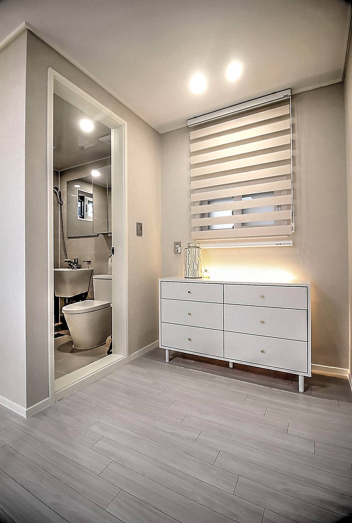 안방은 킹사이즈 침대를 놓고도 여유로운 공간감을 자랑합니다. 안방 안쪽의 자투리 공간은 파우더룸이나 시스템장을 설치해 드레스룸으로 활용하기에 제격입니다. 욕실은 습기에 강한 돔 천장 시공과 해바라기 샤워기, 넉넉한 수납장으로 실용성을 극대화했습니다. 다만, 안방에 위치한 서브 욕실의 샤워 공간은 다소 아담한 편이니 참고하시면 좋겠습니다.