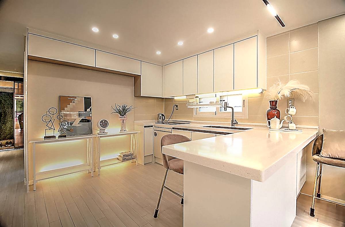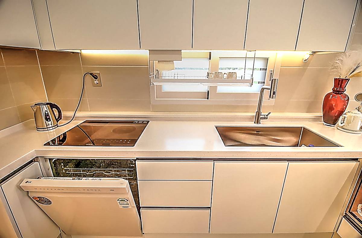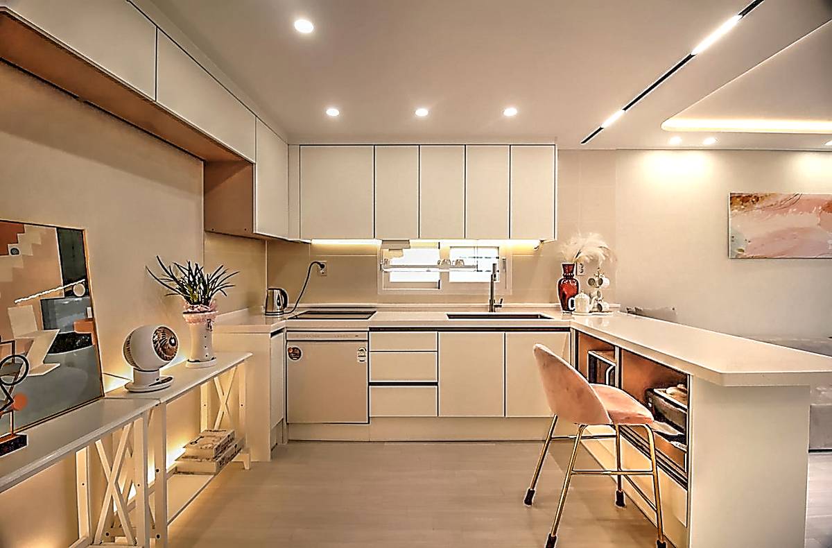 특히 주방은 요리하는 사람의 동선을 가장 효율적으로 고려한 ‘ㄷ’자형 구조와 아일랜드 식탁이 배치되어 있습니다. 여기에 풀옵션 인테리어의 정점을 찍는 식기세척기와 전기 인덕션이 기본으로 제공되어 가전 구매 비용을 절감할 수 있습니다. 환기창이 별도로 나 있어 요리 후 냄새 걱정도 덜었습니다.