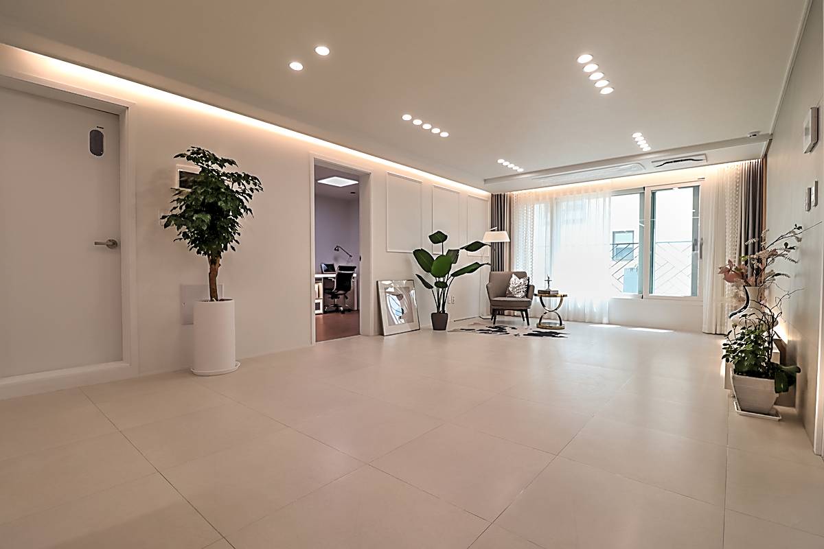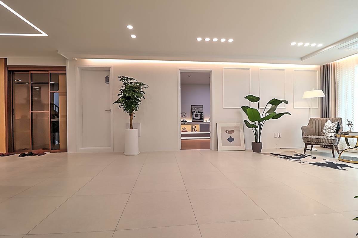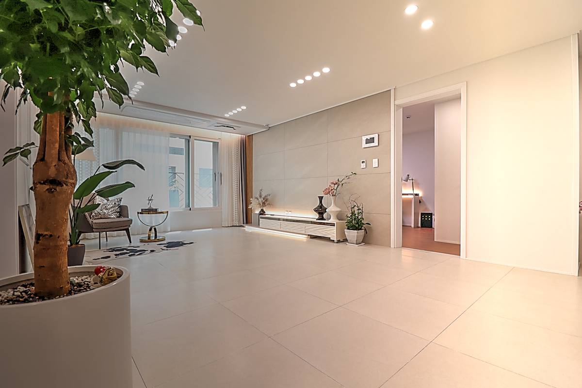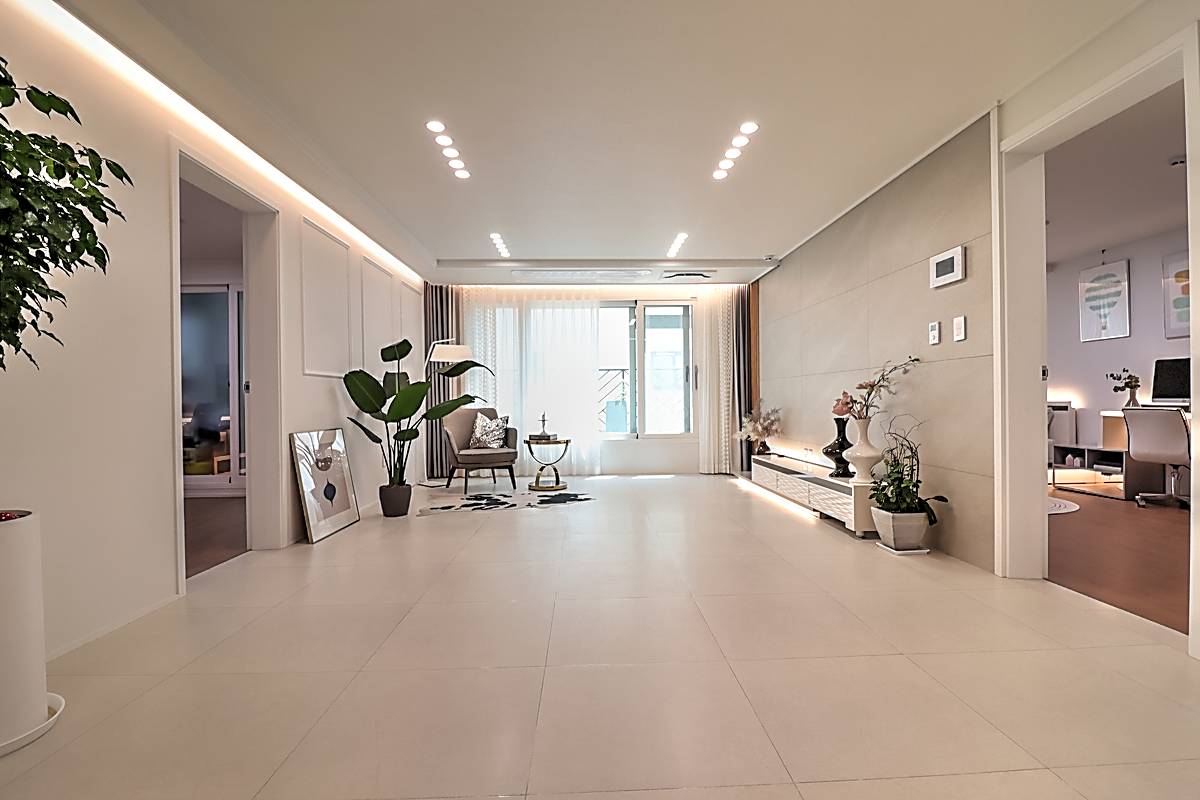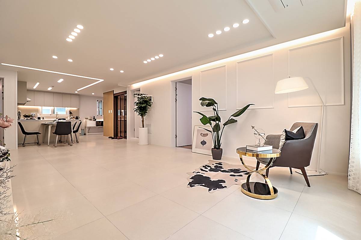 매송면신축빌라 기본 3룸 타입은 30평 면적으로 거실과 주방, 세 개의 침실이 넉넉하게 배치되어 있습니다. 화이트톤 타일로 마감된 거실은 고급스러운 분위기를 자아내며, 소파와 TV 배치 공간이 충분히 확보되어 있습니다. 시스템 에어컨이 기본 옵션으로 설치되어 사계절 쾌적함을 유지합니다.