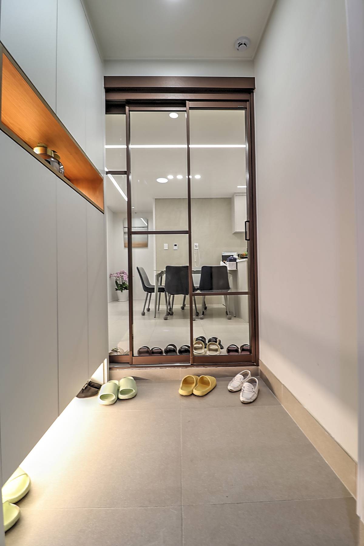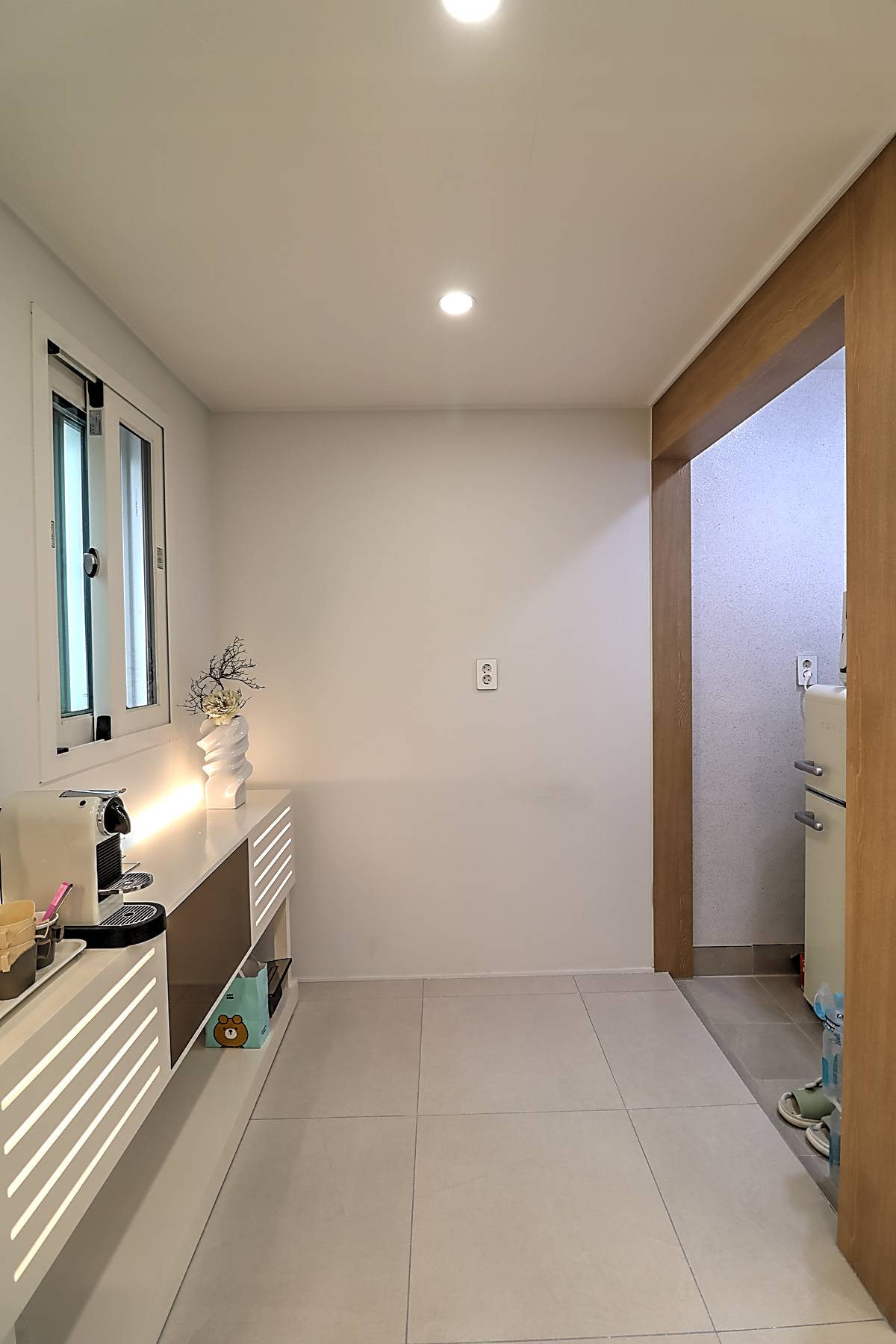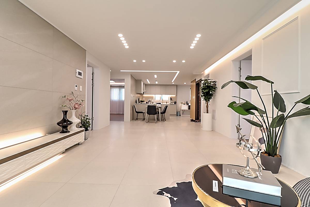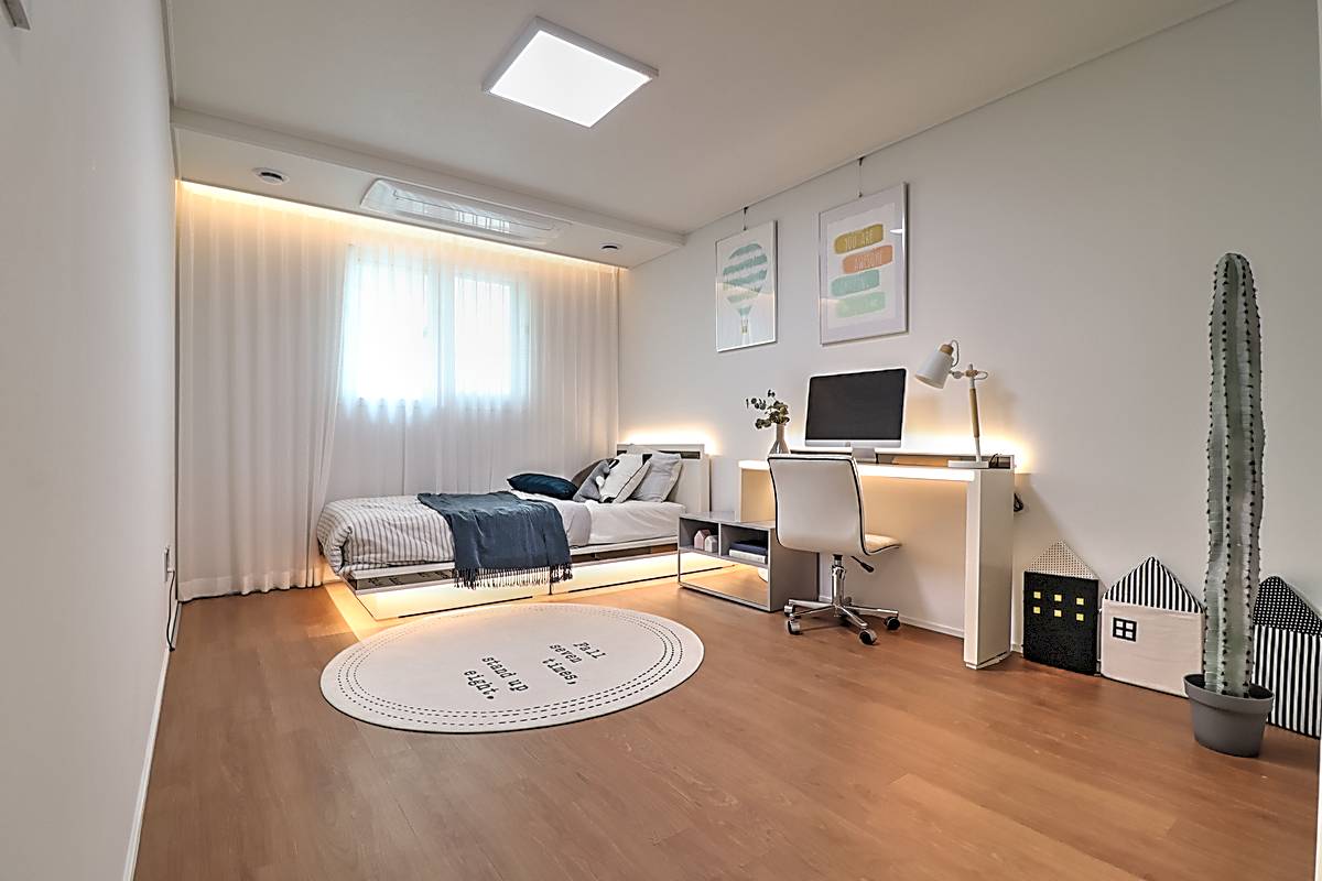 매송면신축빌라 기본 3룸 타입은 30평 면적으로 거실과 주방, 세 개의 침실이 넉넉하게 배치되어 있습니다. 화이트톤 타일로 마감된 거실은 고급스러운 분위기를 자아내며, 소파와 TV 배치 공간이 충분히 확보되어 있습니다. 시스템 에어컨이 기본 옵션으로 설치되어 사계절 쾌적함을 유지합니다.