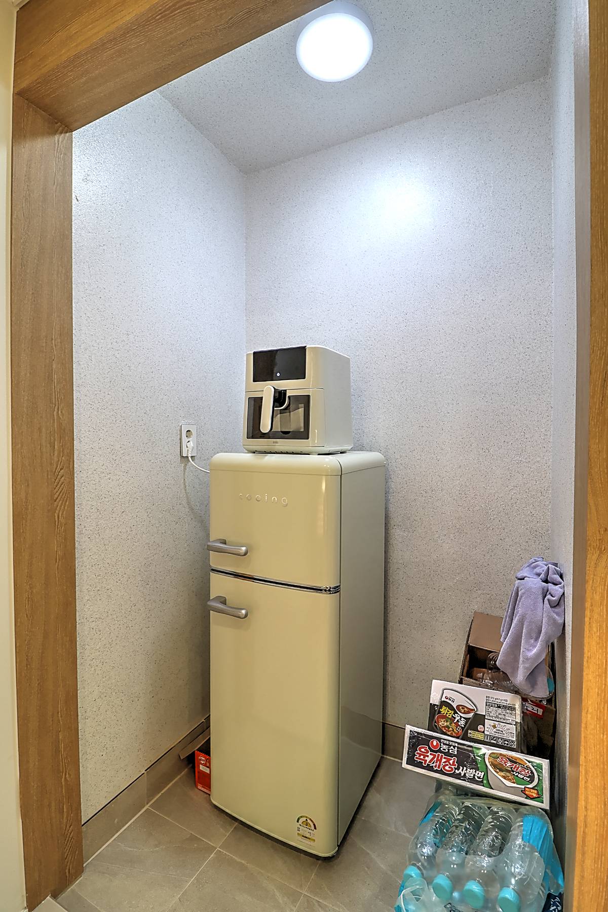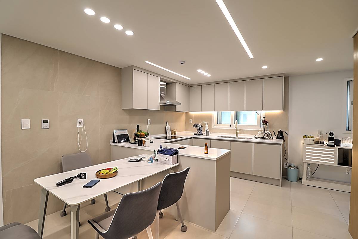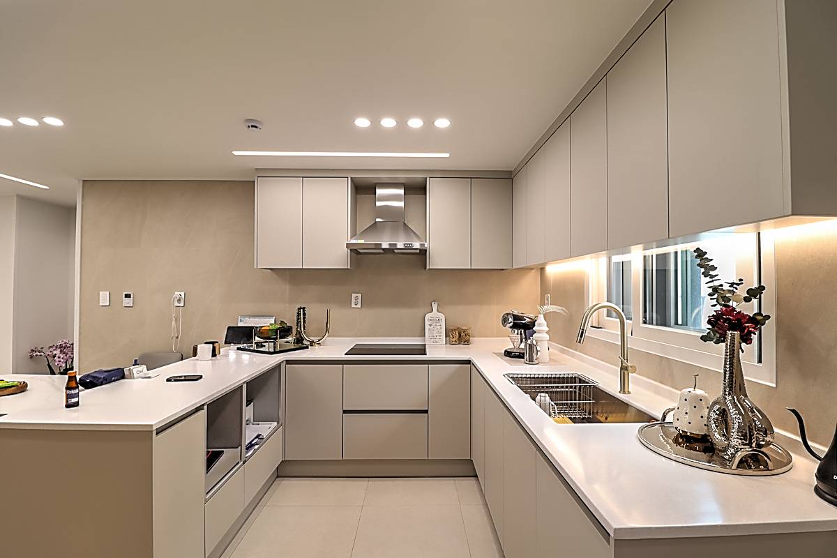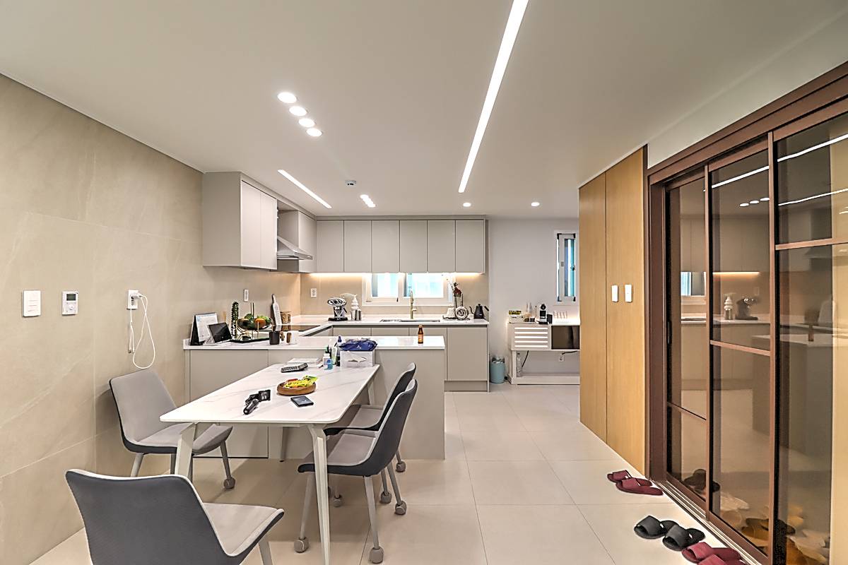 주방은 디귿자 구조로 공간 활용도가 뛰어나며, 안쪽으로 냉장고 배치 공간과 다용도실이 함께 마련되어 있습니다. 주방 앞쪽으로 식탁을 추가 배치해도 여유로운 동선이 확보됩니다. 상하부 수납공간이 충분하며, 환기창이 있어 조리 시 냄새 걱정을 덜 수 있습니다.