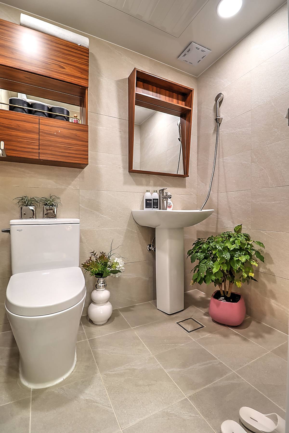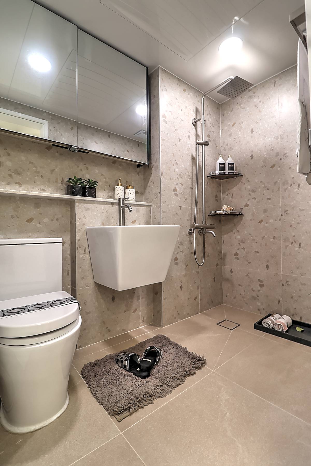 두 개의 욕실 모두 사용하기 좋은 크기로 설계되었으며, 깔끔한 타일 마감으로 호불호가 적습니다. 발코니에는 창문이 있어 어둡지 않고 환기도 원활합니다. 현관 전실에는 중문, 신발장, 일괄소등 스위치가 기본 설치되어 있으며, 엘리베이터와 CCTV도 완비되어 있습니다.