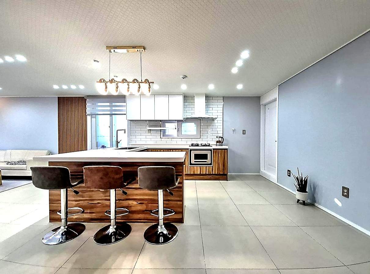 단순히 예쁜 주방이 아닙니다. ‘ㄷ’자형 구조에 아일랜드 식탁이 일체형으로 되어 있어 요리 후 바로 식사가 가능하며, 동선 낭비가 제로에 가깝습니다. 무엇보다 냉장고 2대 자리가 완벽하게 확보되어 있고, 환기창이 별도로 있어 생선 구이 냄새 걱정을 덜어줍니다.