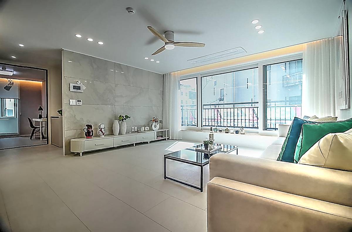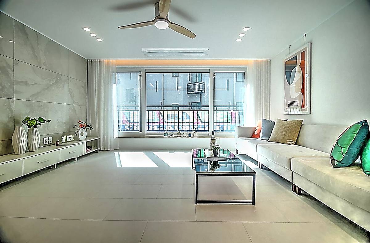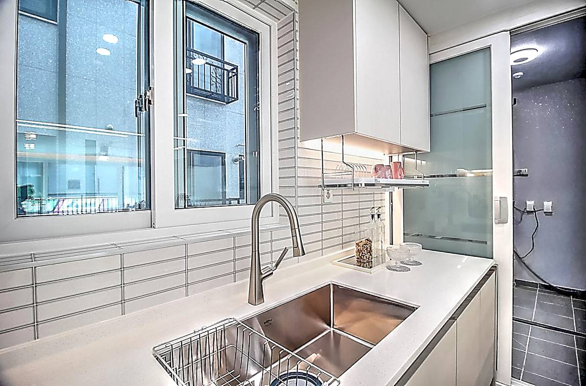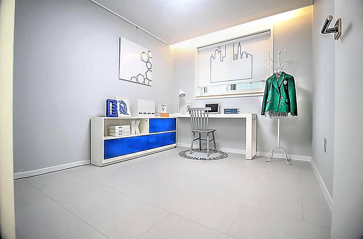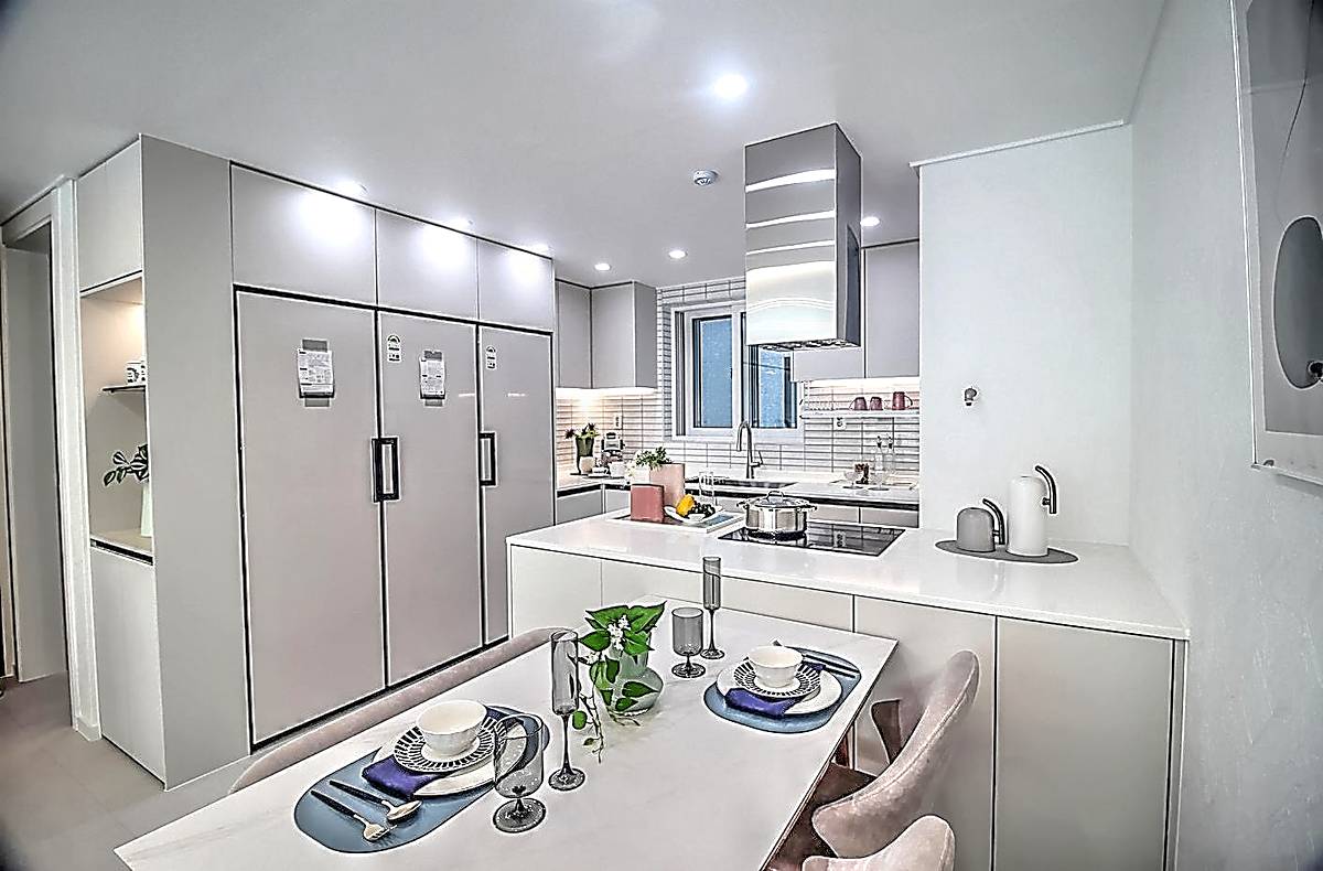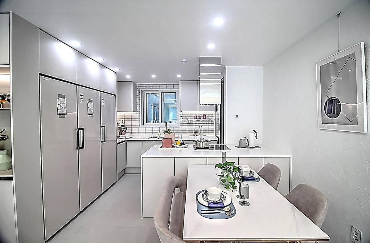 주방은 화이트톤 11자 배열로 동선이 깔끔합니다. 전기레인지는 물론 보조 조리대까지 갖춰져 있어 명절 음식 준비나 홈파티 때 진가를 발휘하겠네요. 거실과 맞통풍이 가능한 구조라 환기 걱정도 덜 수 있습니다.